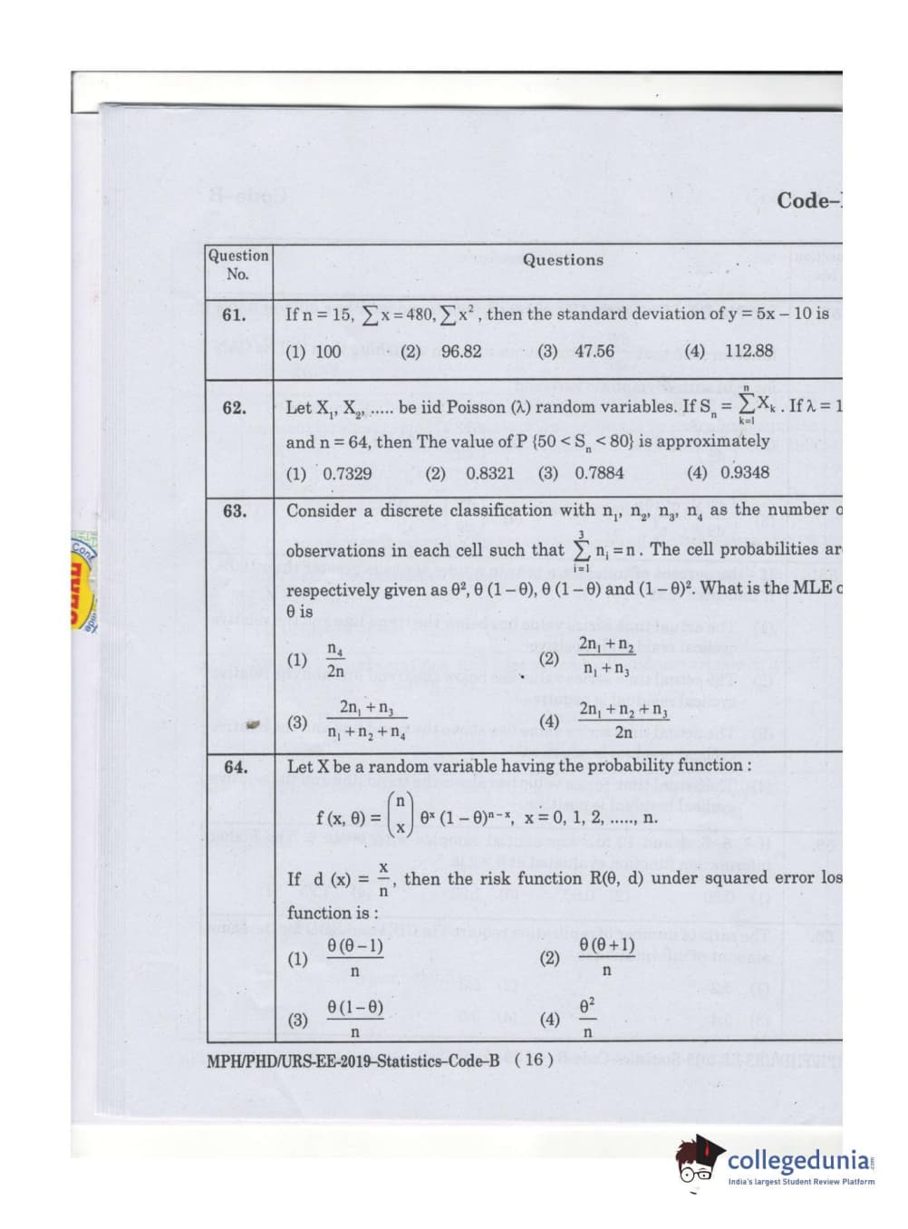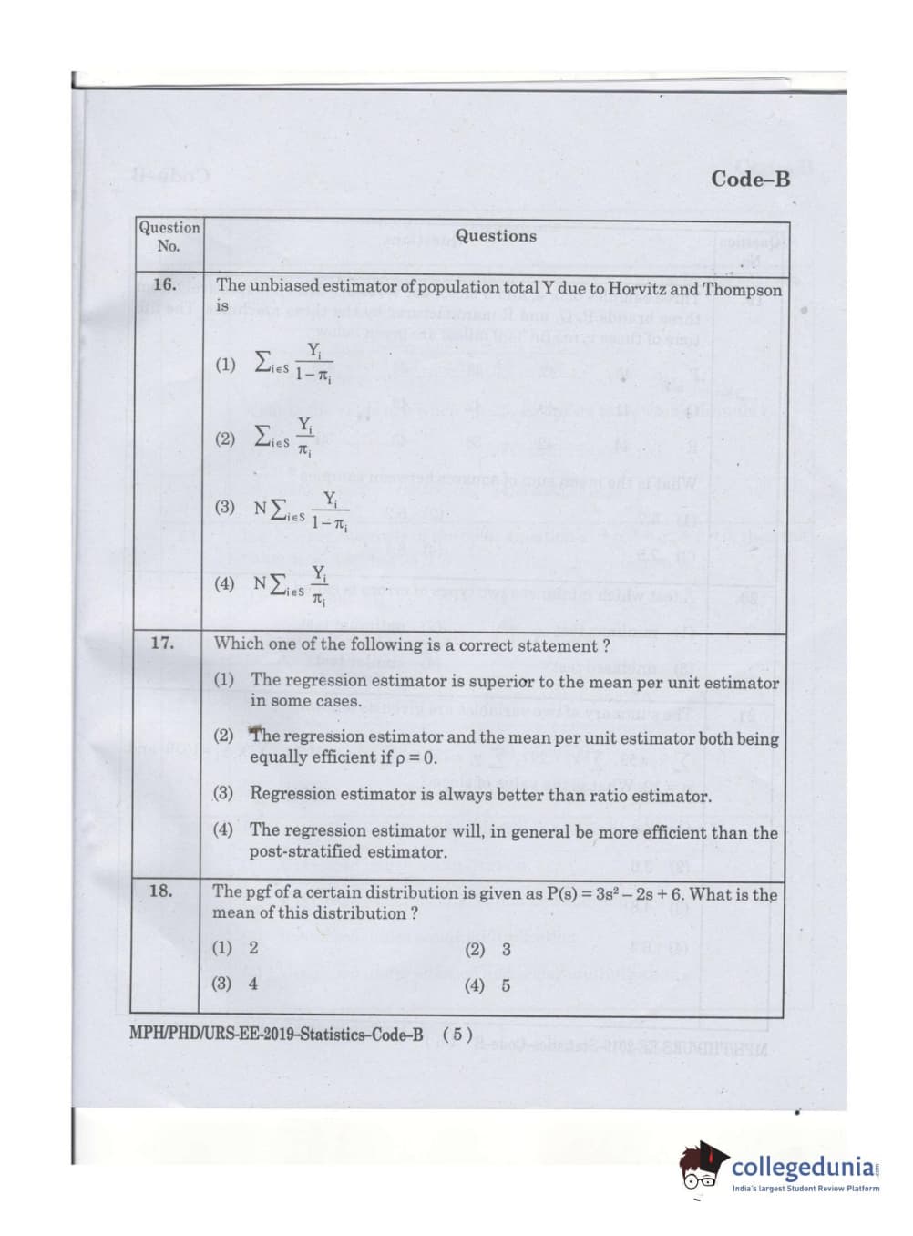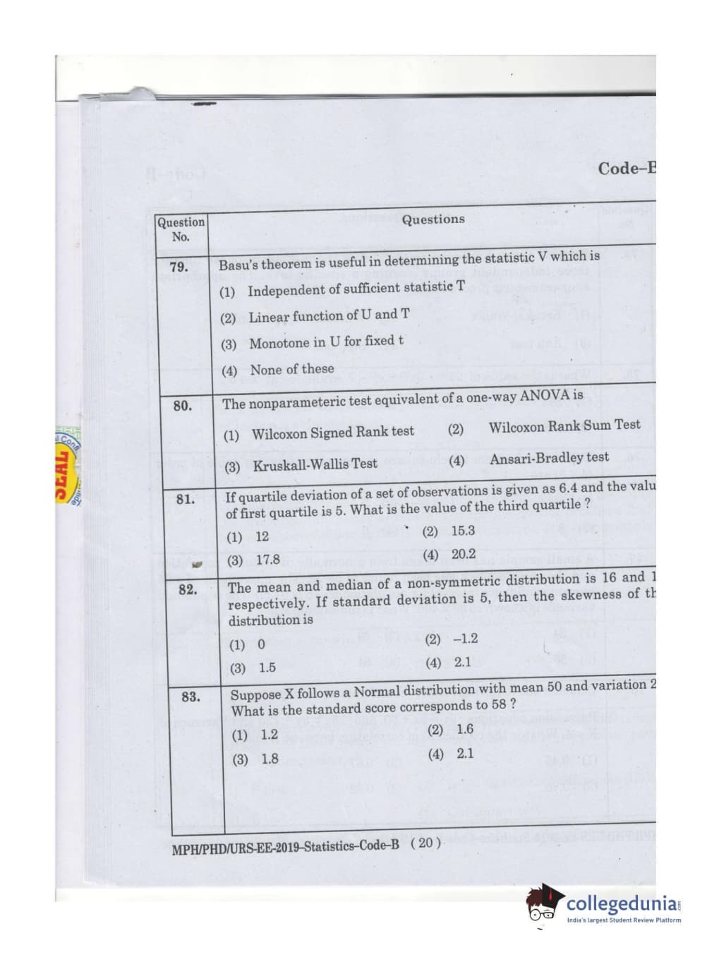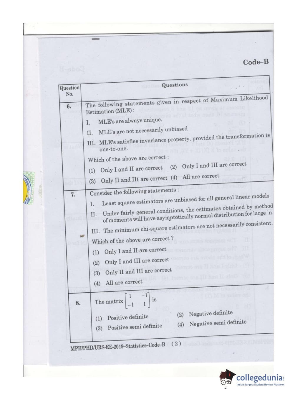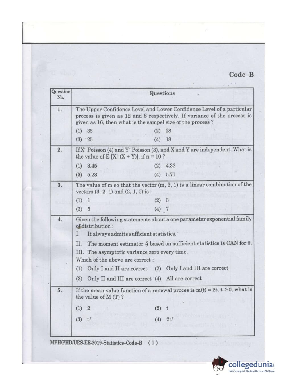 MDUCEE 2019 Ph.D./M.Phil./URS Statistcs Set B Question Paper with Answer Key PDFs