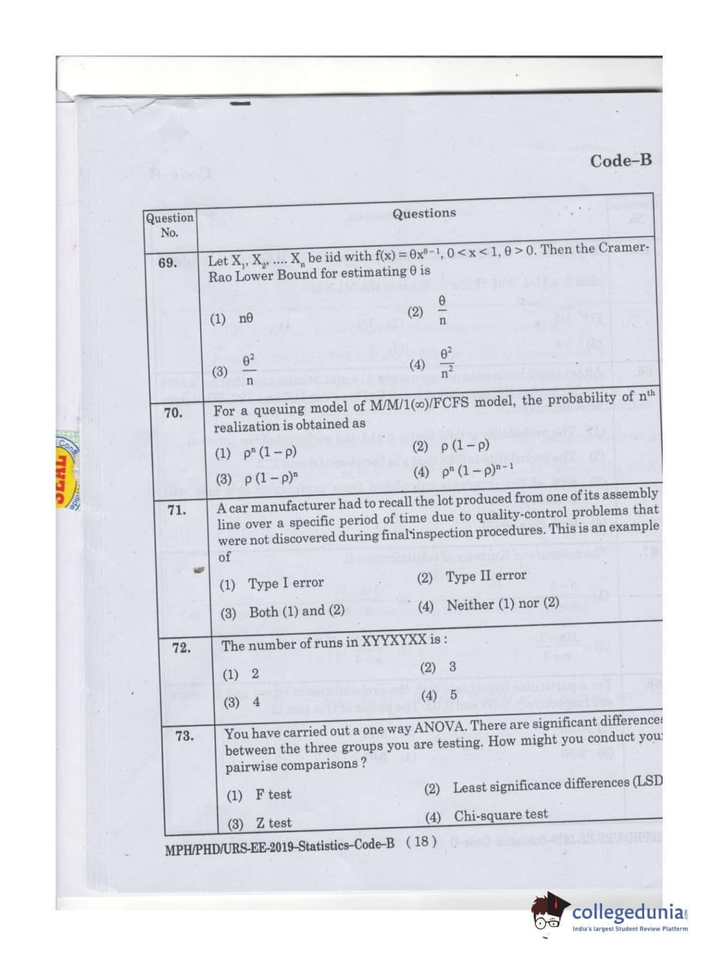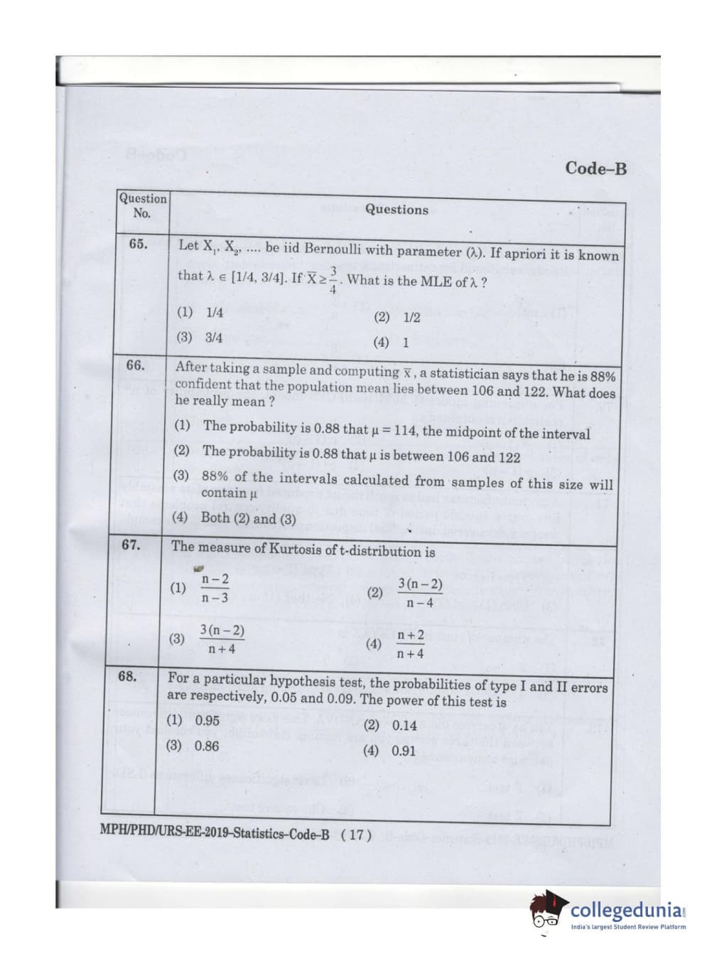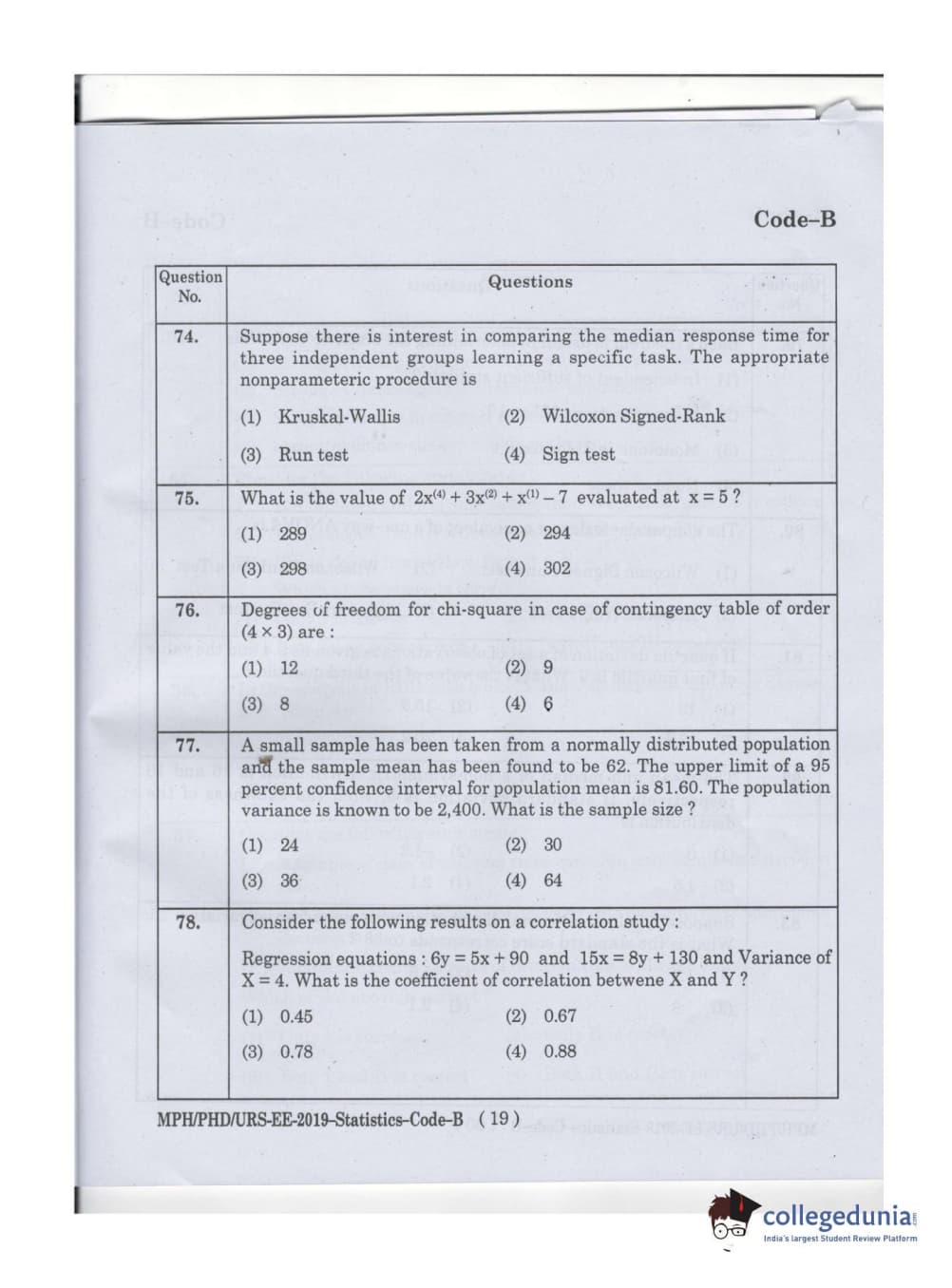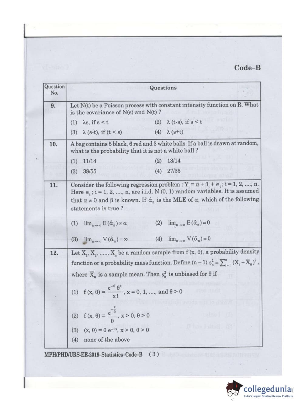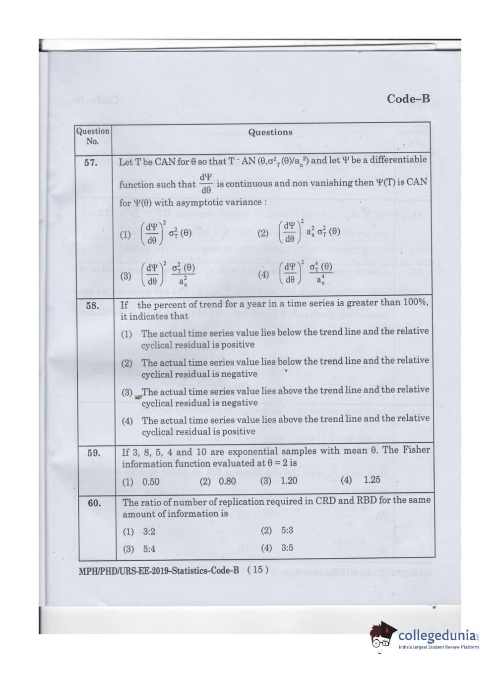 MDUCEE 2019 Ph.D./M.Phil./URS Statistcs Set B Question Paper with Answer Key PDFs