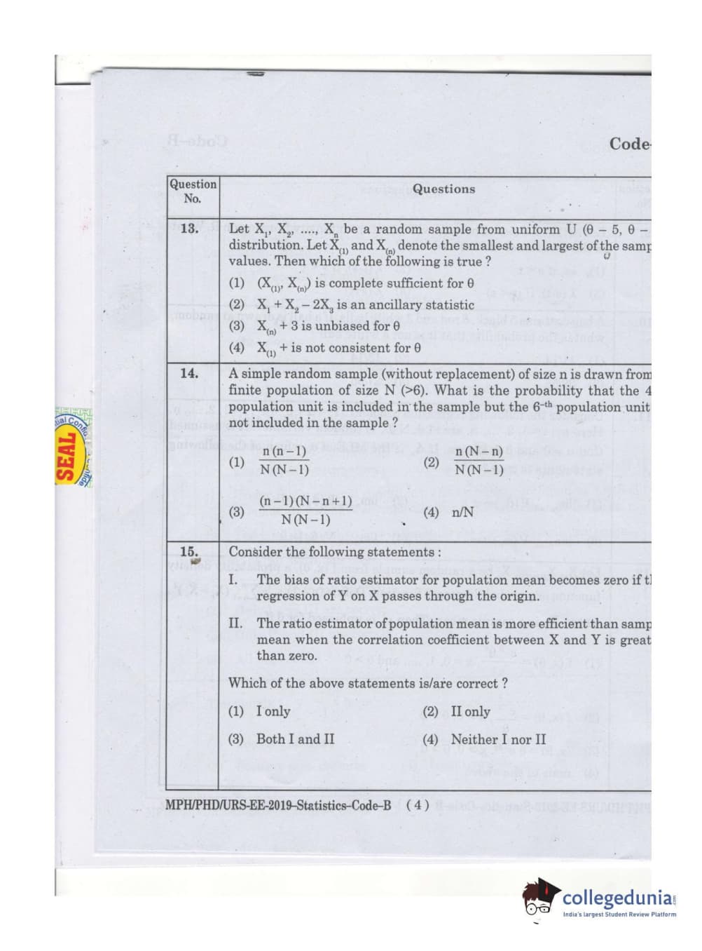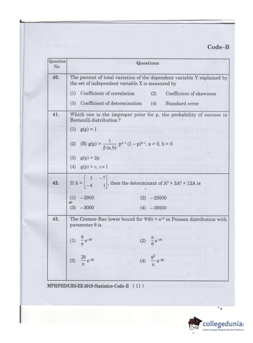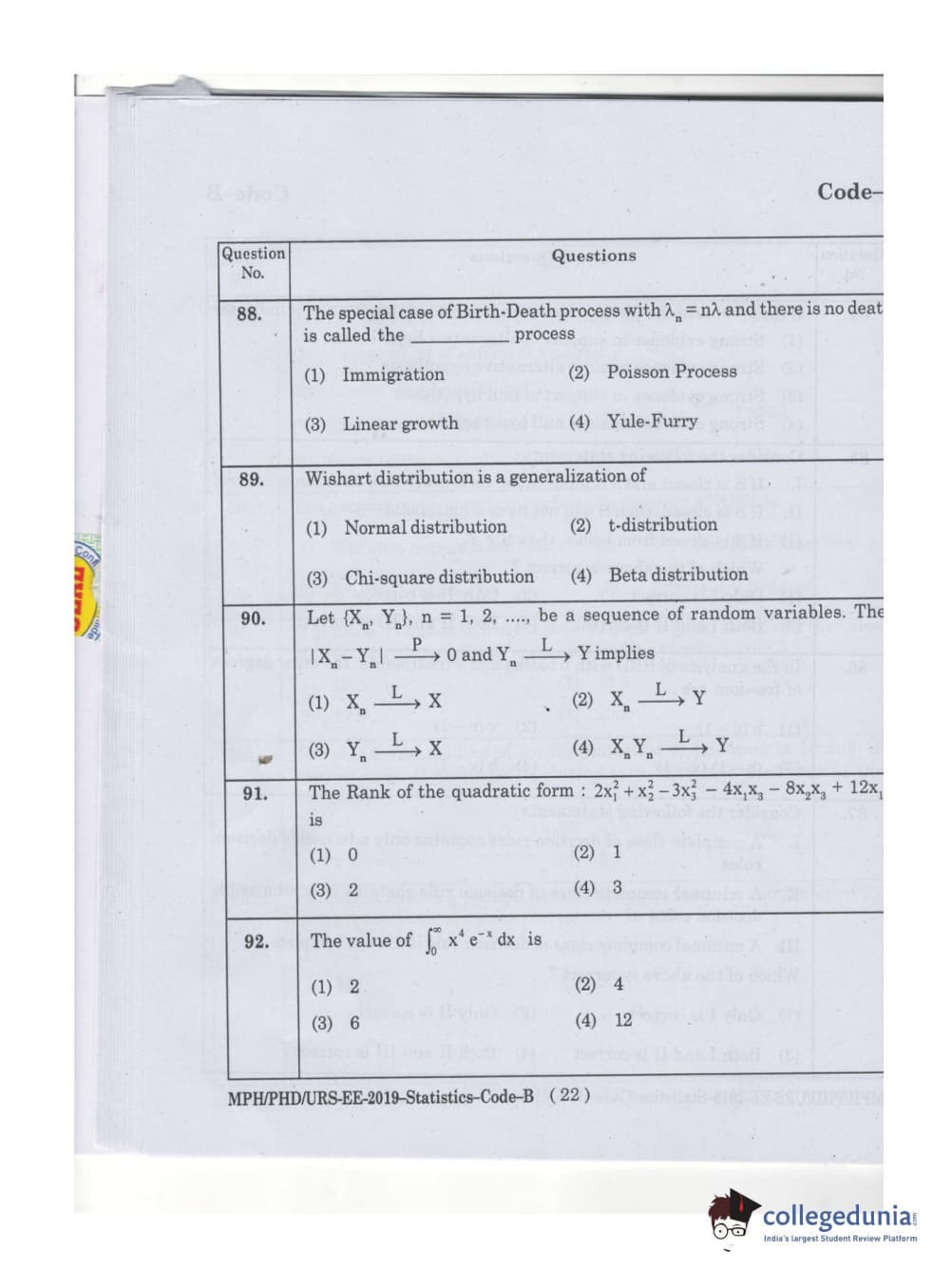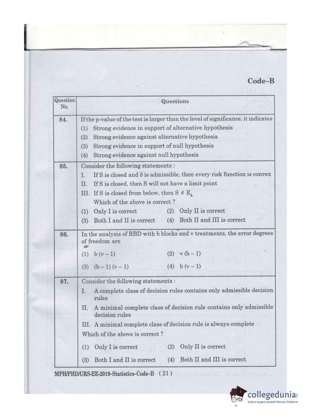 MDUCEE 2019 Ph.D./M.Phil./URS Statistcs Set B Question Paper with Answer Key PDFs