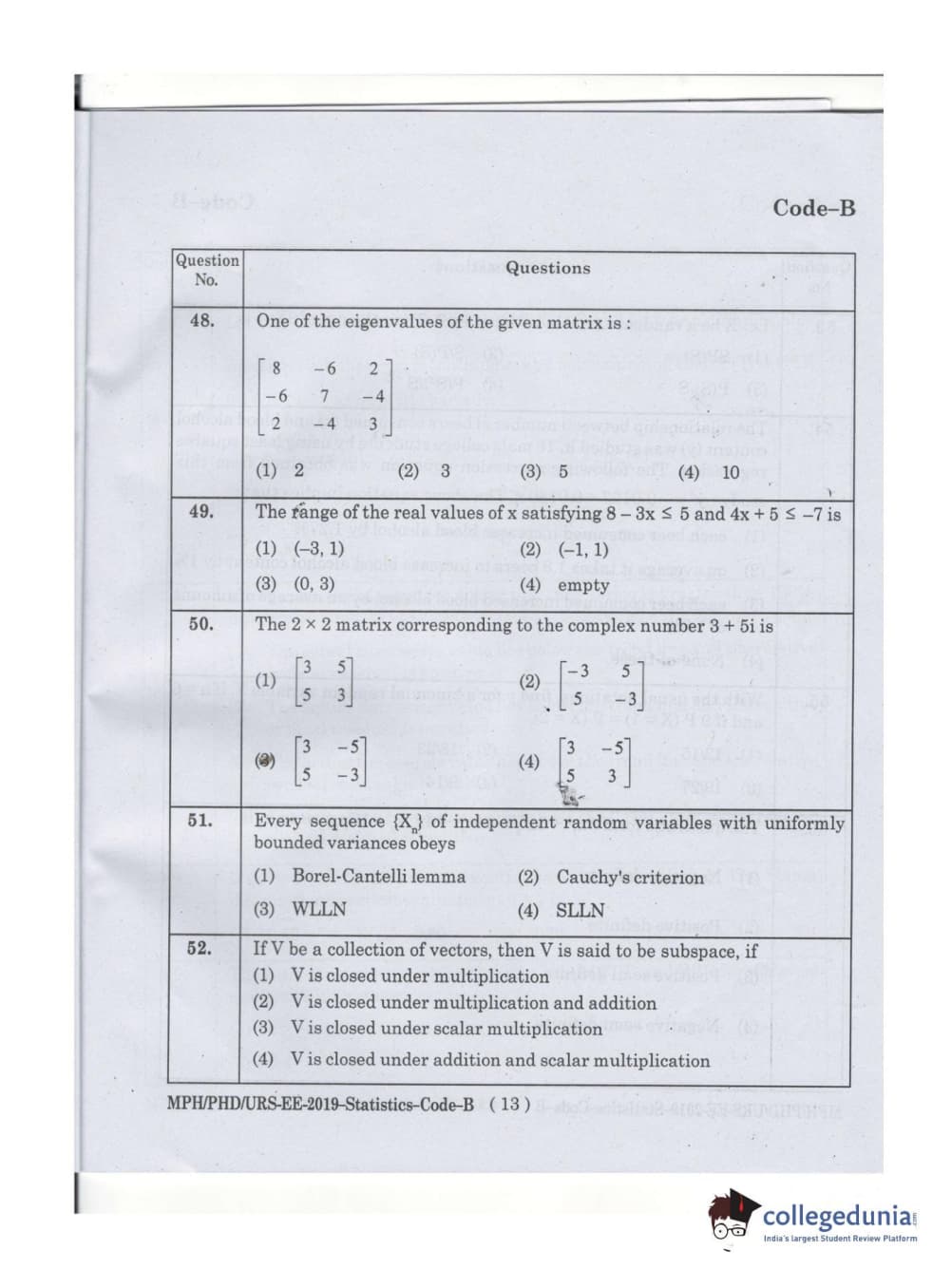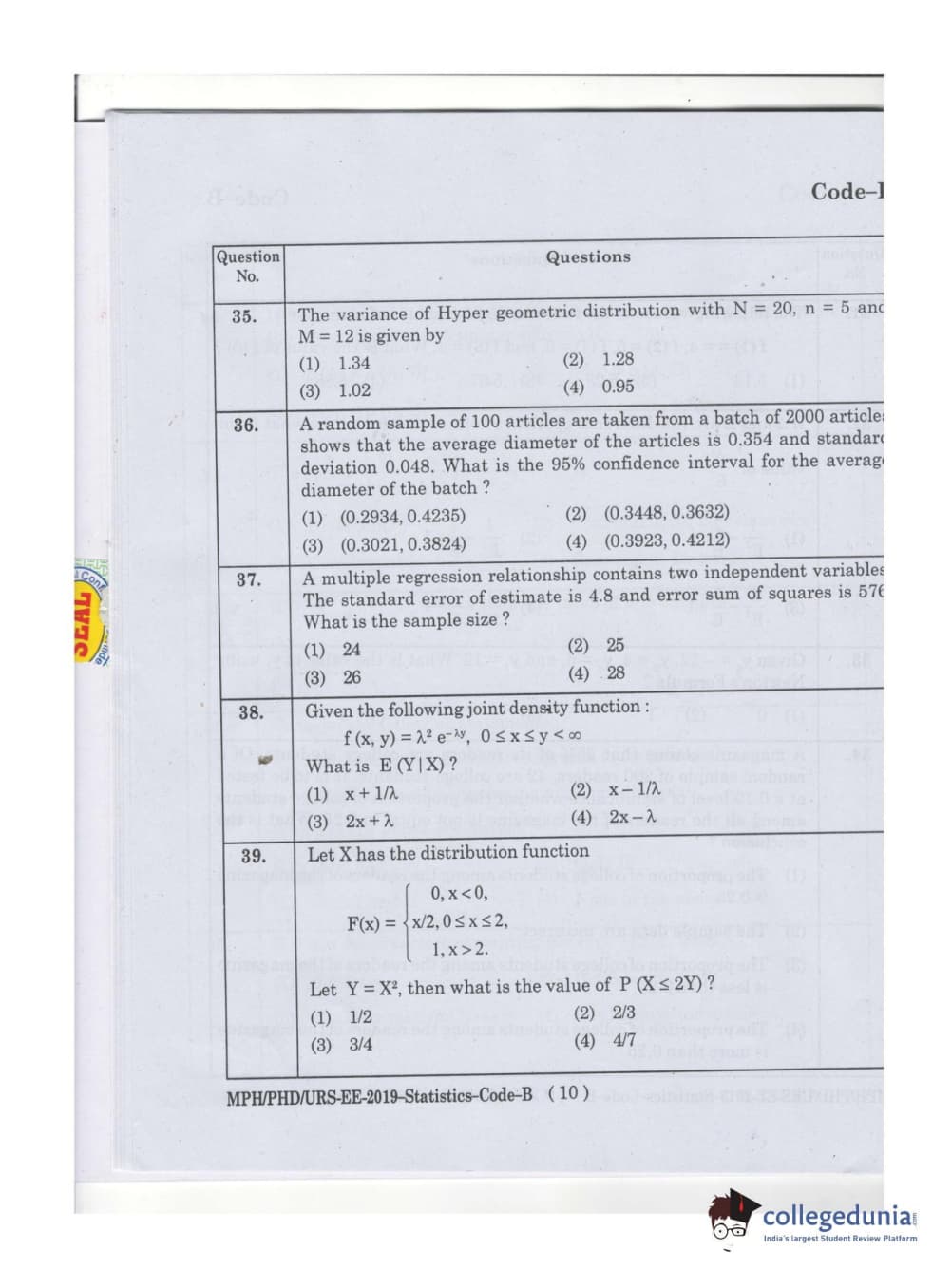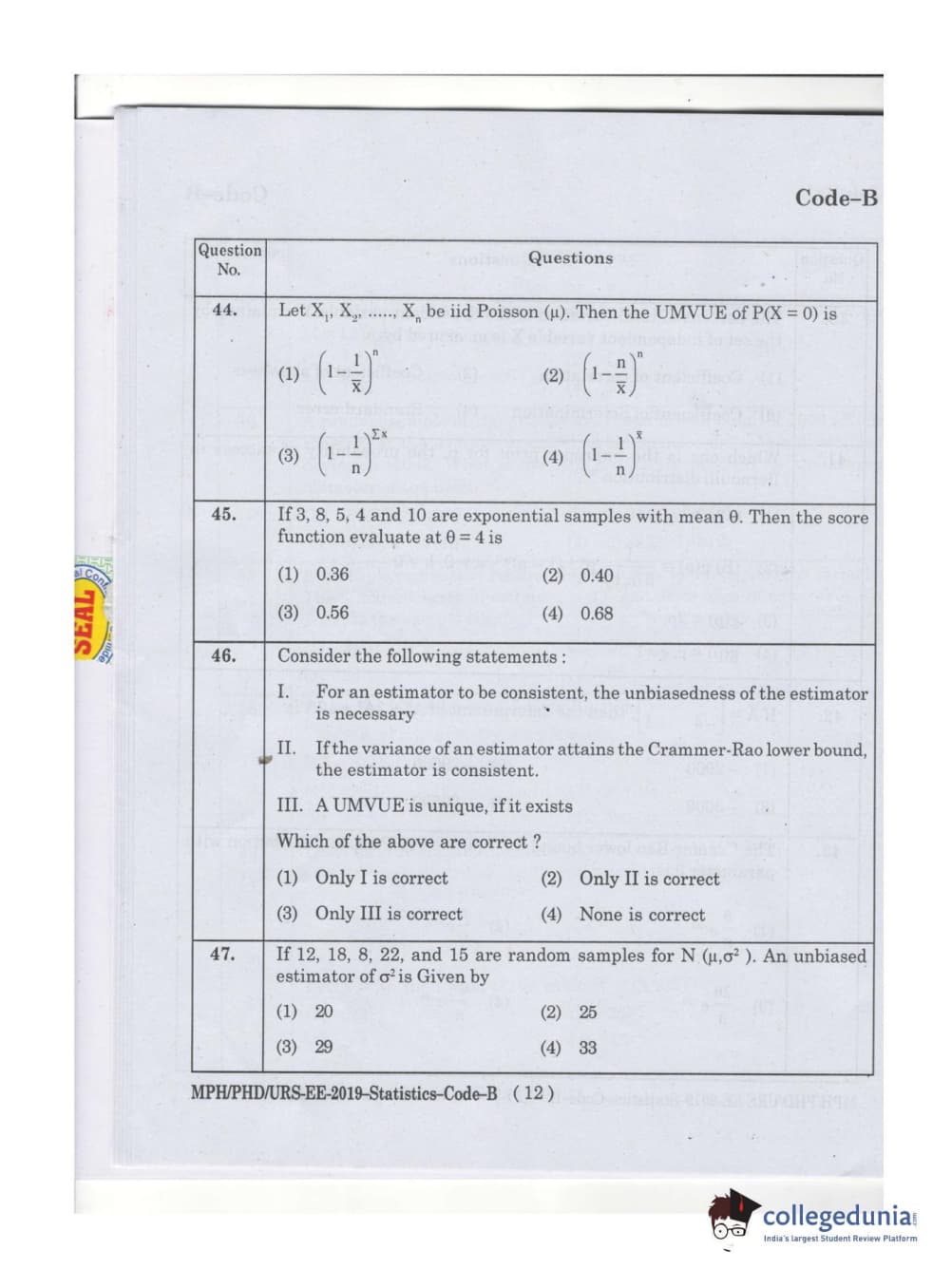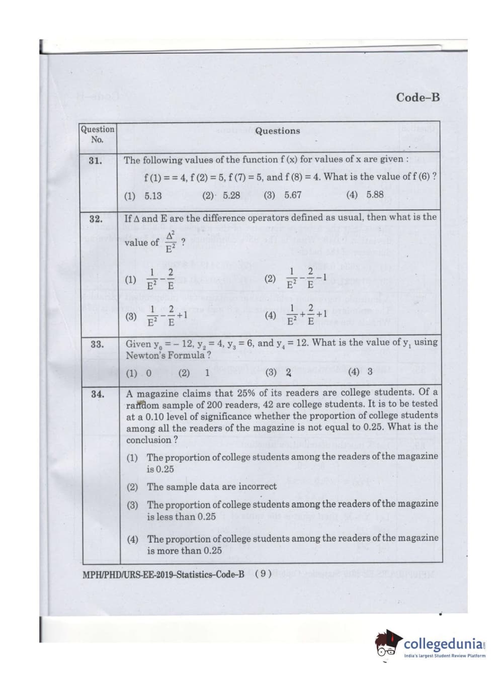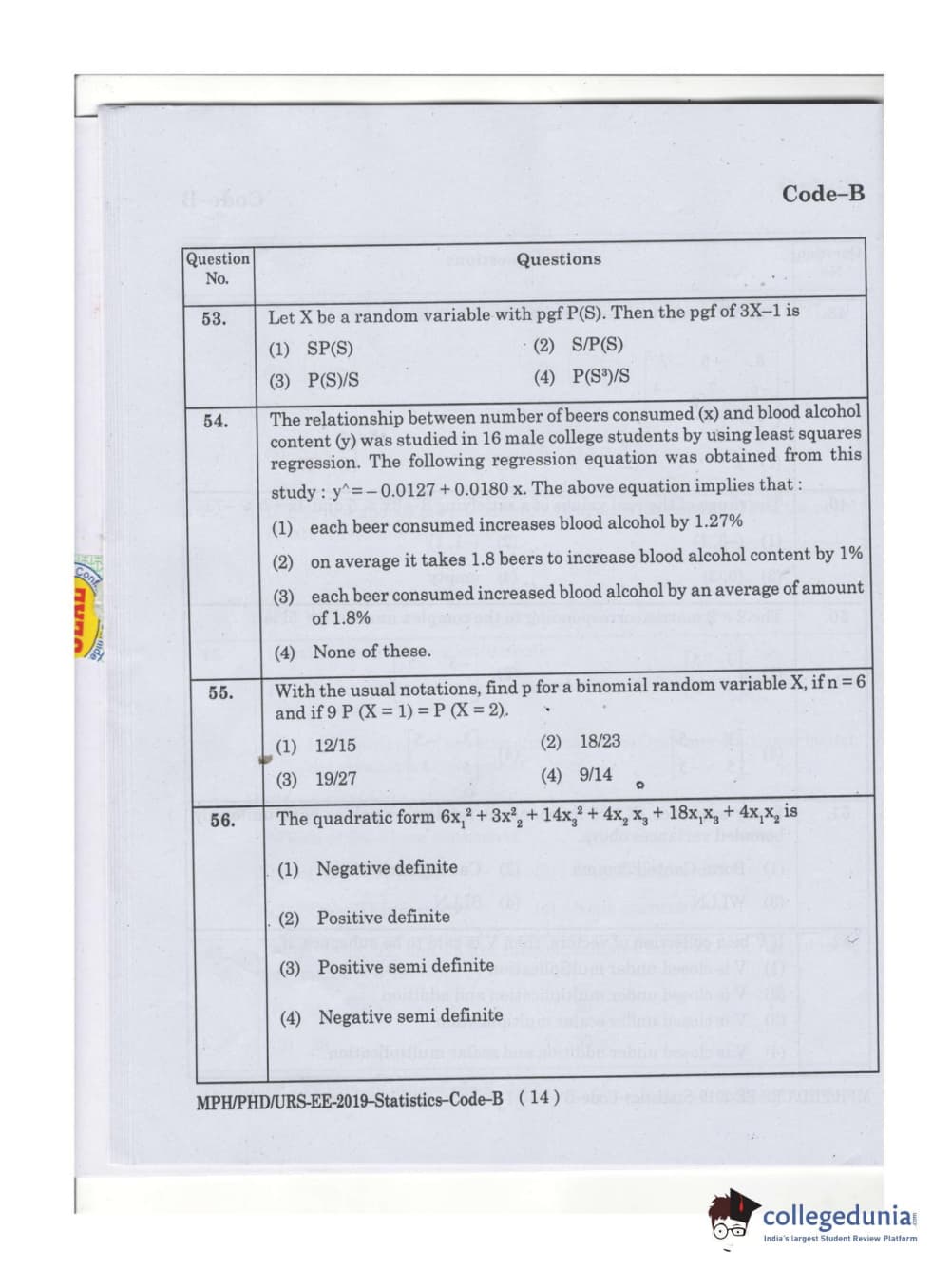 MDUCEE 2019 Ph.D./M.Phil./URS Statistcs Set B Question Paper with Answer Key PDFs
