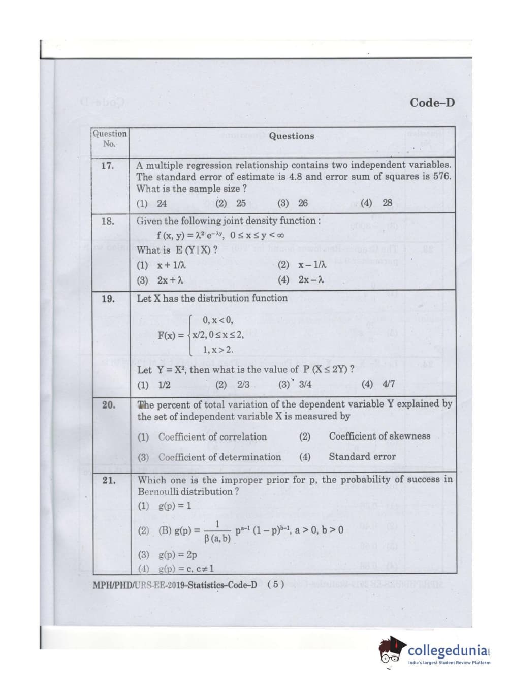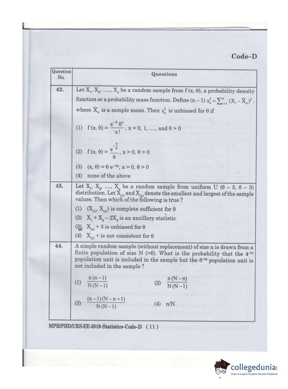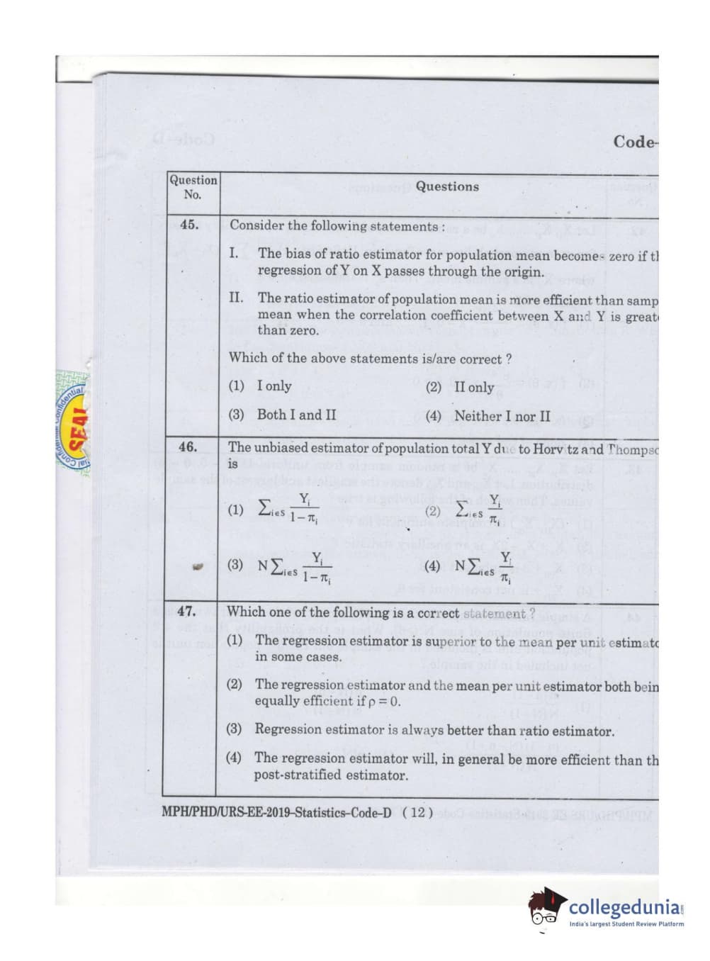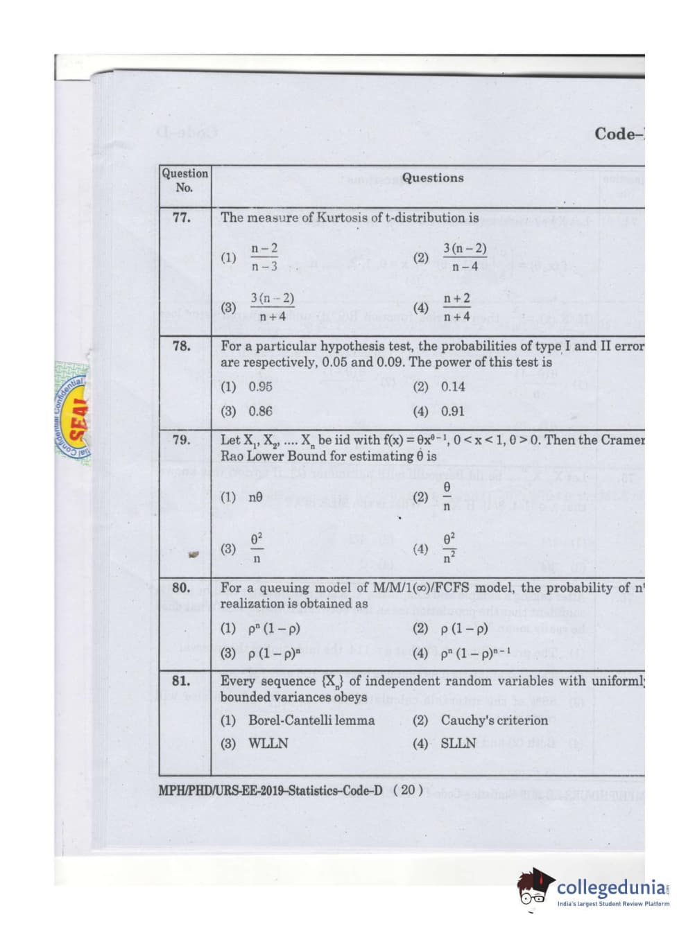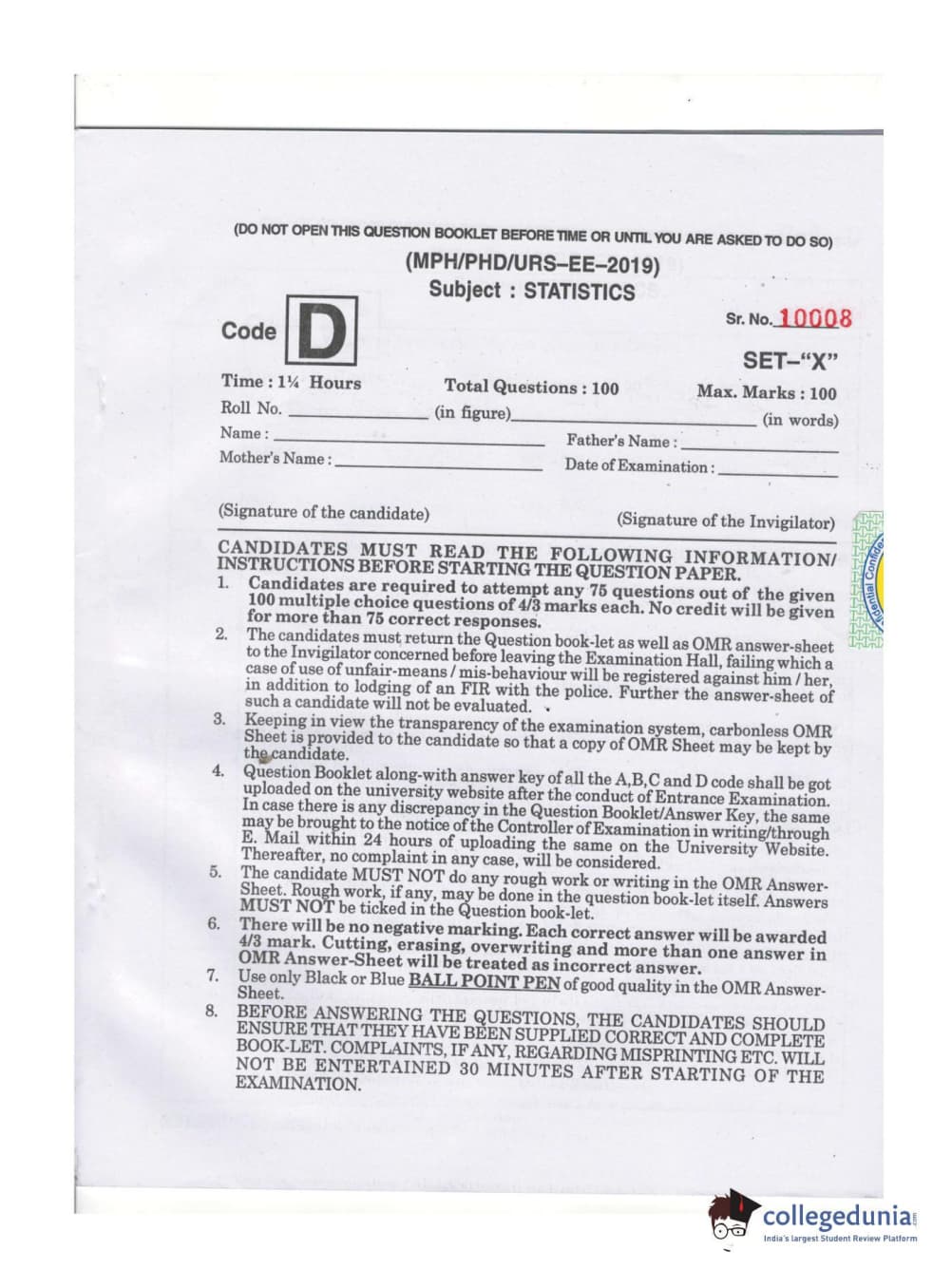 MDUCEE 2019 Ph.D./M.Phil./URS Statistcs Set D Question Paper with Answer Key PDFs