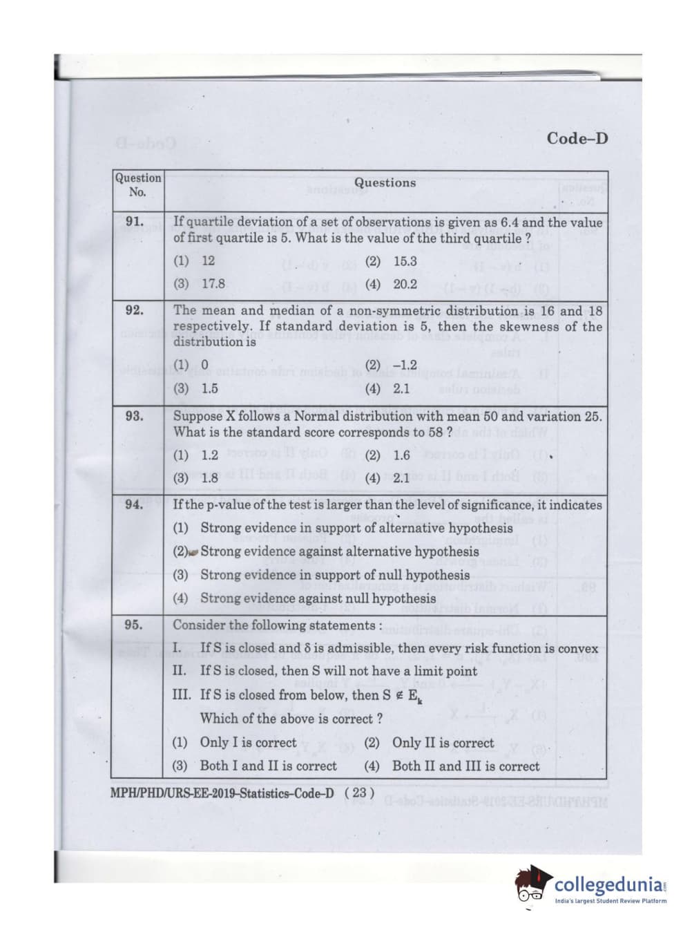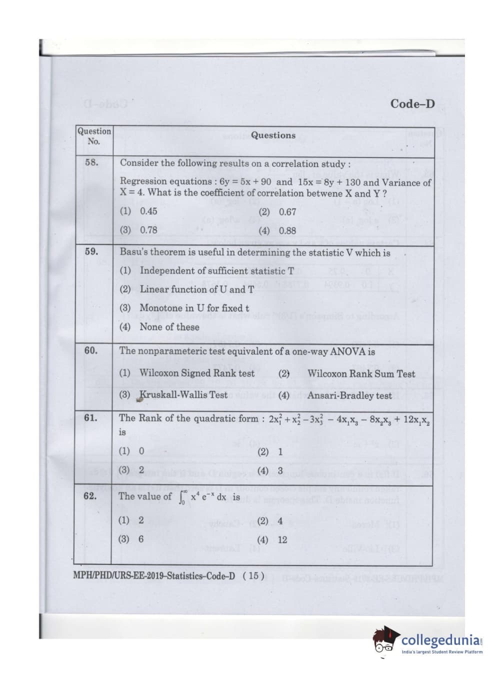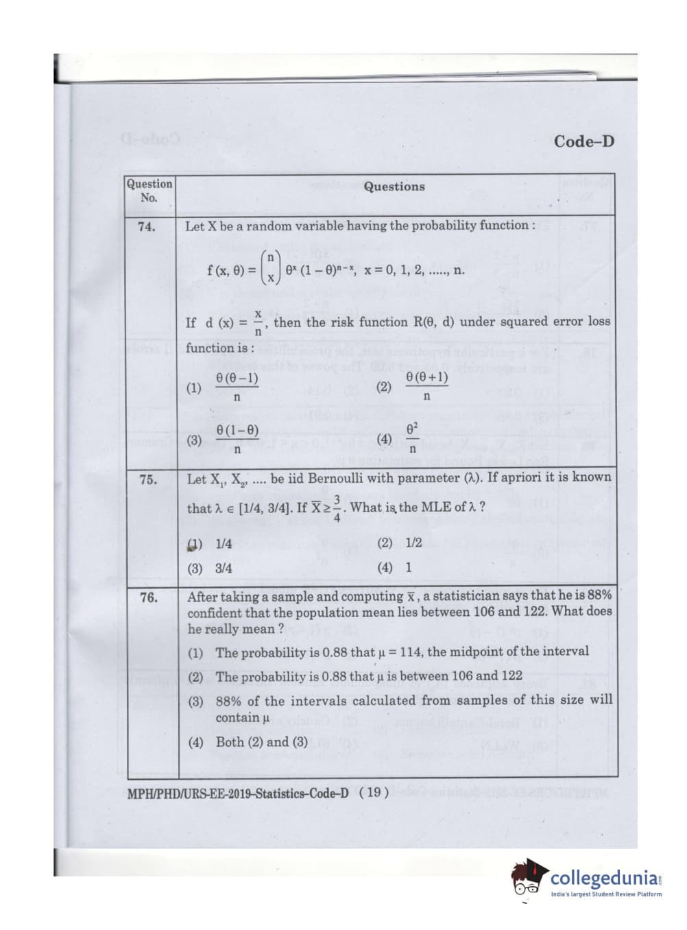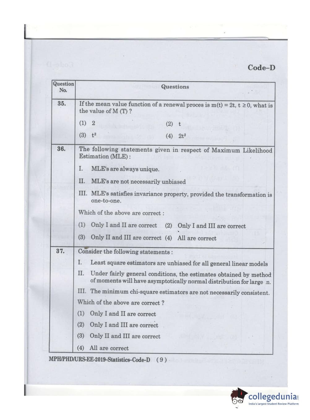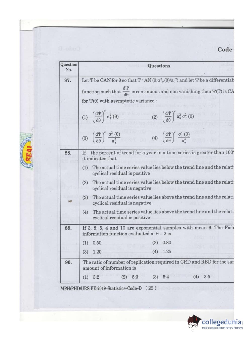 MDUCEE 2019 Ph.D./M.Phil./URS Statistcs Set D Question Paper with Answer Key PDFs