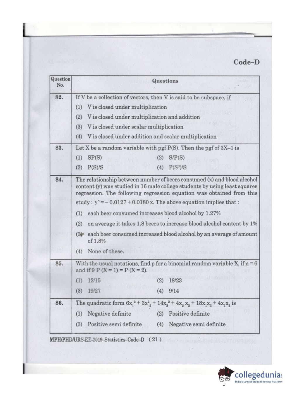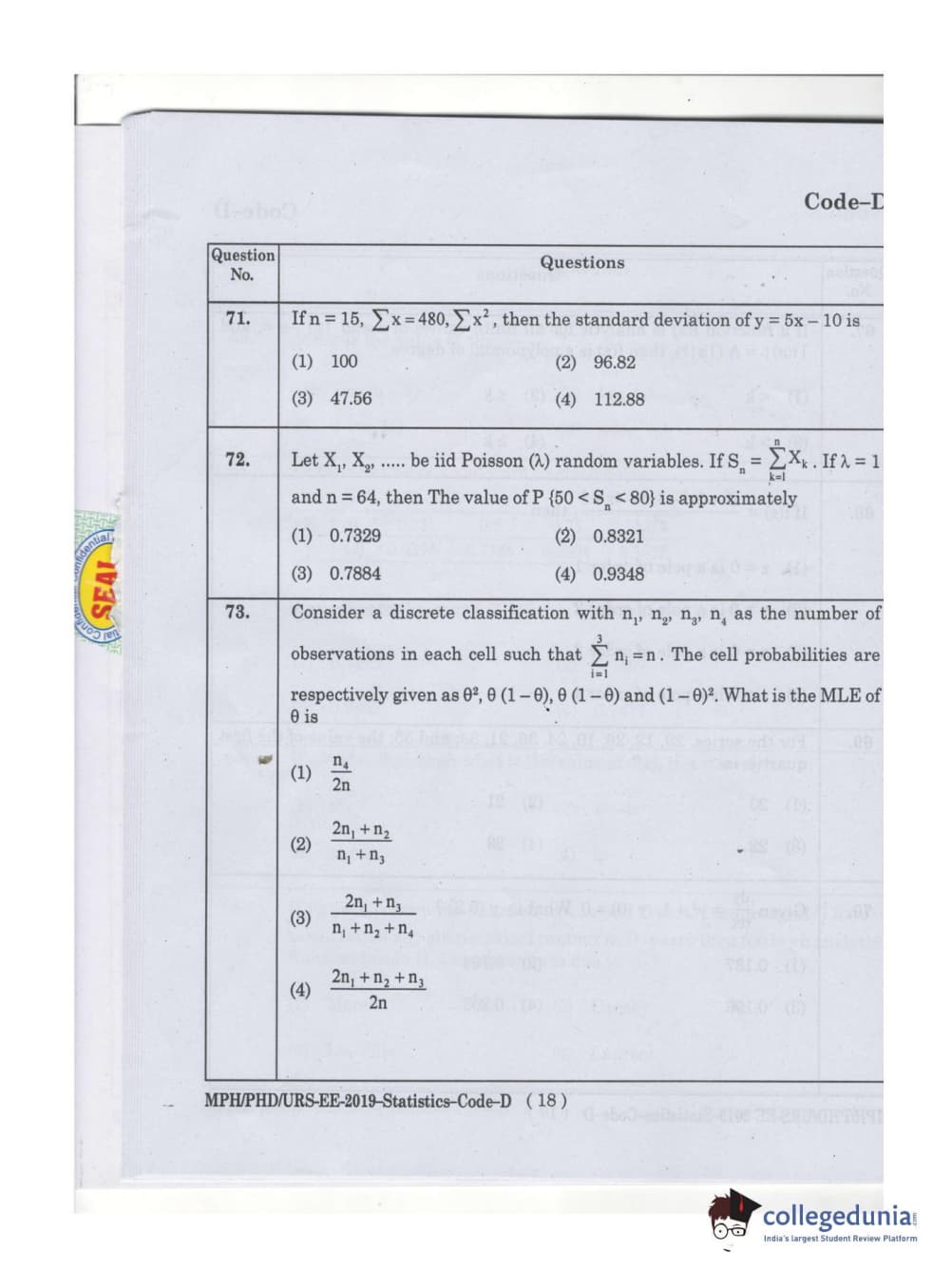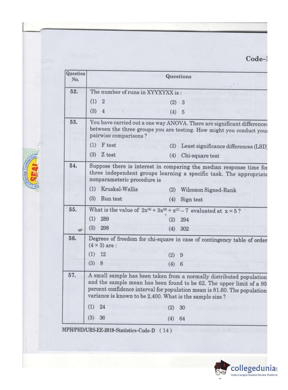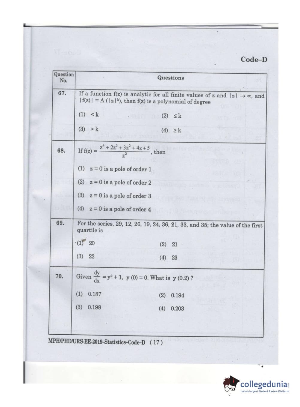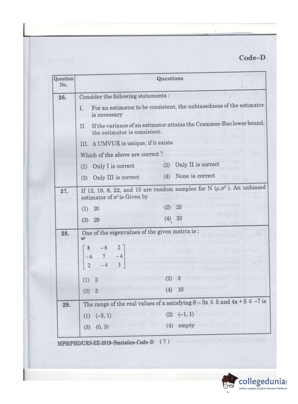 MDUCEE 2019 Ph.D./M.Phil./URS Statistcs Set D Question Paper with Answer Key PDFs