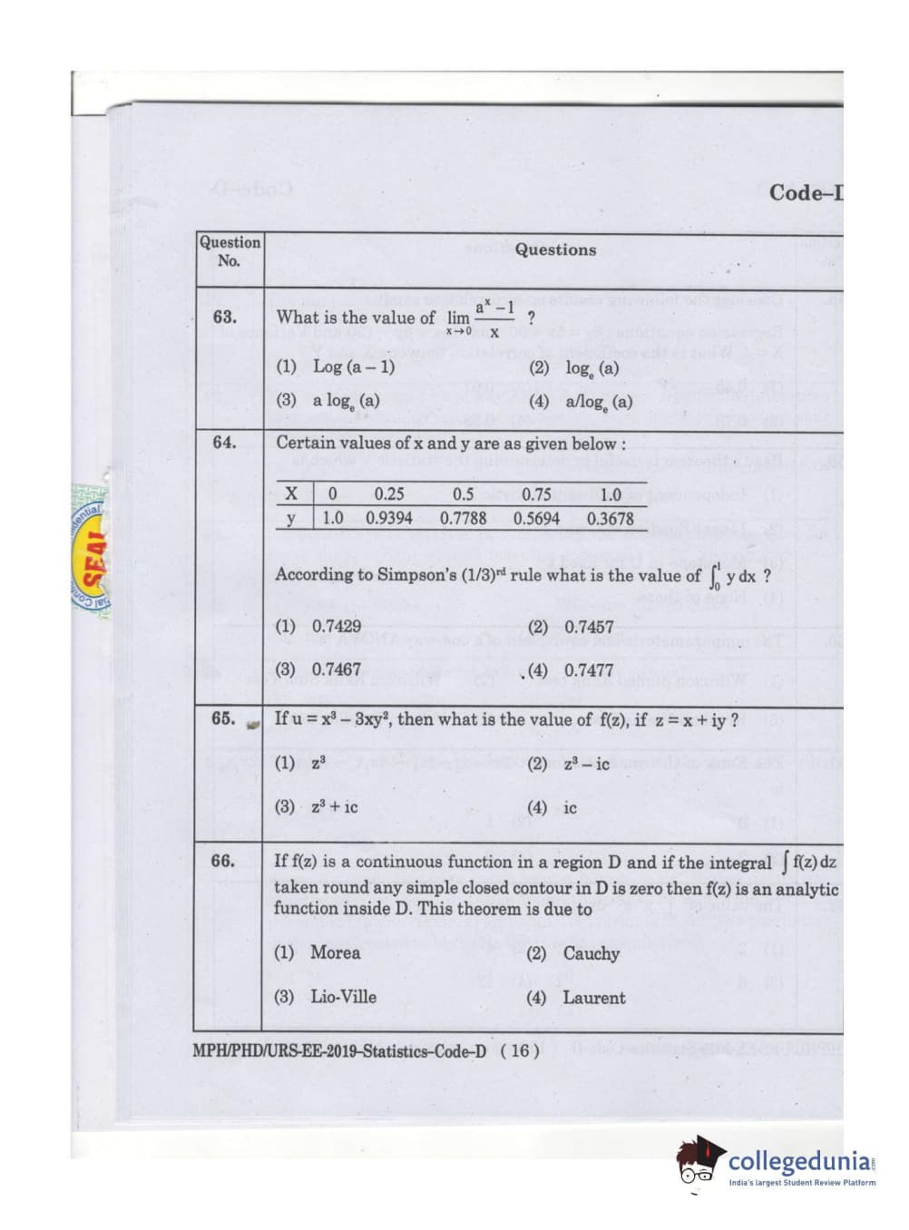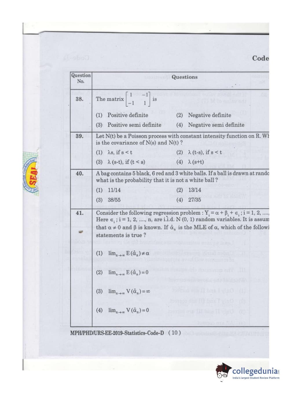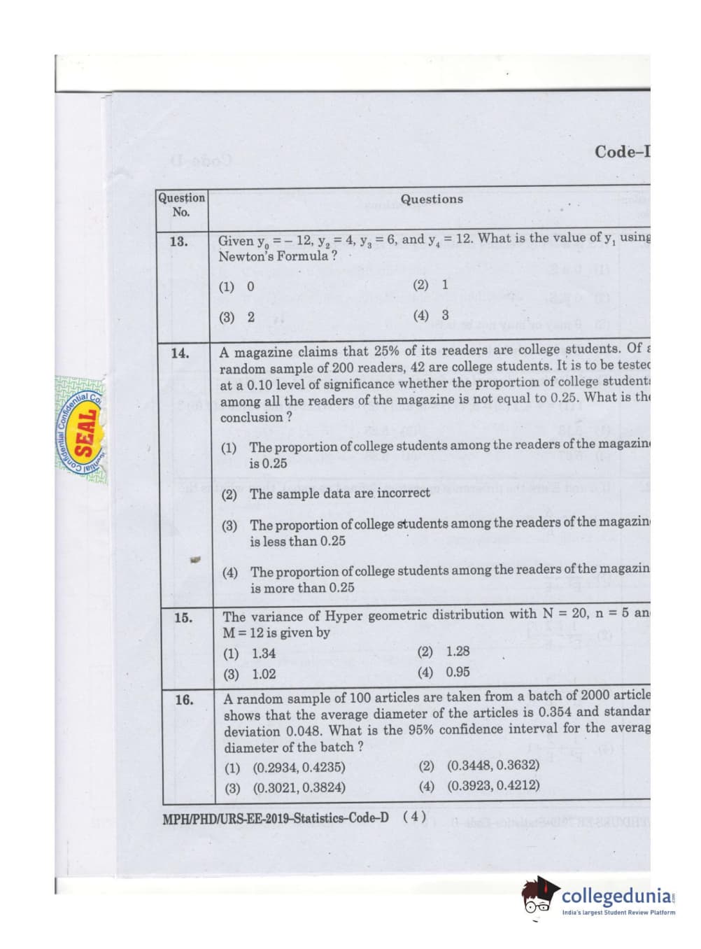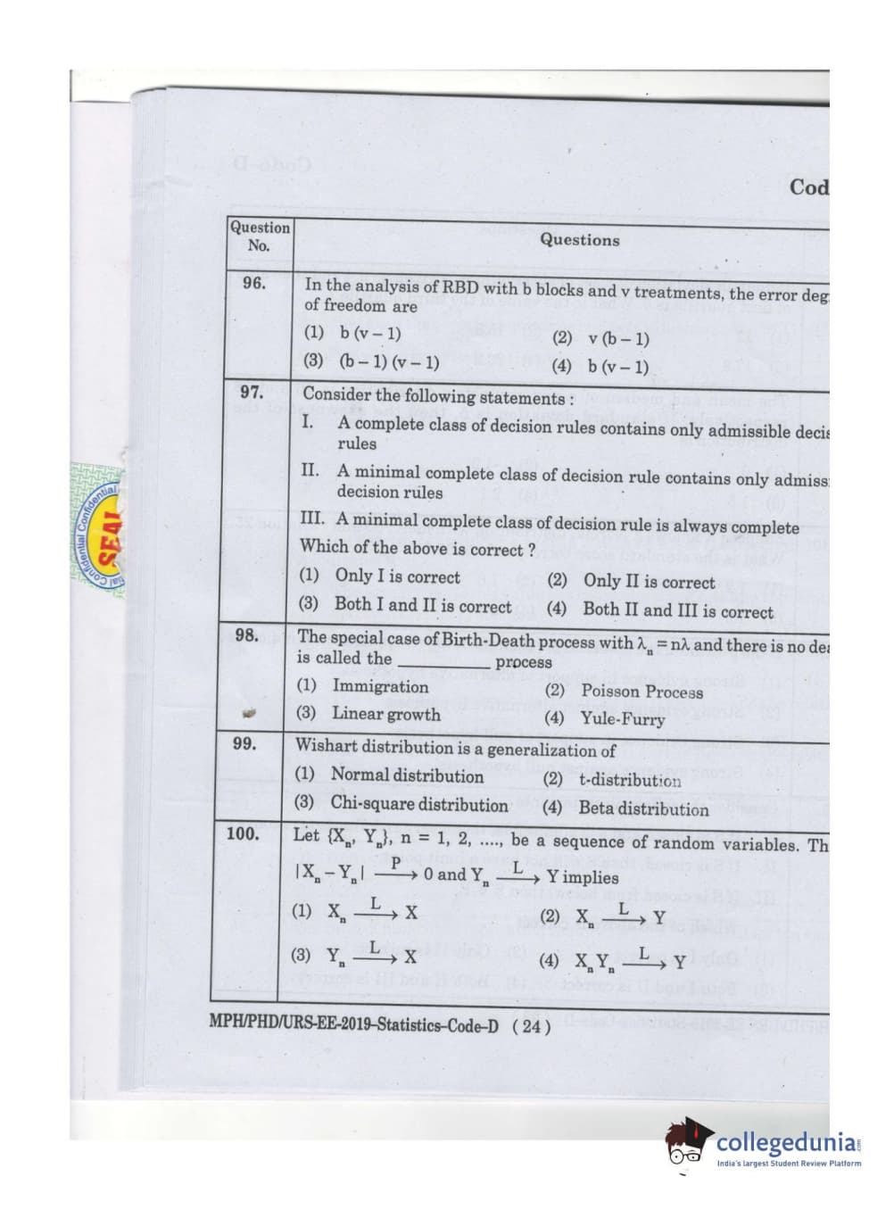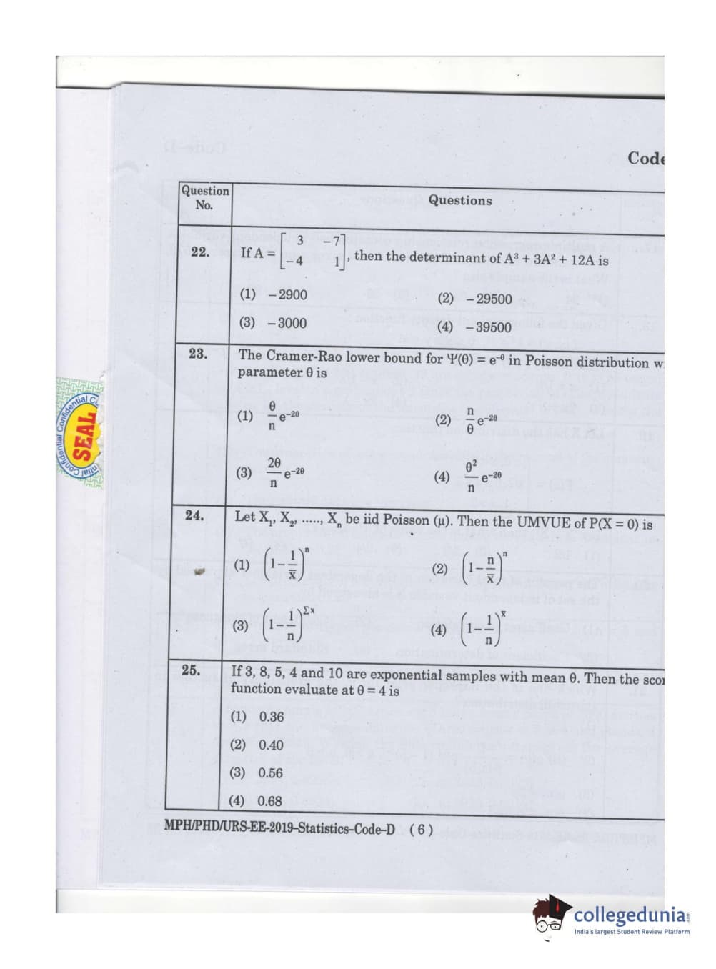MDUCEE 2019 Ph.D./M.Phil./URS Statistcs Set D Question Paper with Answer Key PDFs