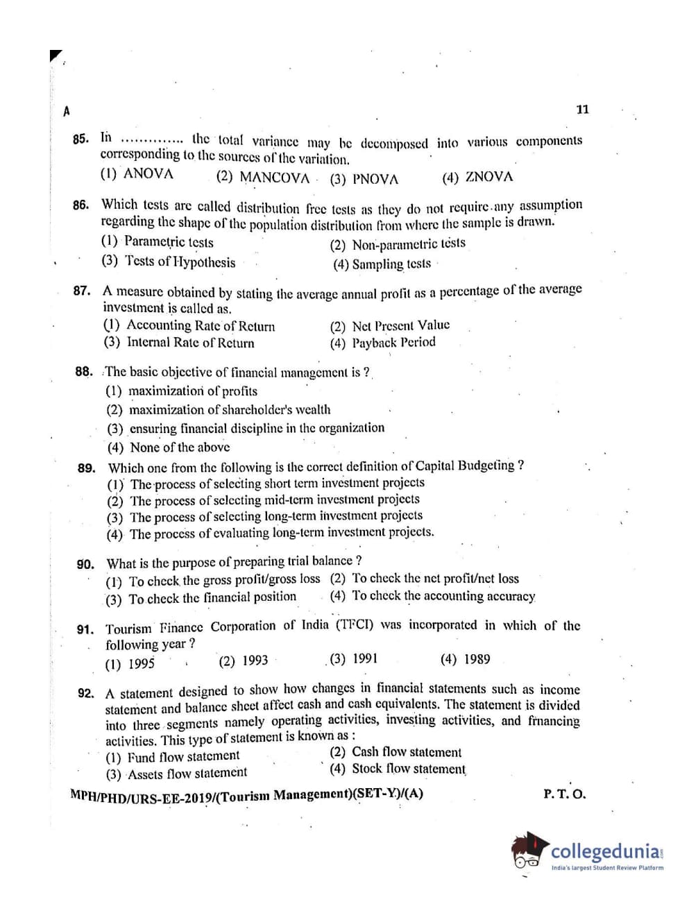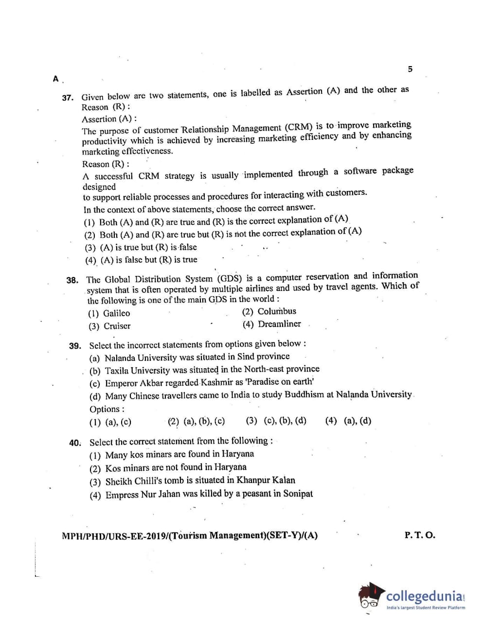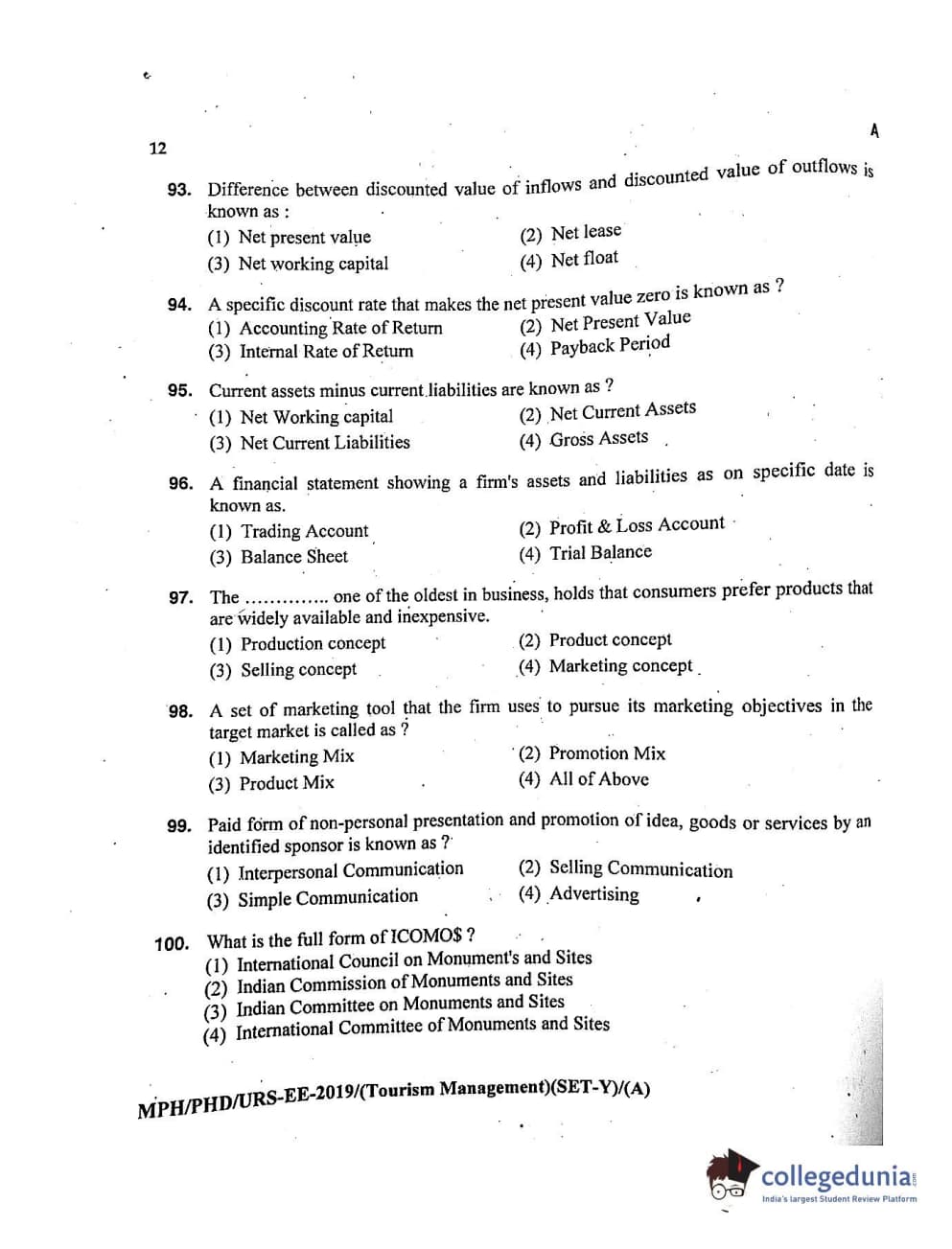MDUCEE 2019 Ph.D./M.Phil./URS Tourism Management Set A Question Paper with Answer Key PDFs