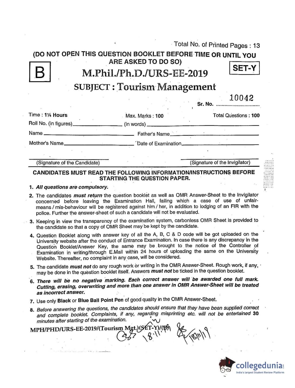 MDUCEE 2019 Ph.D./M.Phil./URS Tourism Management Set B Question paper with answer key pdf is available for download. The exam was successfully organized by Maharishi Dayanand University. The question paper comprised a total of 100 questions.