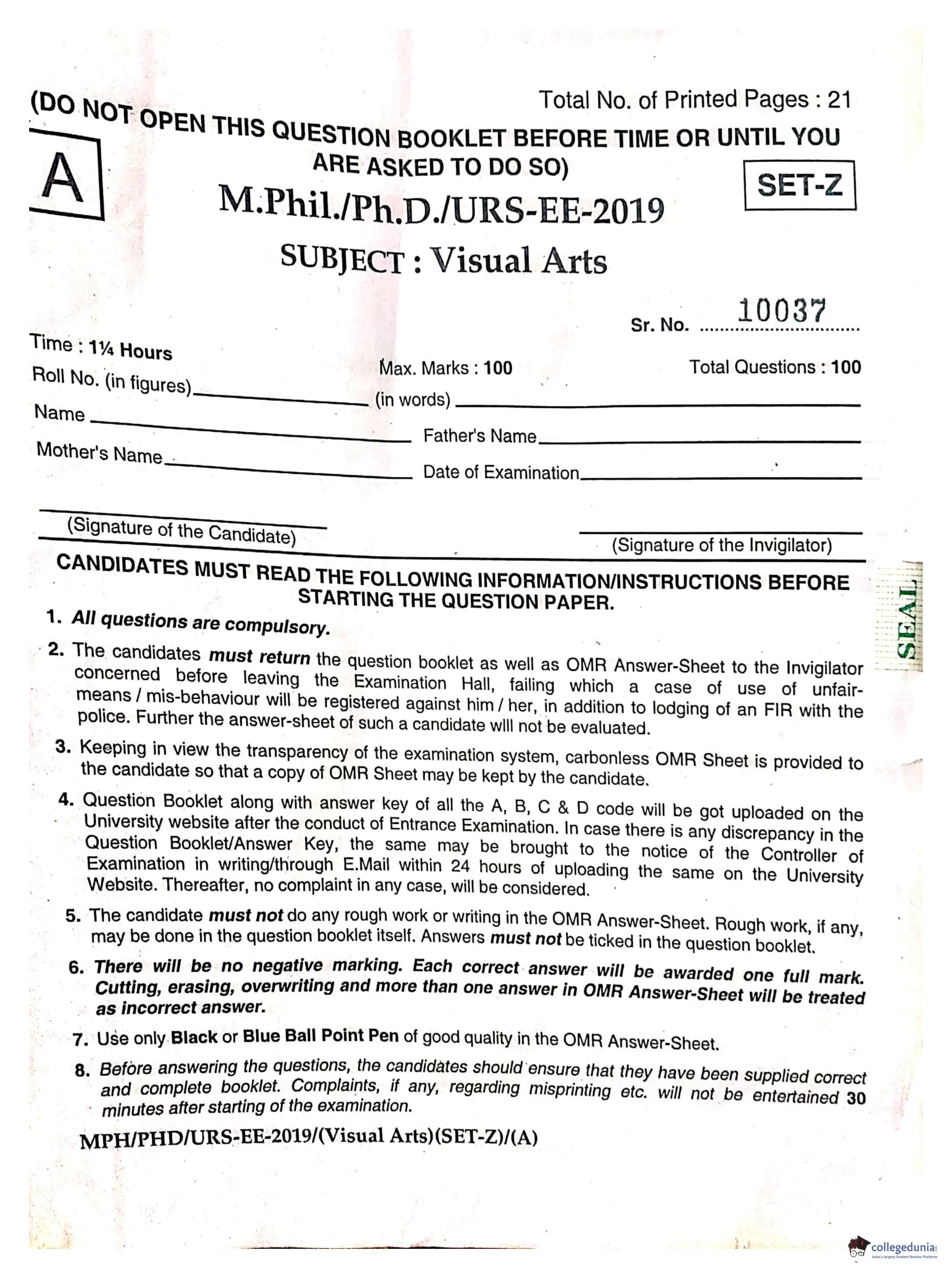 MDUCEE 2019 Ph.D./M.Phil./URS Visual Arts Set A Question paper with answer key pdf is available for download. The exam was successfully organized by Maharishi Dayanand University. The question paper comprised a total of 100 questions.