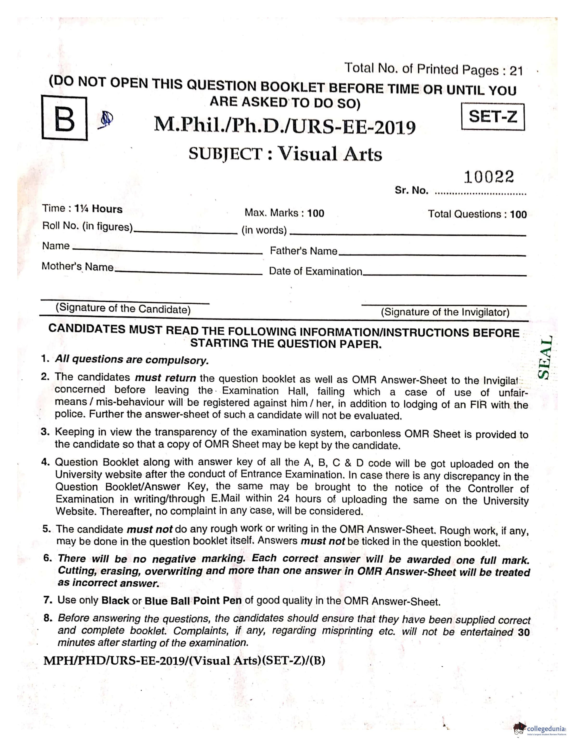 MDUCEE 2019 Ph.D./M.Phil./URS Visual Arts Set B Question paper with answer key pdf is available for download. The exam was successfully organized by Maharishi Dayanand University. The question paper comprised a total of 100 questions.