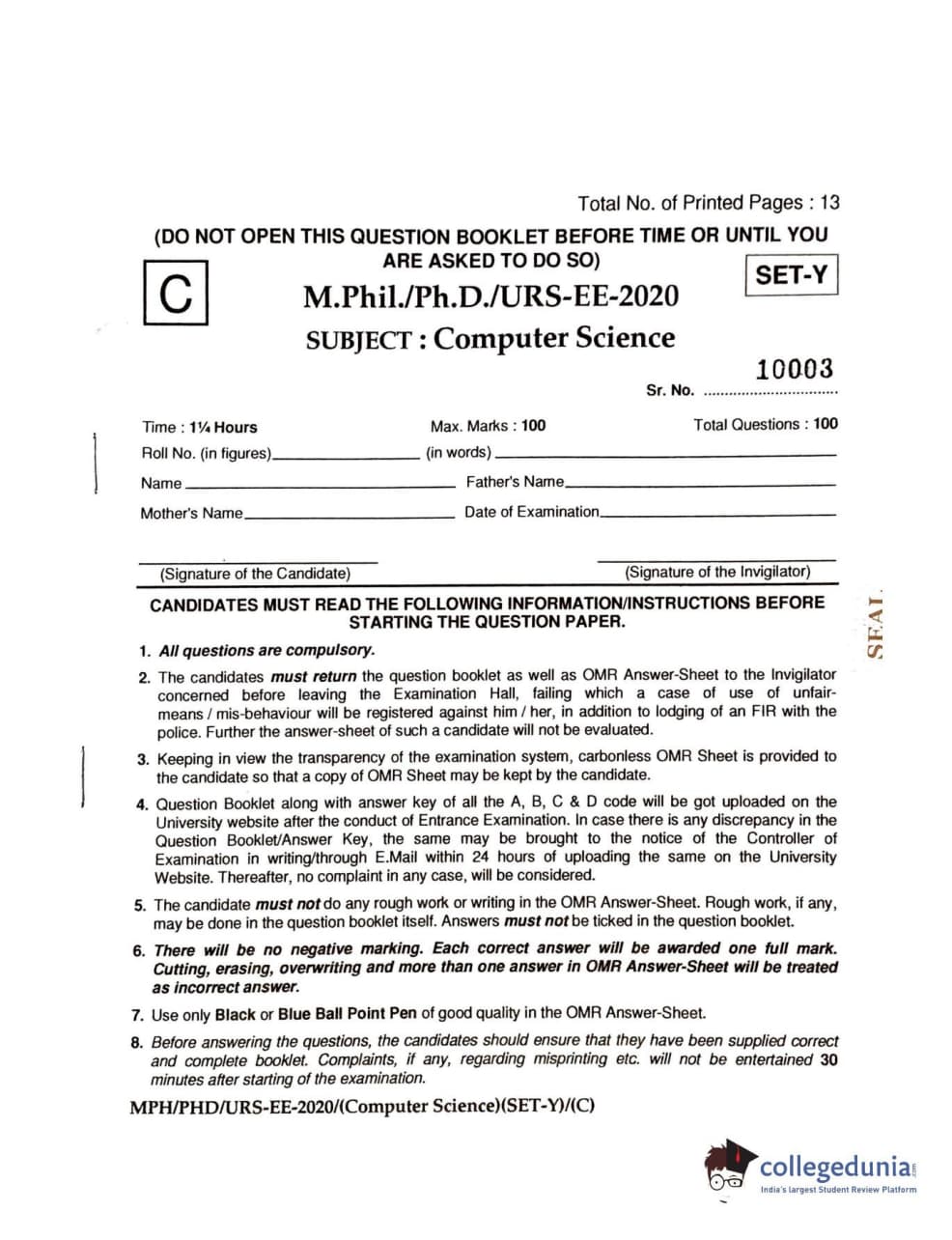 | MDUCEE 2020 M.Phil/Ph.D/URS – Computer Science UIET Set C Question Paper PDF | MDUCEE 2020 M.Phil/Ph.D/URS – Computer Science UIET Set C Answer Key PDF |