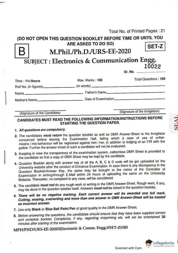 | MDUCEE 2020 M.Phil/Ph.D/URS - Electronics and Communication Engg. Set B Question Paper PDF | MDUCEE 2020 M.Phil/Ph.D/URS - Electronics and Communication Engg. Set B Answer Key PDF |