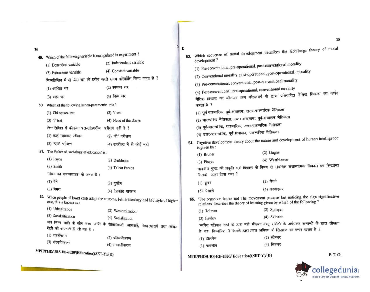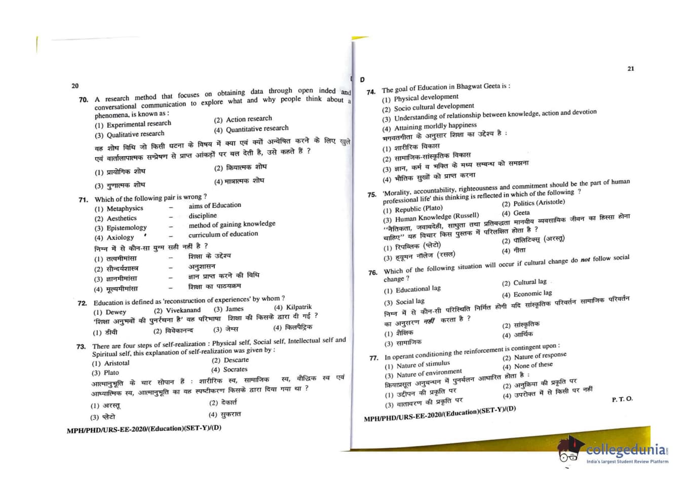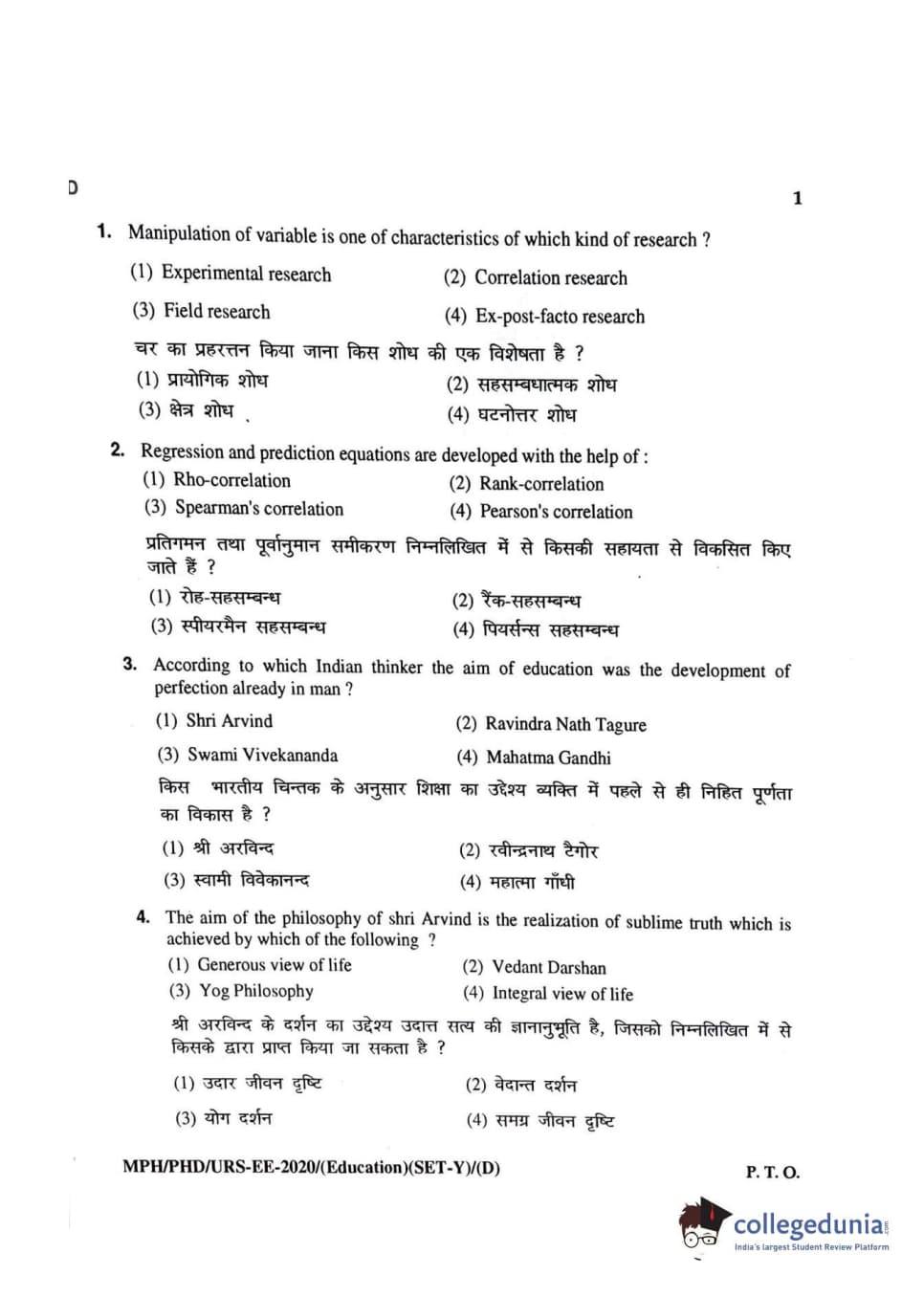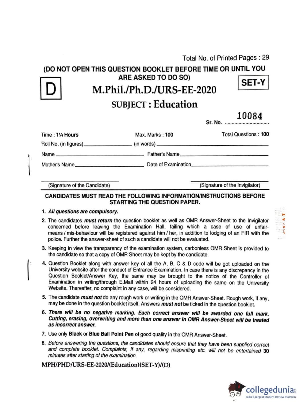 MDUCEE 2020 M.Phil/Ph.D/URS - Education Set D Question Paper with Answer Key PDFs