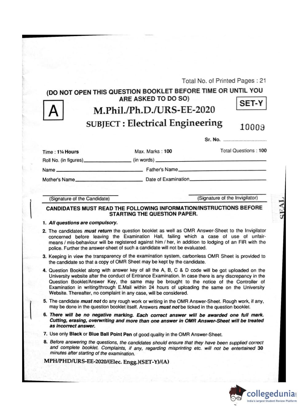 | MDUCEE 2020 M.Phil/Ph.D/URS - Electrical Engineering Set A Question Paper PDF | MDUCEE 2020 M.Phil/Ph.D/URS - Electrical Engineering Set A Answer Key PDF |