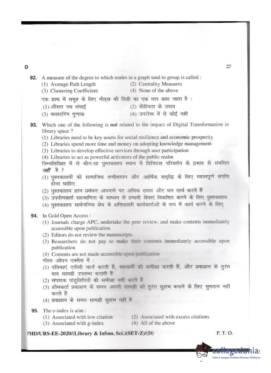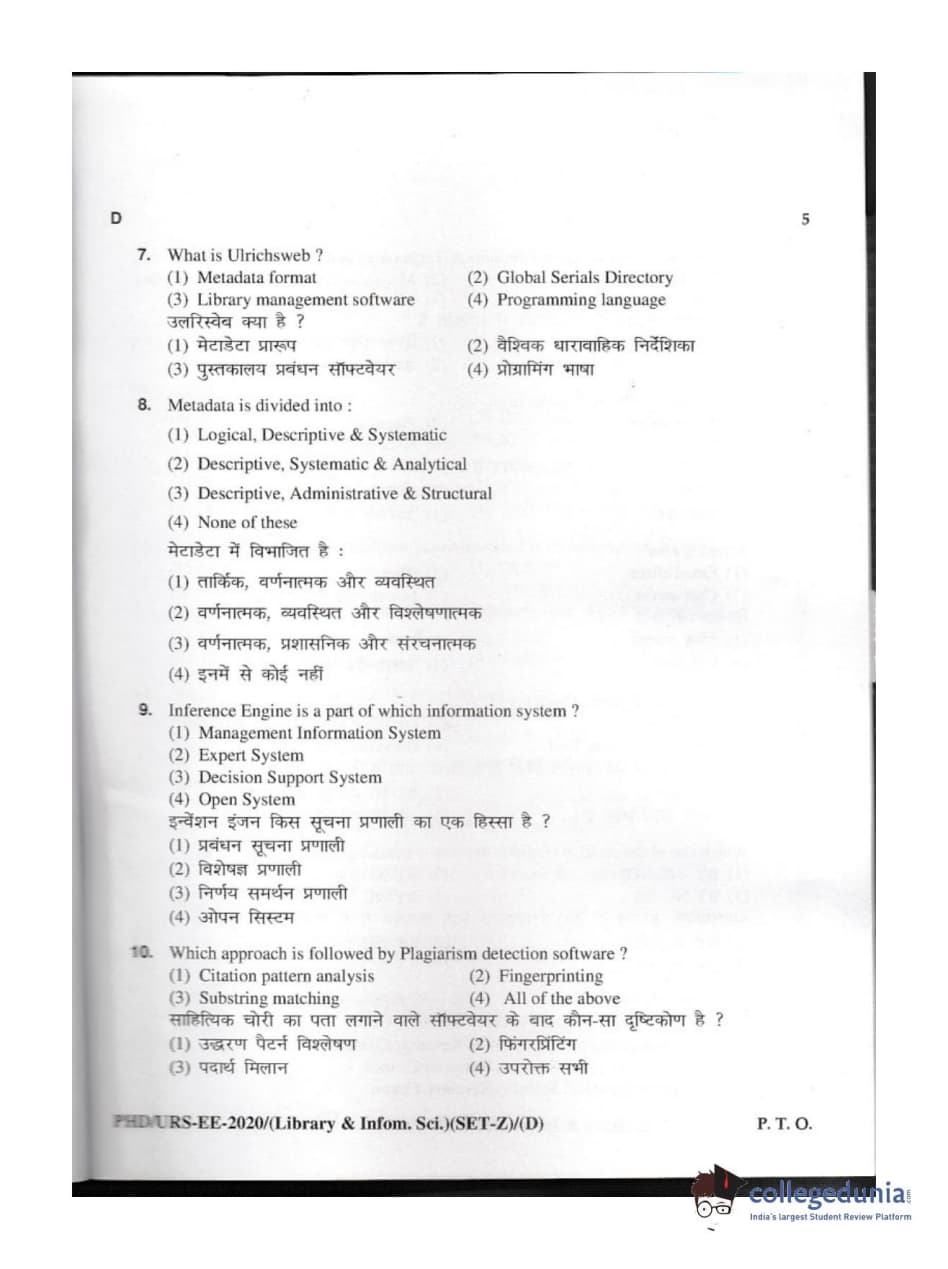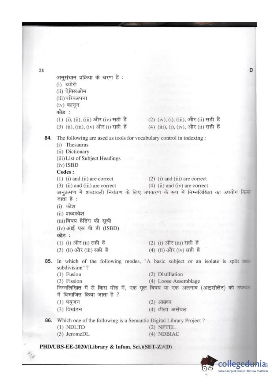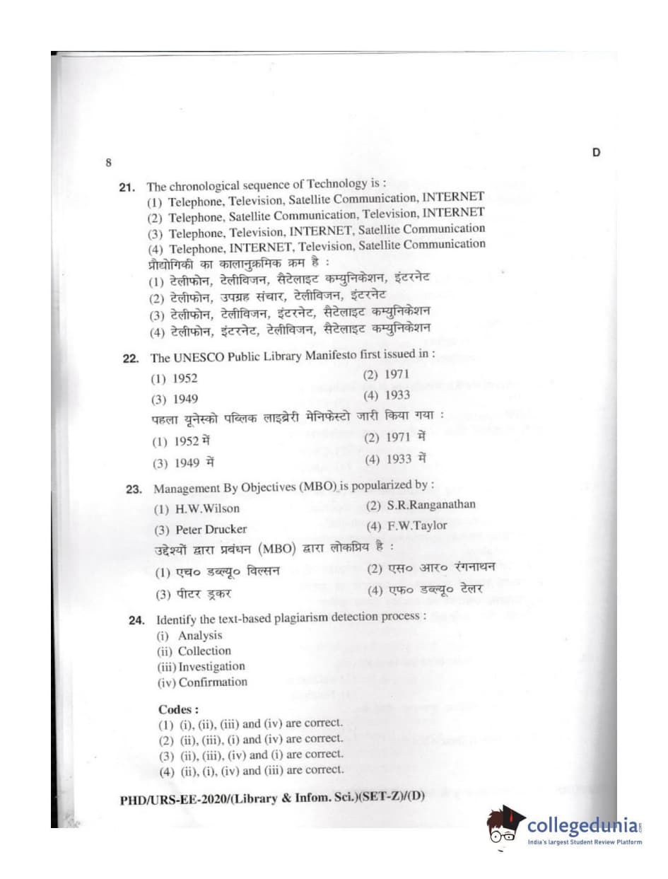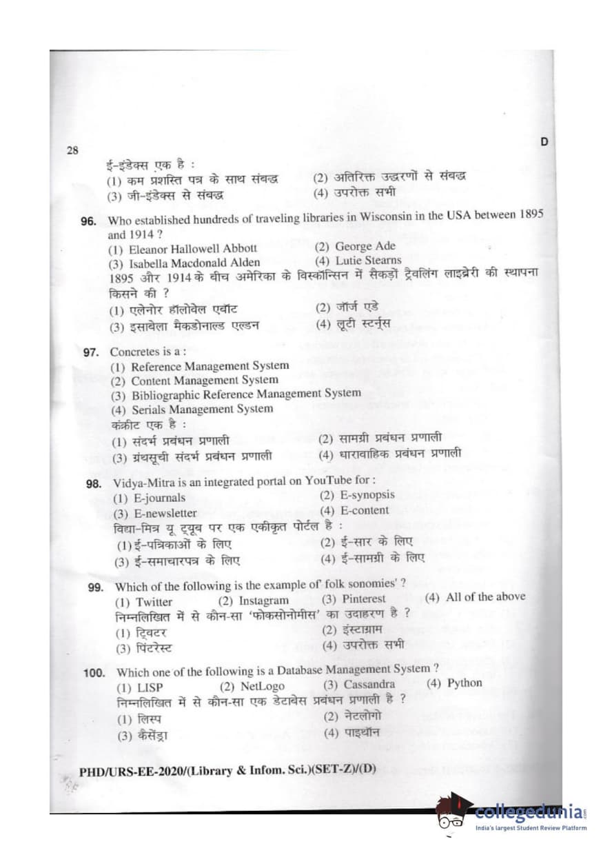 MDUCEE 2020 M.Phil/Ph.D/URS - Library and Information Science Set D Question Paper with Answer Key PDFs
