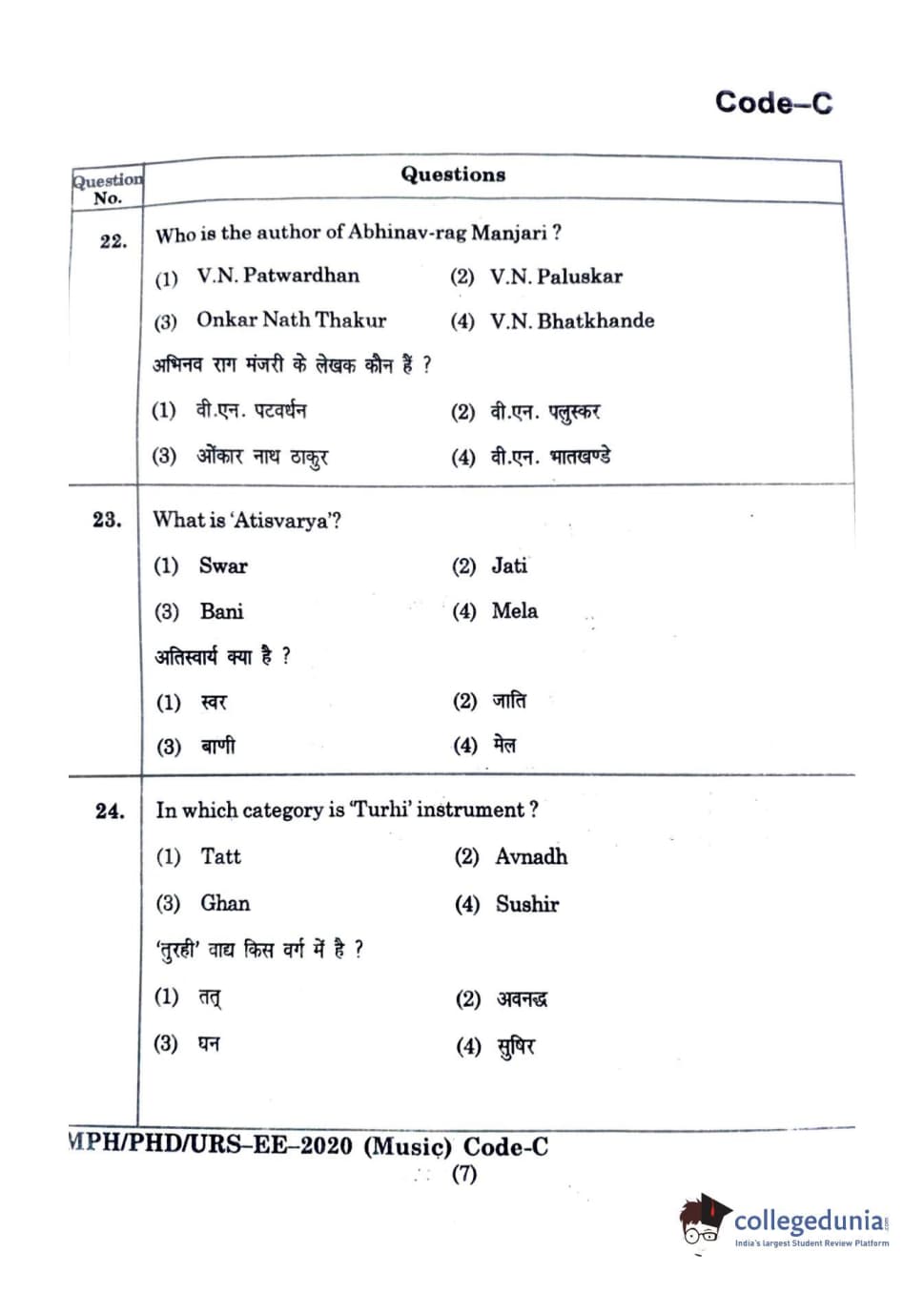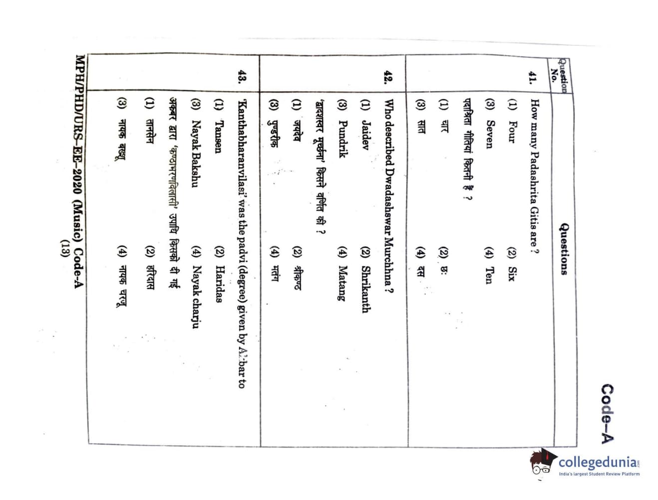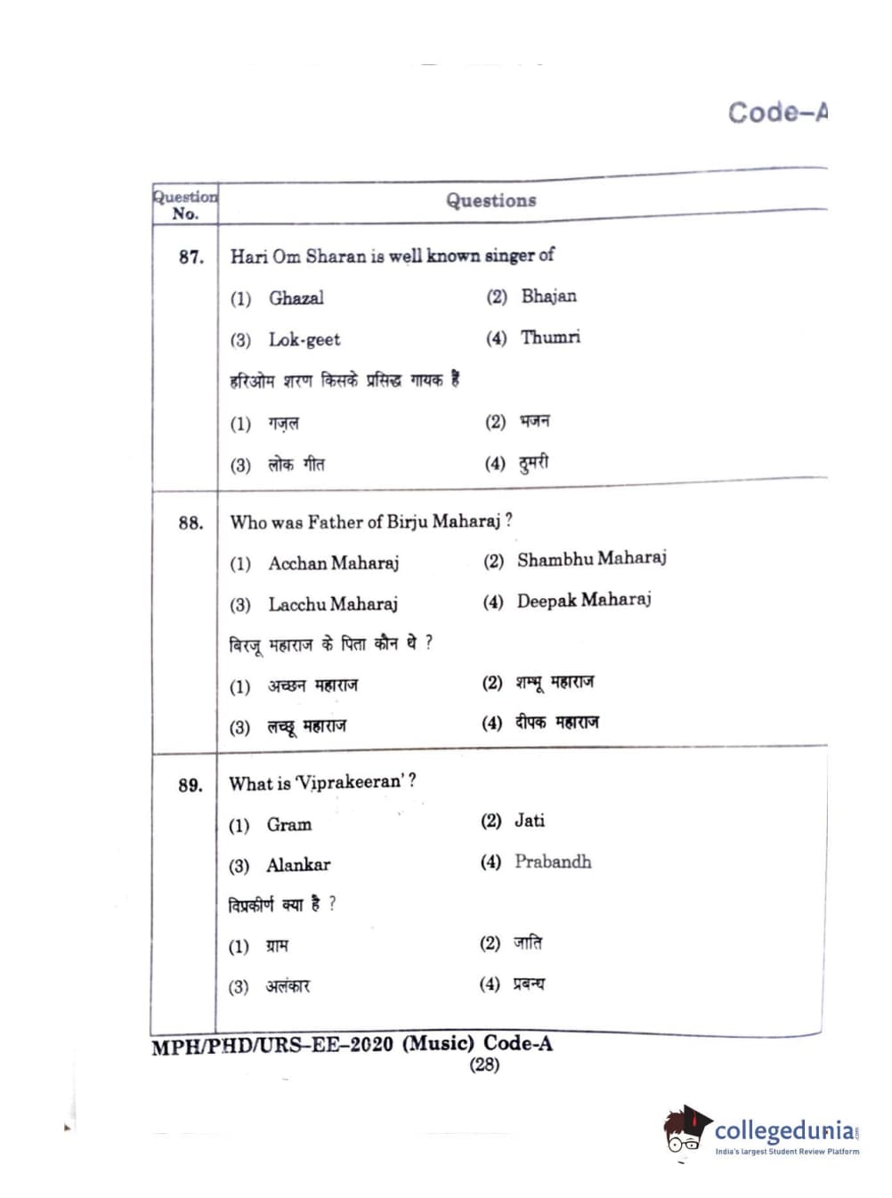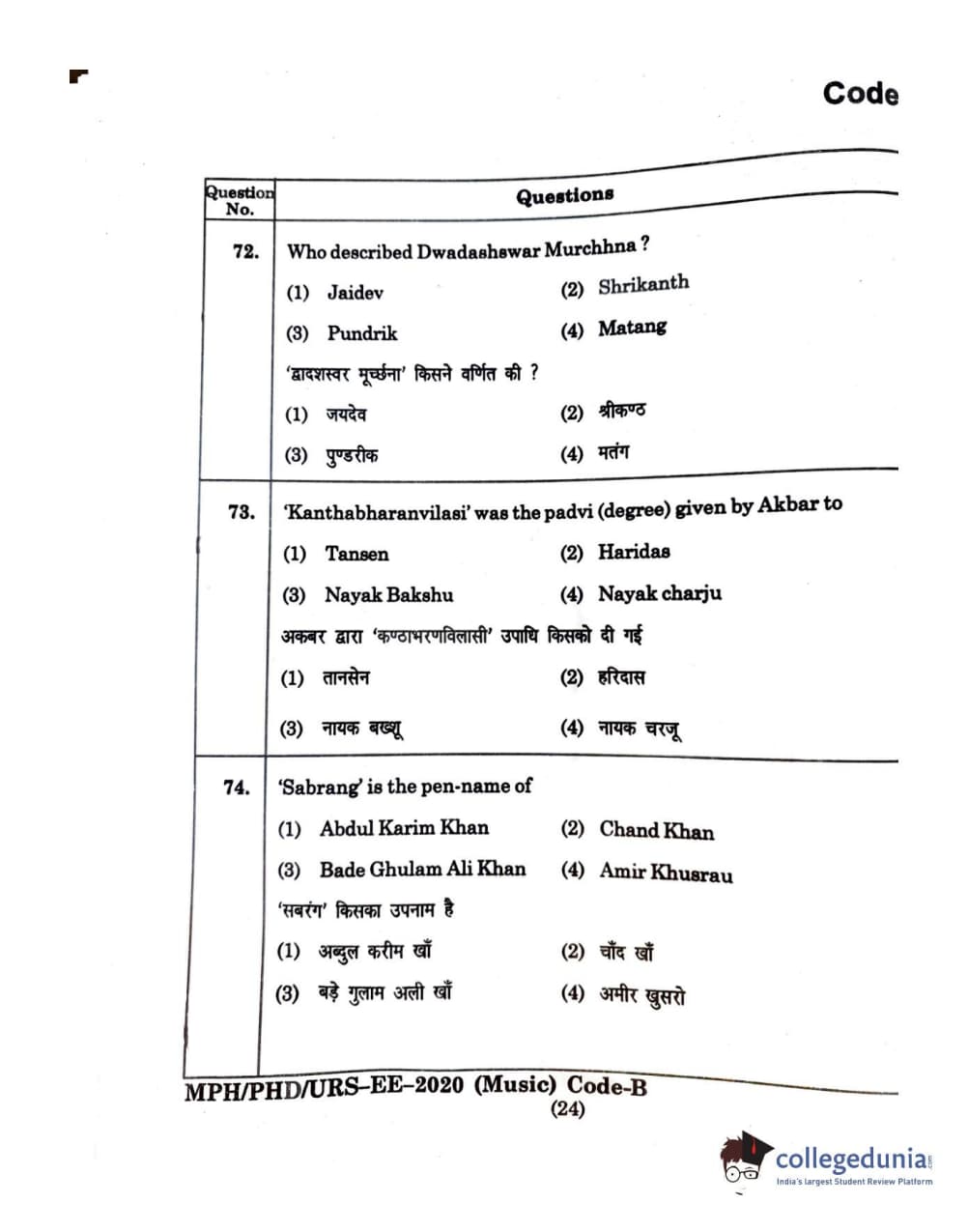 MDUCEE 2020 M.Phil/Ph.D/URS - Music Question Paper with Answer Key PDFs