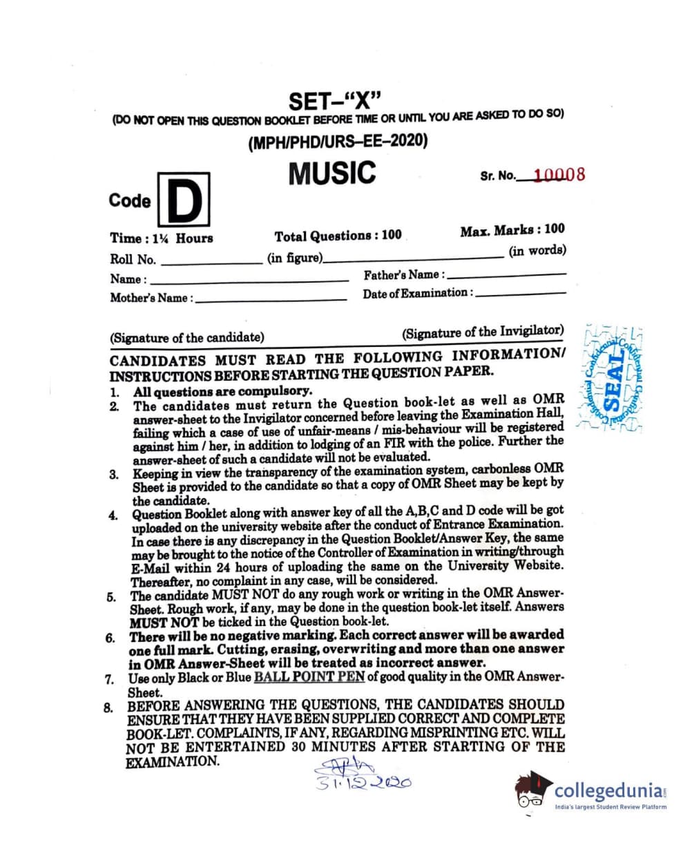 MDUCEE 2020 M.Phil/Ph.D/URS - Music Set D Question paper with answer key pdf is available for download. The exam was successfully organized by Maharishi Dayanand University. The question paper comprised a total of 100 questions.