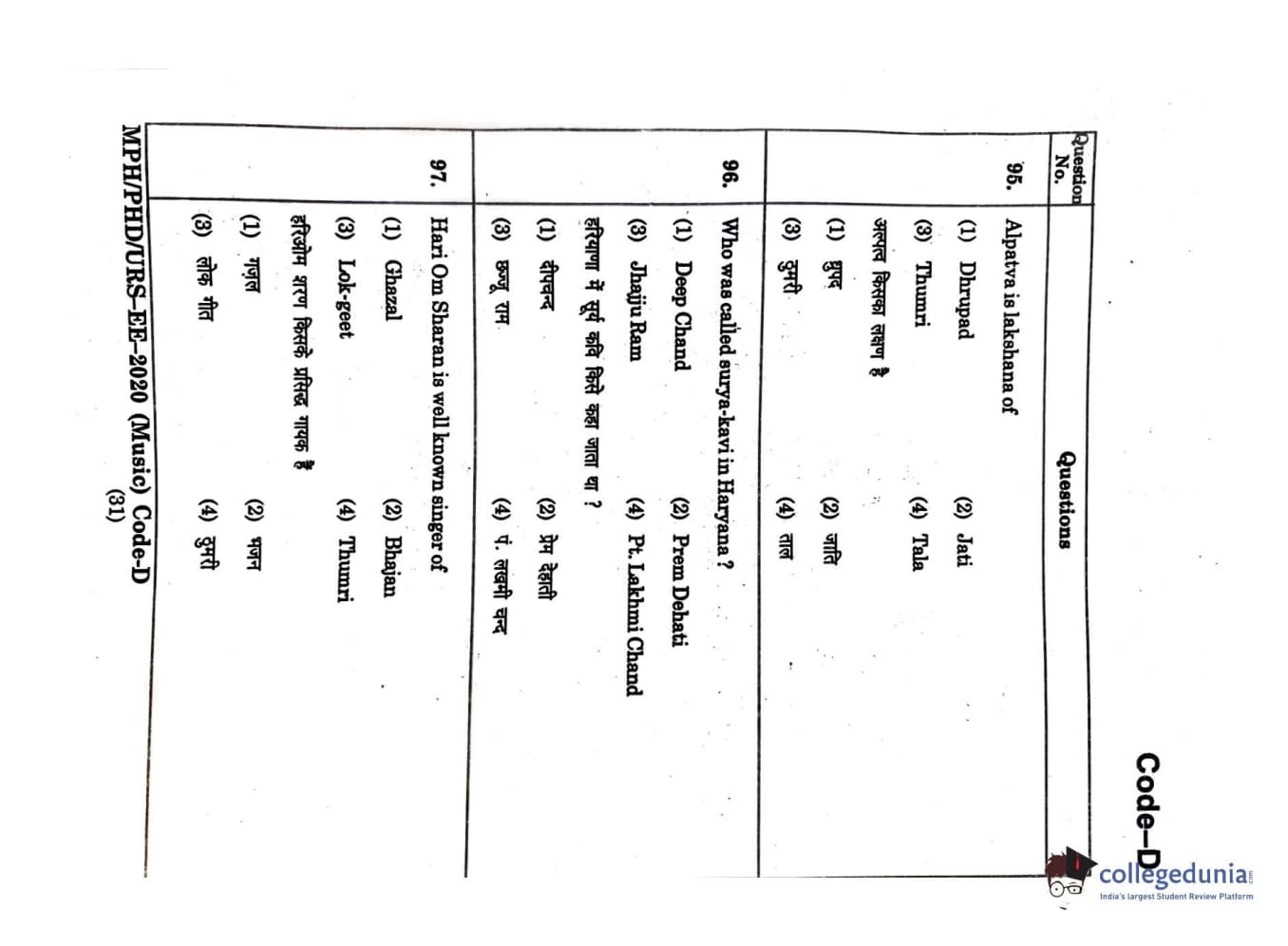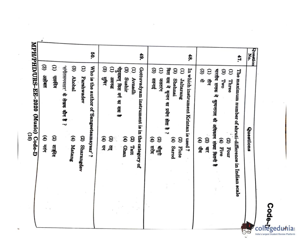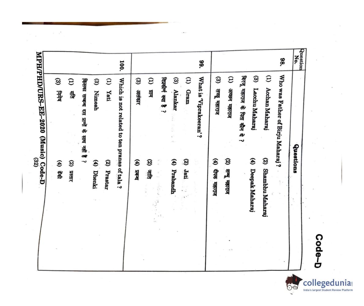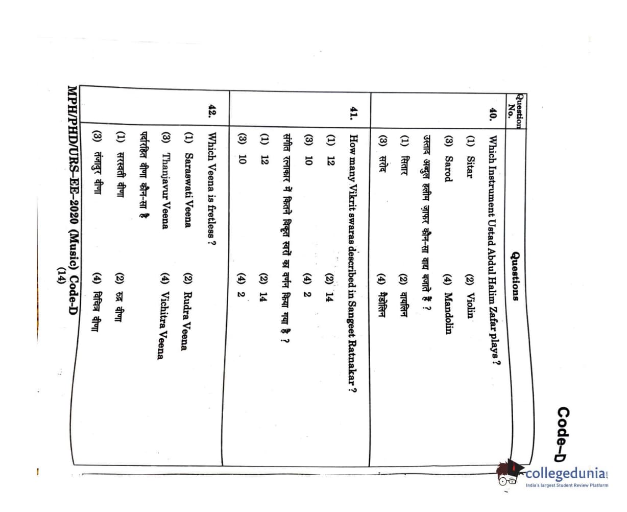 MDUCEE 2020 M.Phil/Ph.D/URS - Music Set D Question Paper with Answer Key PDFs