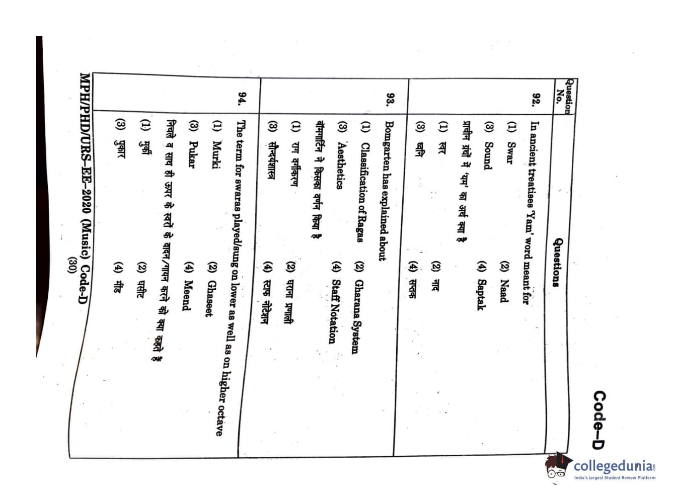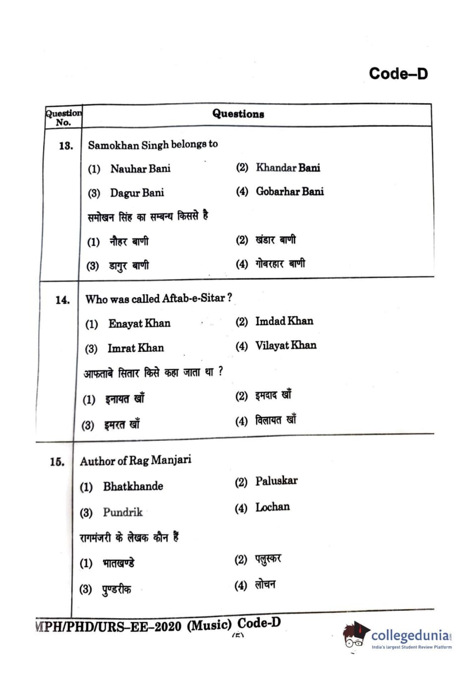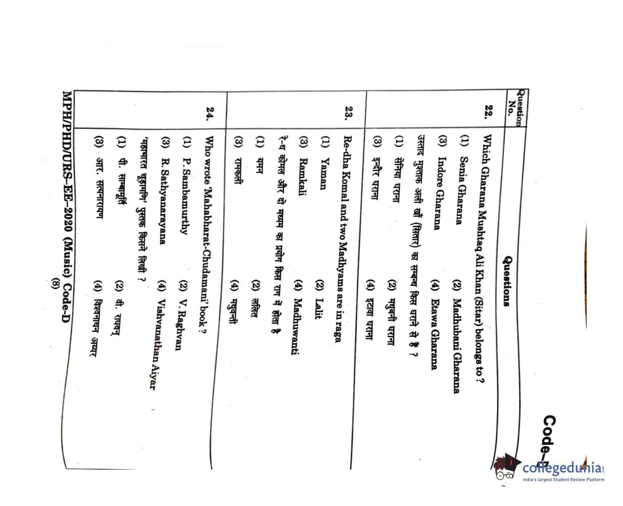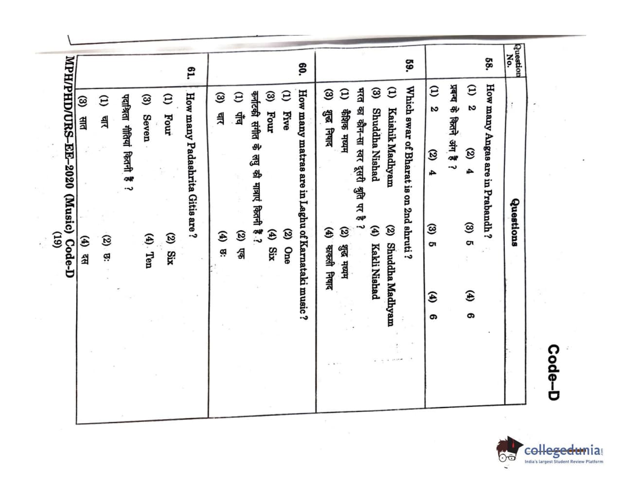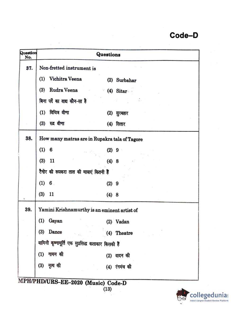 MDUCEE 2020 M.Phil/Ph.D/URS - Music Set D Question Paper with Answer Key PDFs