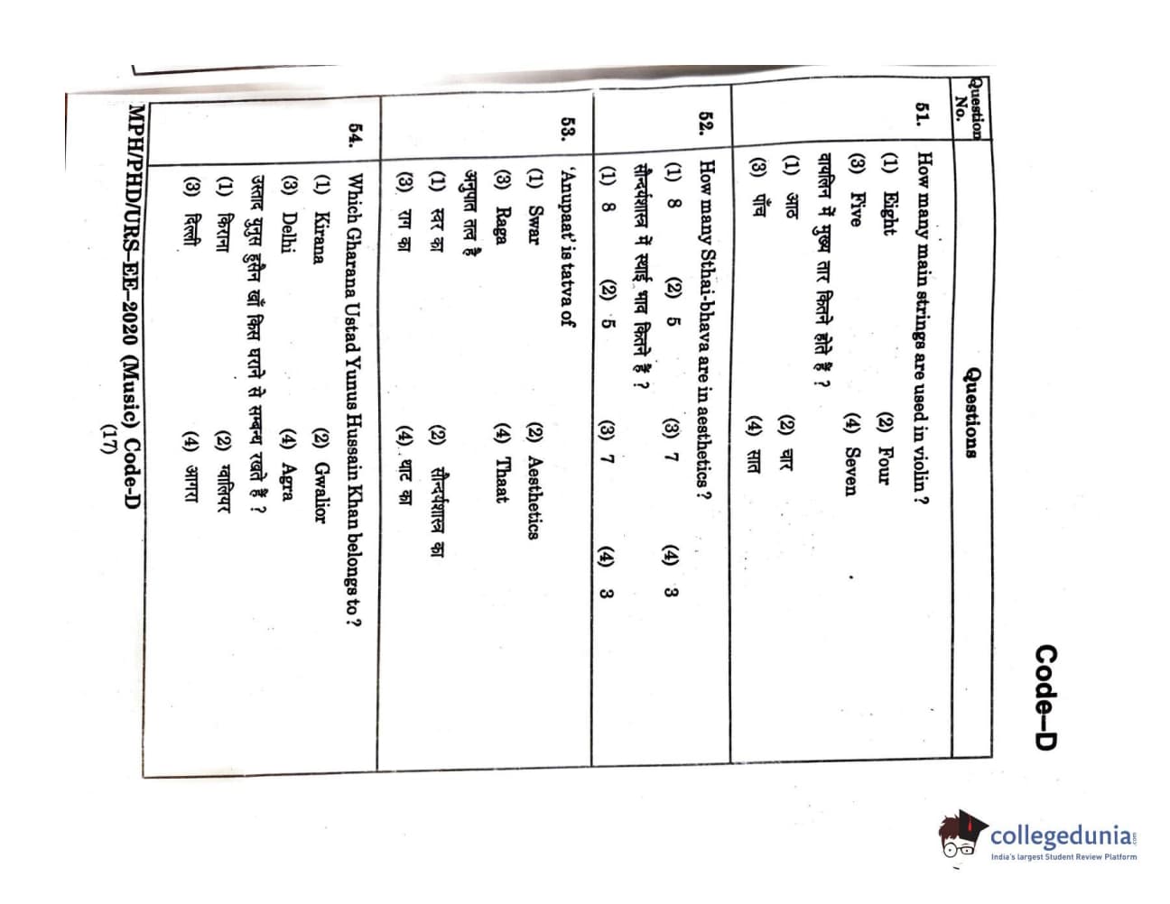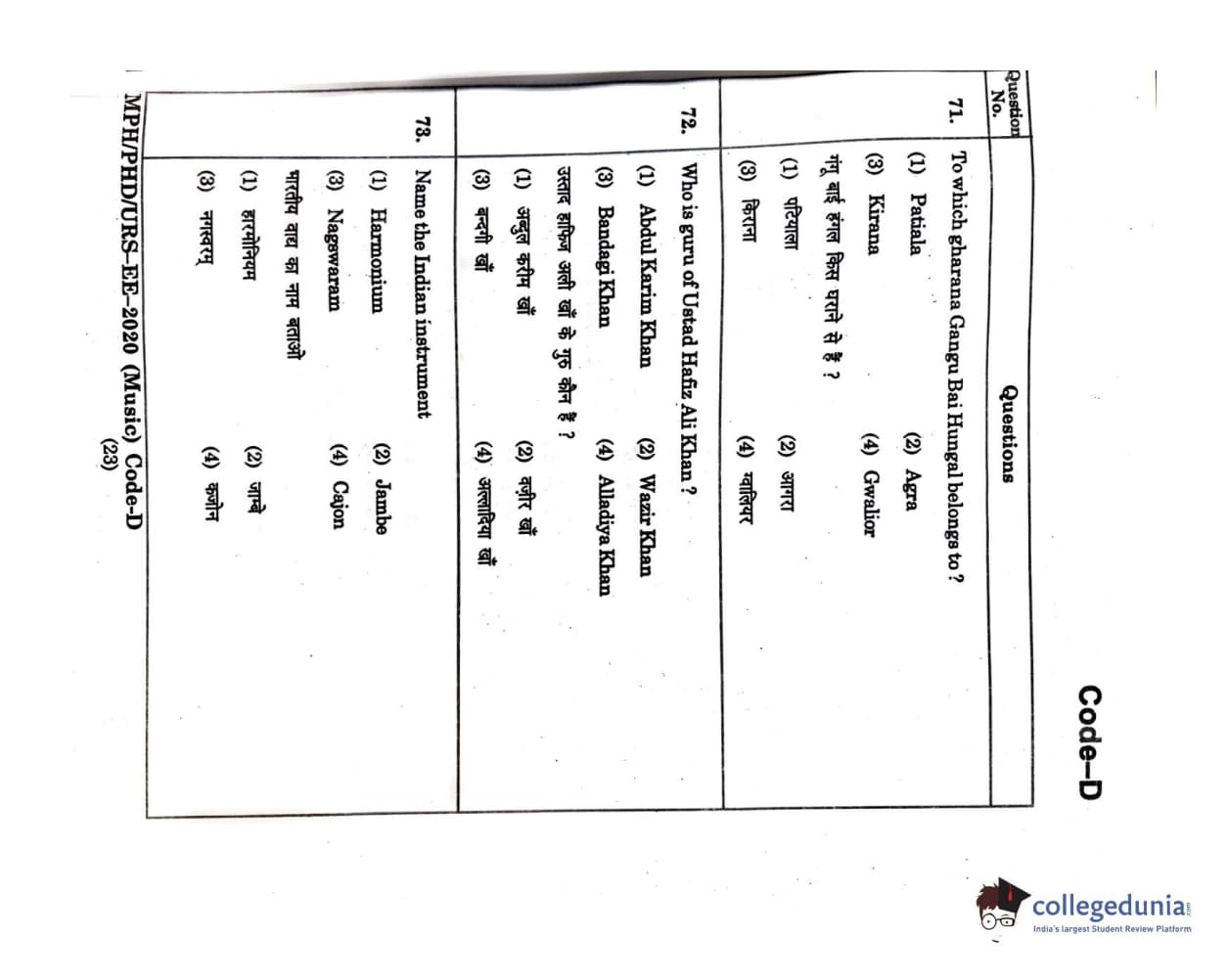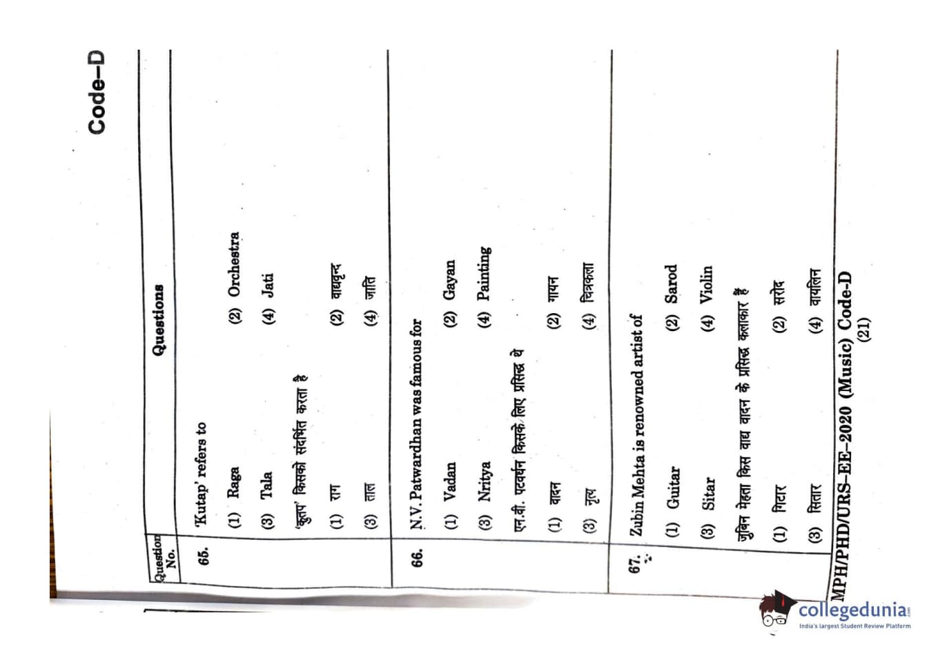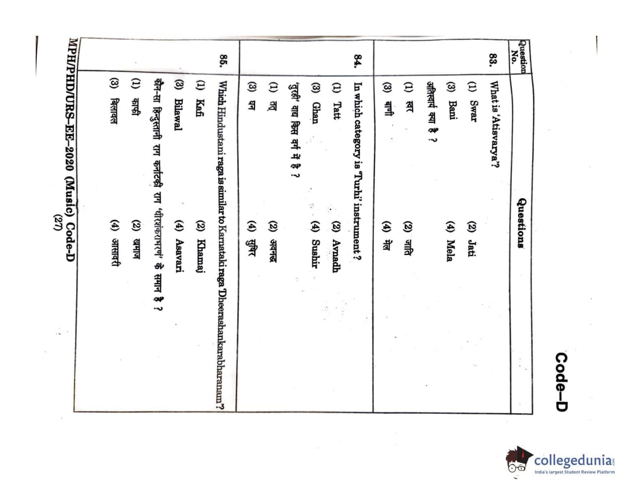 MDUCEE 2020 M.Phil/Ph.D/URS - Music Set D Question Paper with Answer Key PDFs