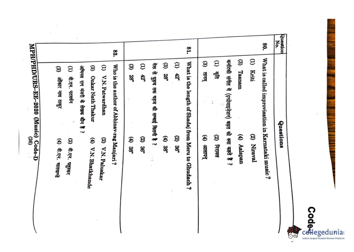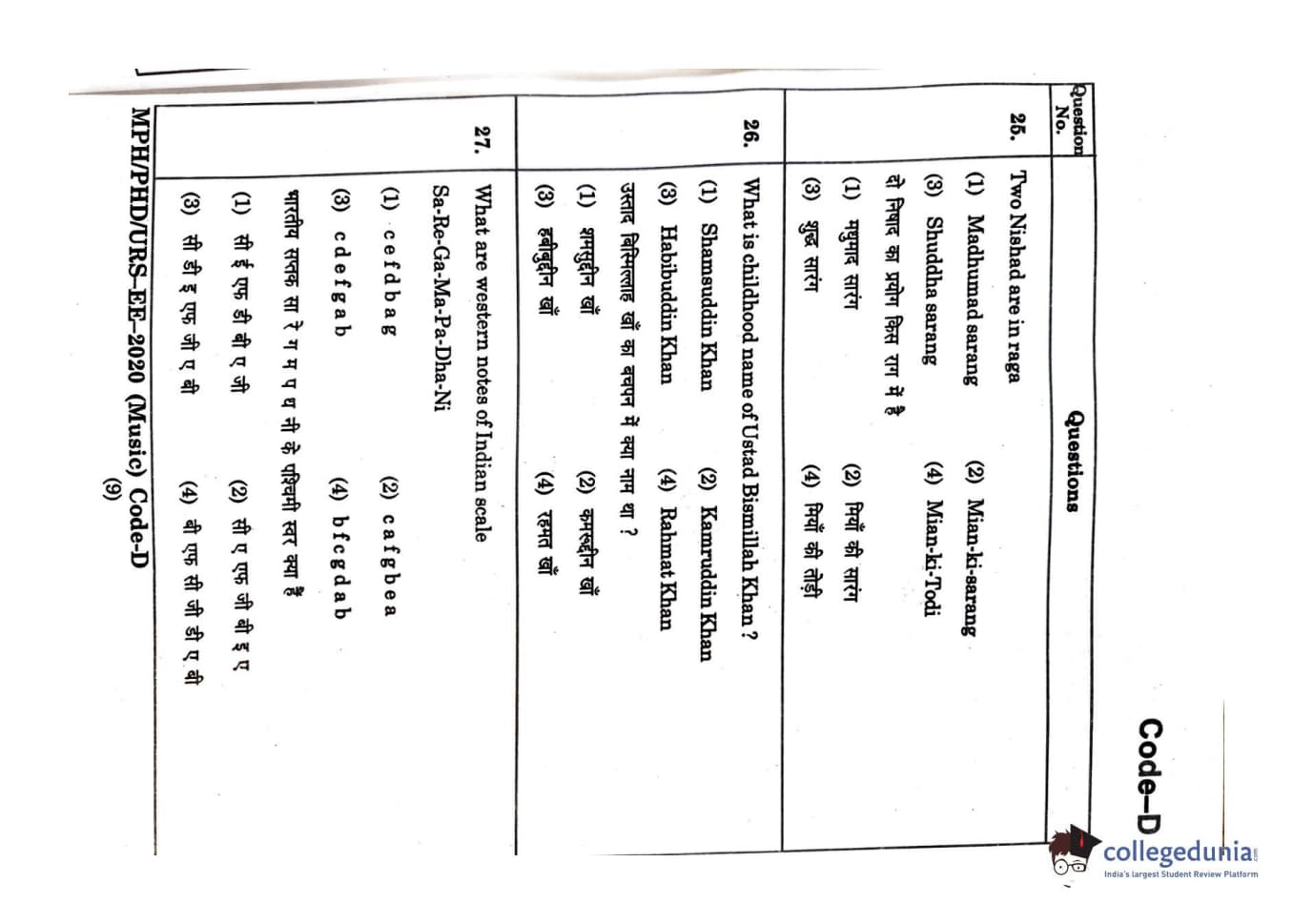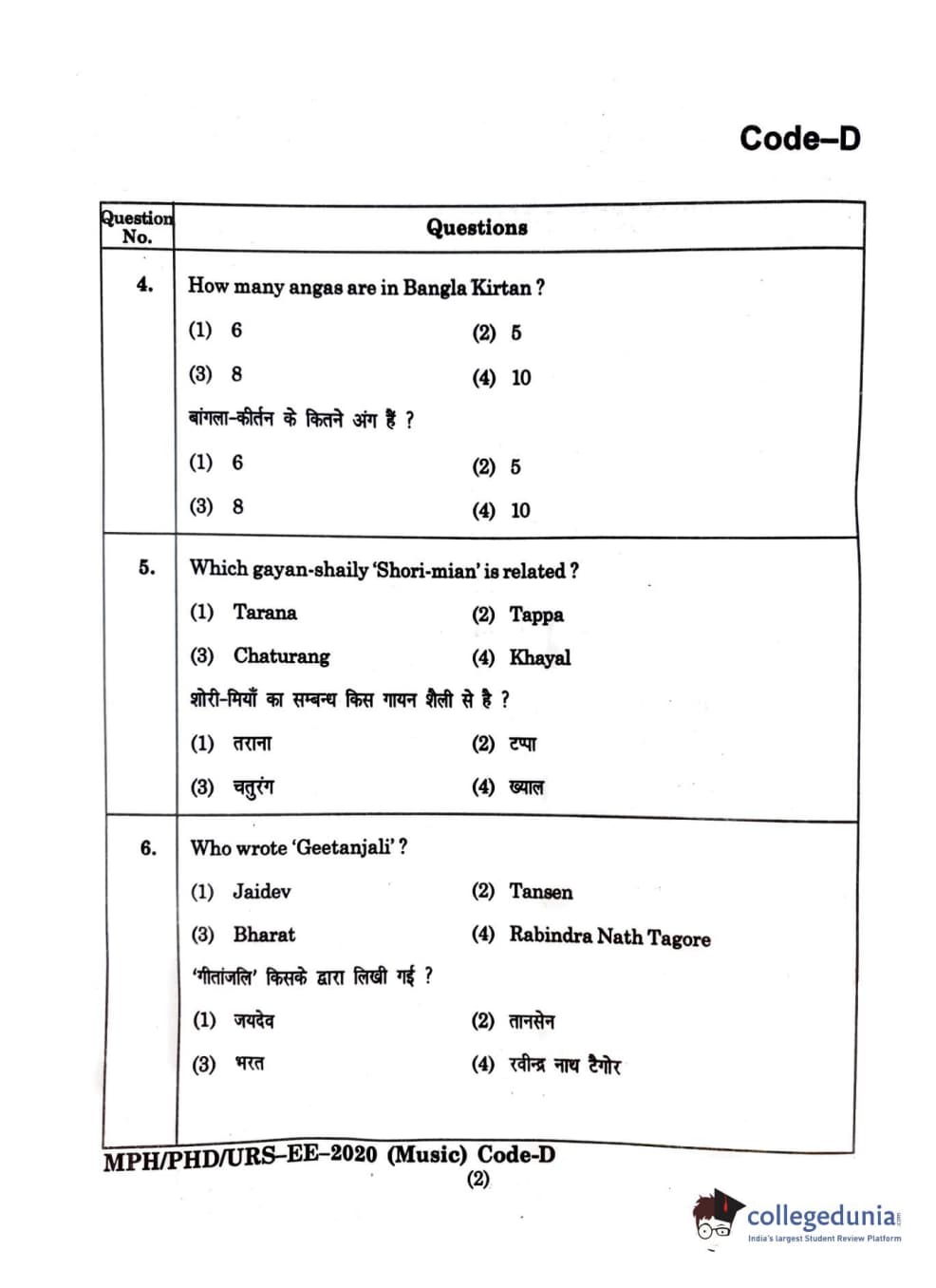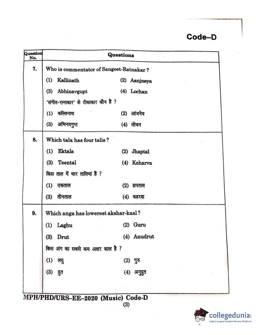 MDUCEE 2020 M.Phil/Ph.D/URS - Music Set D Question Paper with Answer Key PDFs