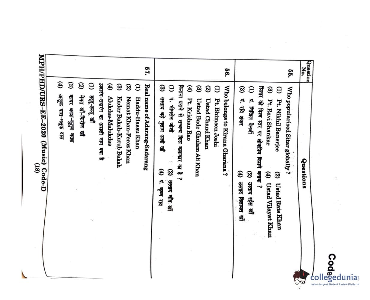 | MDUCEE 2020 M.Phil/Ph.D/URS - Music Set D Question Paper PDF | MDUCEE 2020 M.Phil/Ph.D/URS - Music Set D Answer Key PDF |