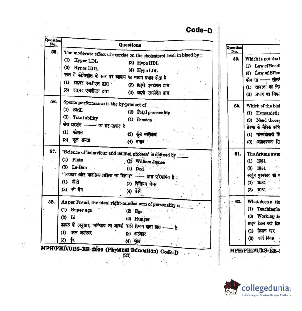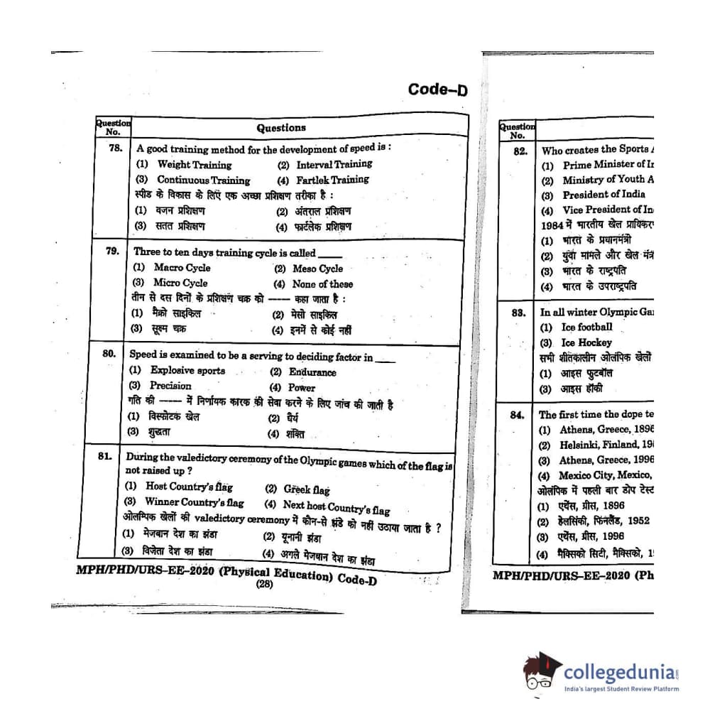 MDUCEE 2020 M.Phil/Ph.D/URS - Physical Education Set D Question Paper with Answer Key PDFs