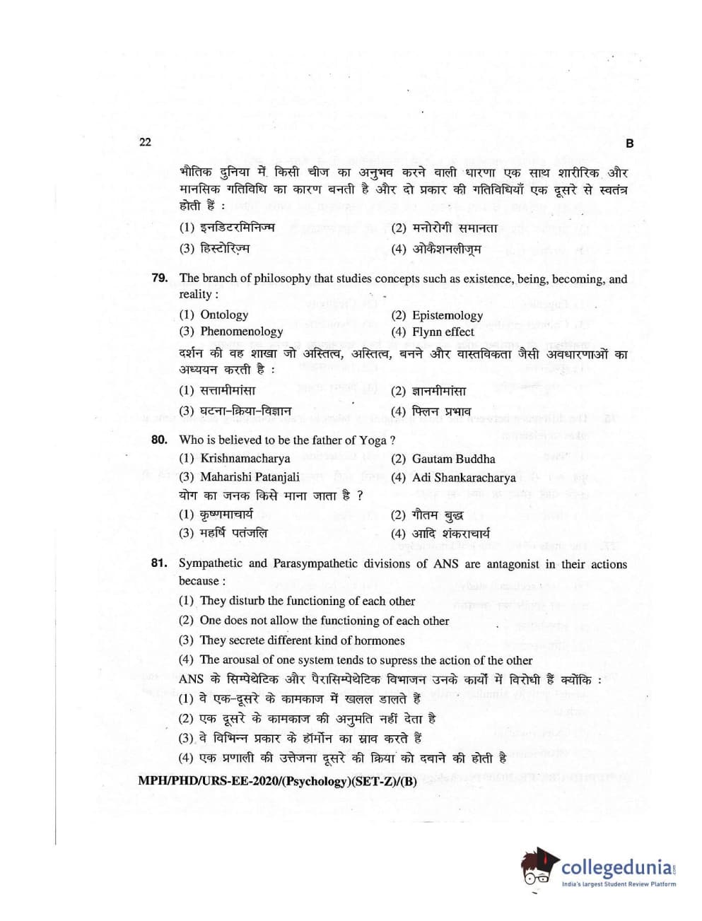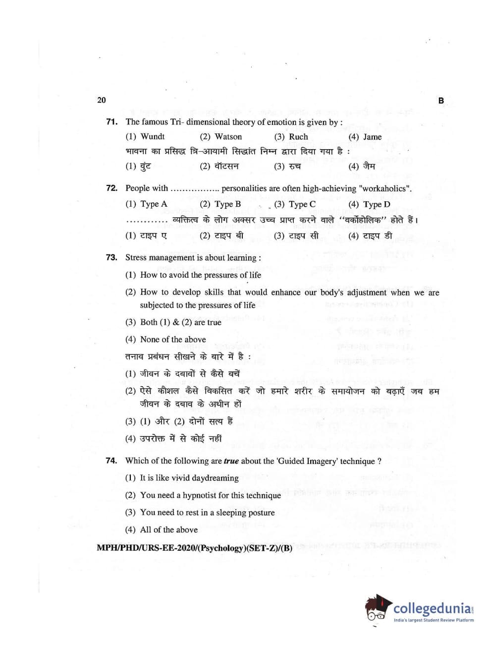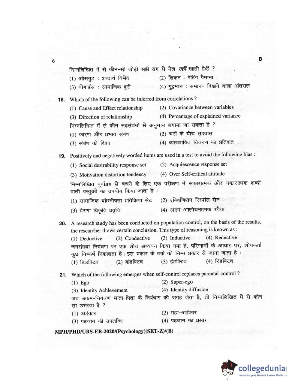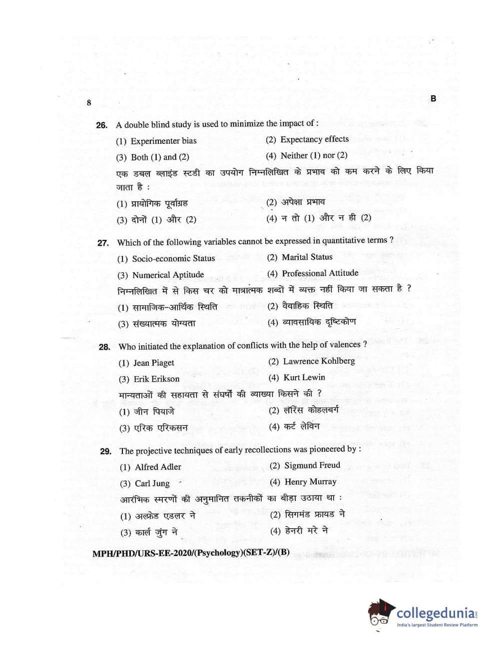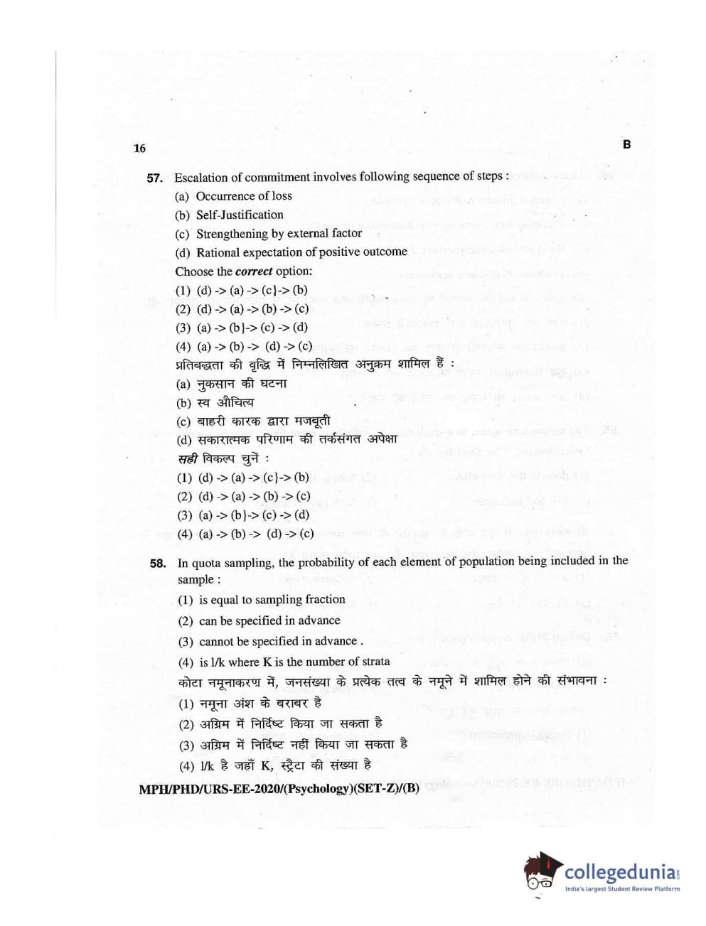 MDUCEE 2020 M.Phil/Ph.D/URS – Psychology Set B Question Paper with Answer Key PDFs