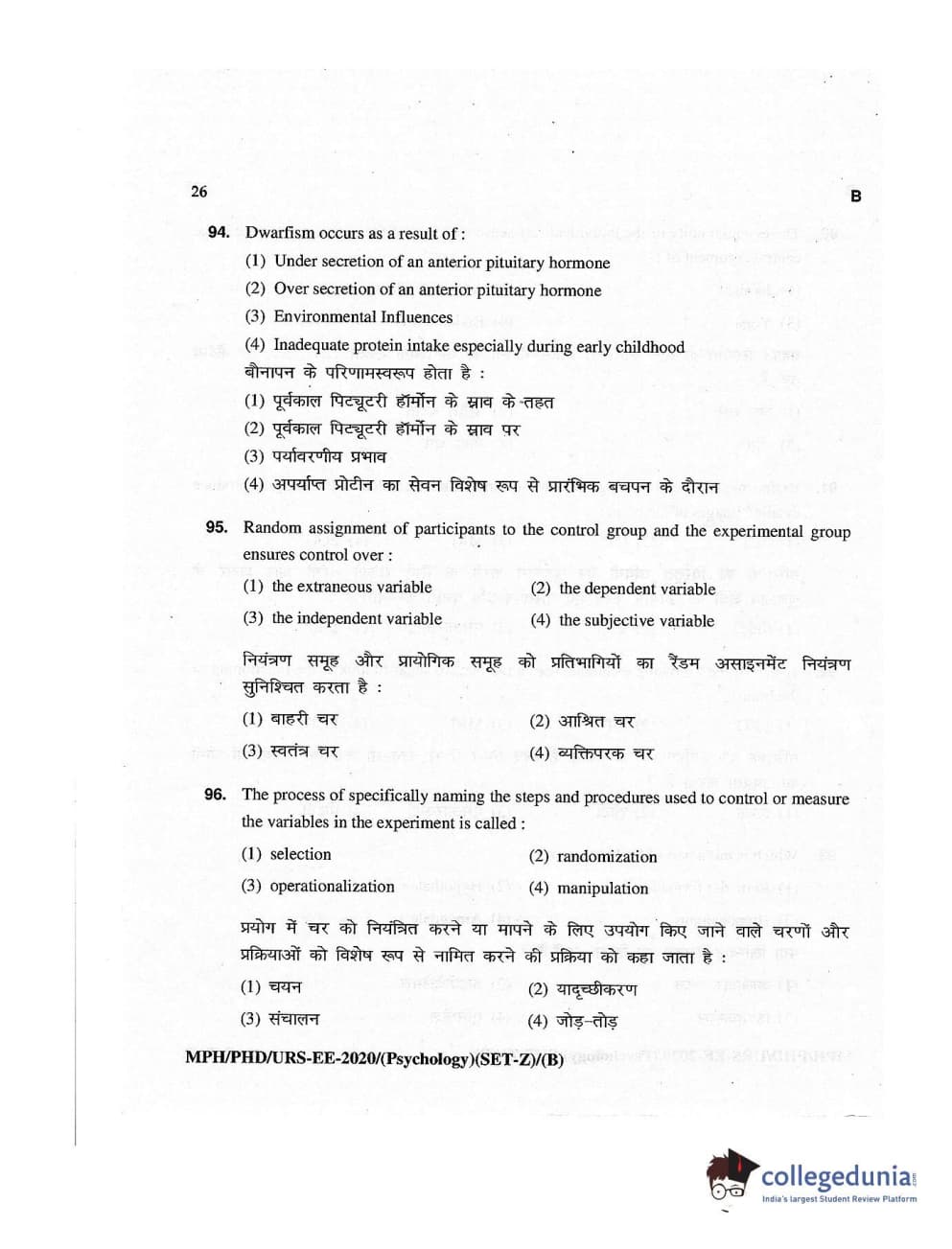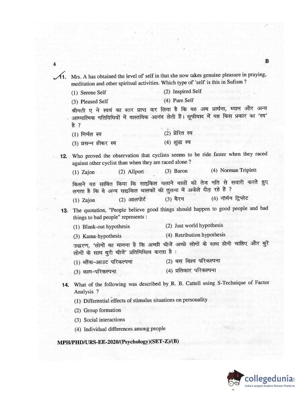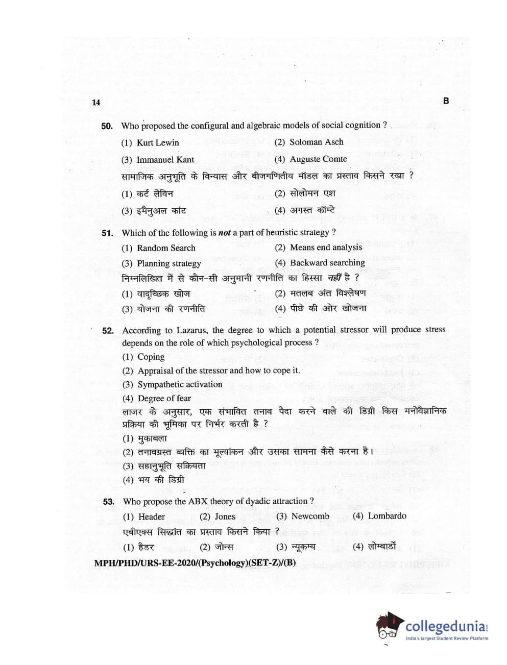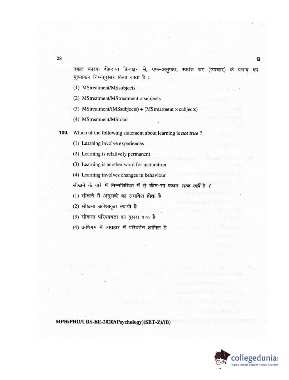 MDUCEE 2020 M.Phil/Ph.D/URS – Psychology Set B Question Paper with Answer Key PDFs