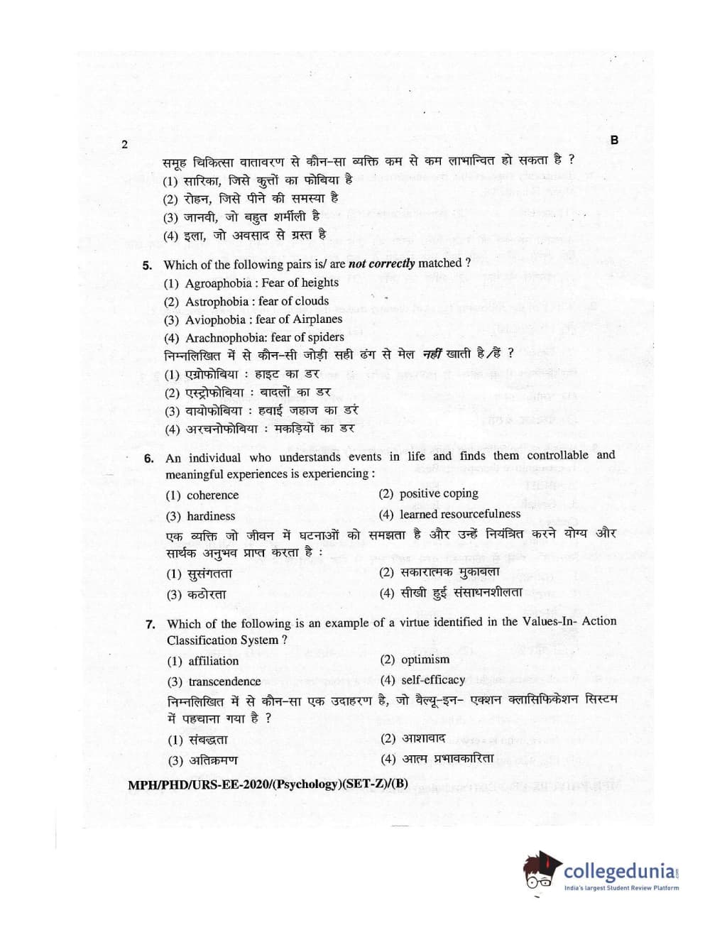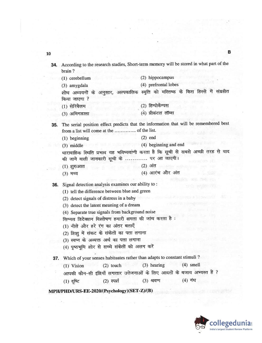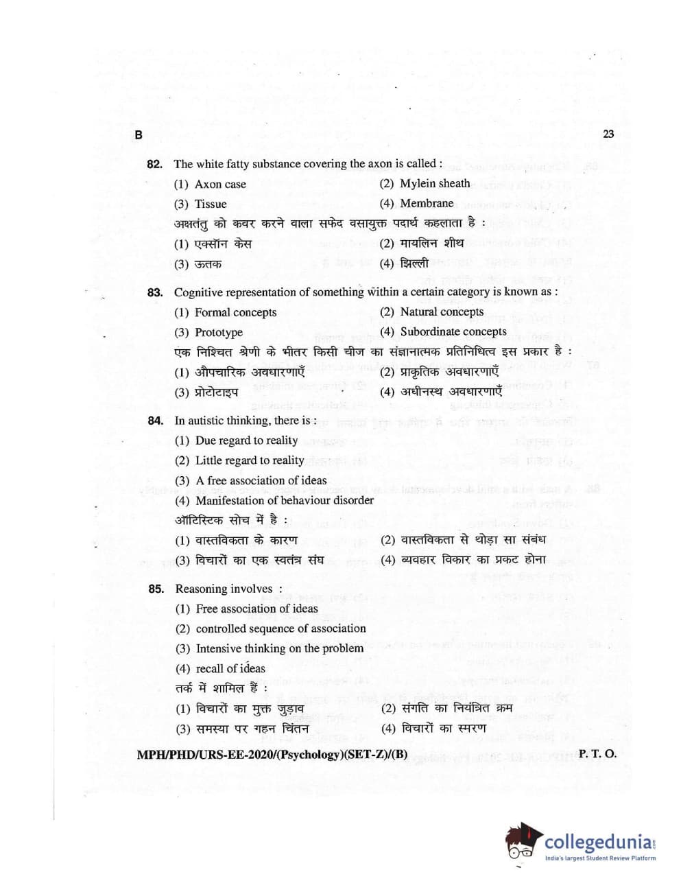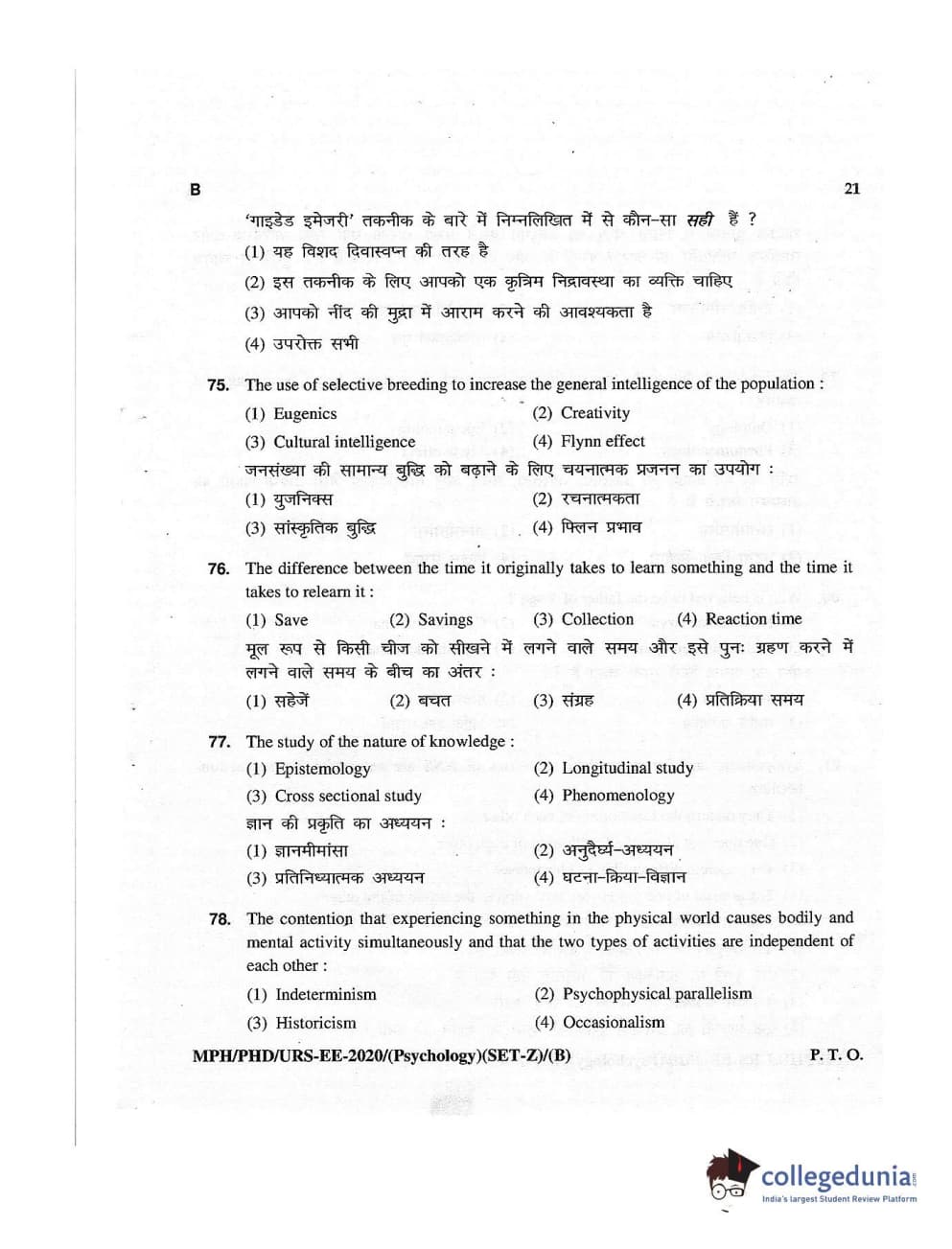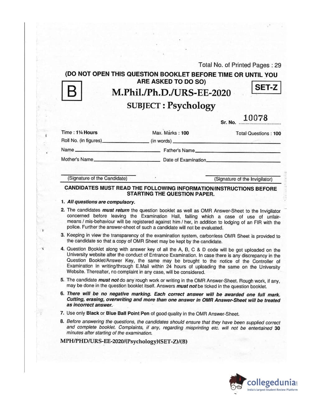 MDUCEE 2020 M.Phil/Ph.D/URS – Psychology Set B Question Paper with Answer Key PDFs