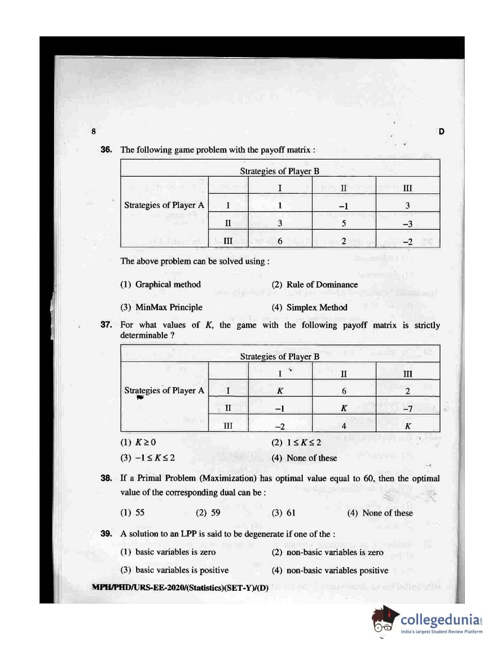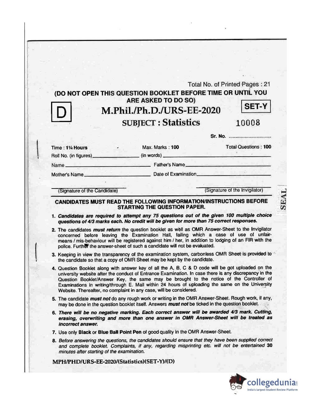 | MDUCEE 2020 M.Phil/Ph.D/URS - Statistics Set D Question Paper PDF | MDUCEE 2020 M.Phil/Ph.D/URS - Statistics Set D Answer Key PDF |