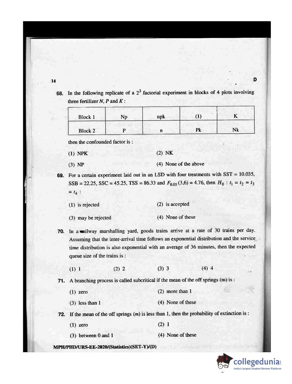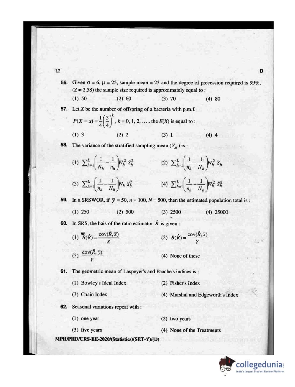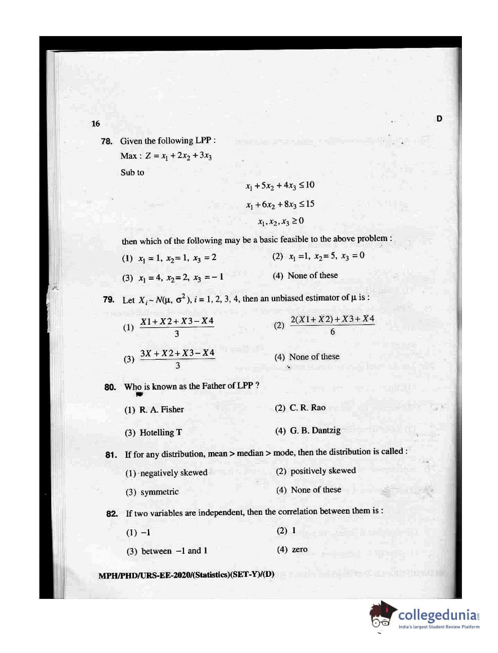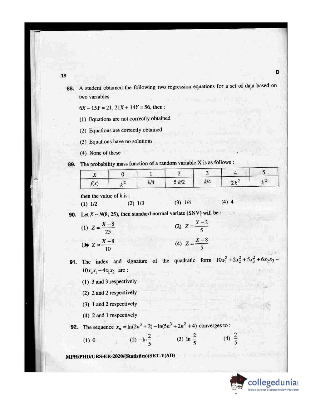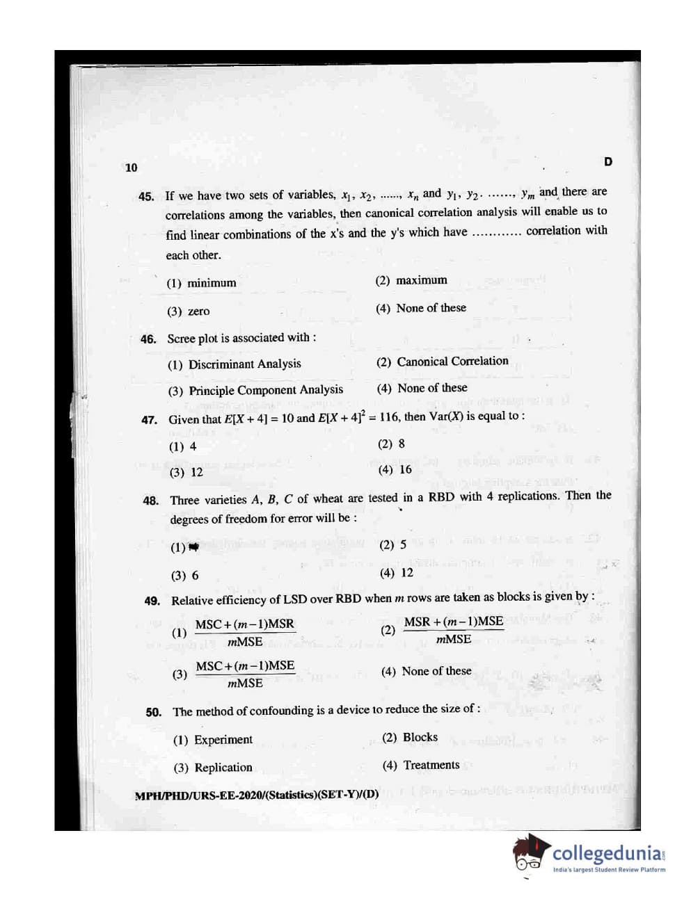 MDUCEE 2020 M.Phil/Ph.D/URS - Statistics Set D Question Paper with Answer Key PDFs