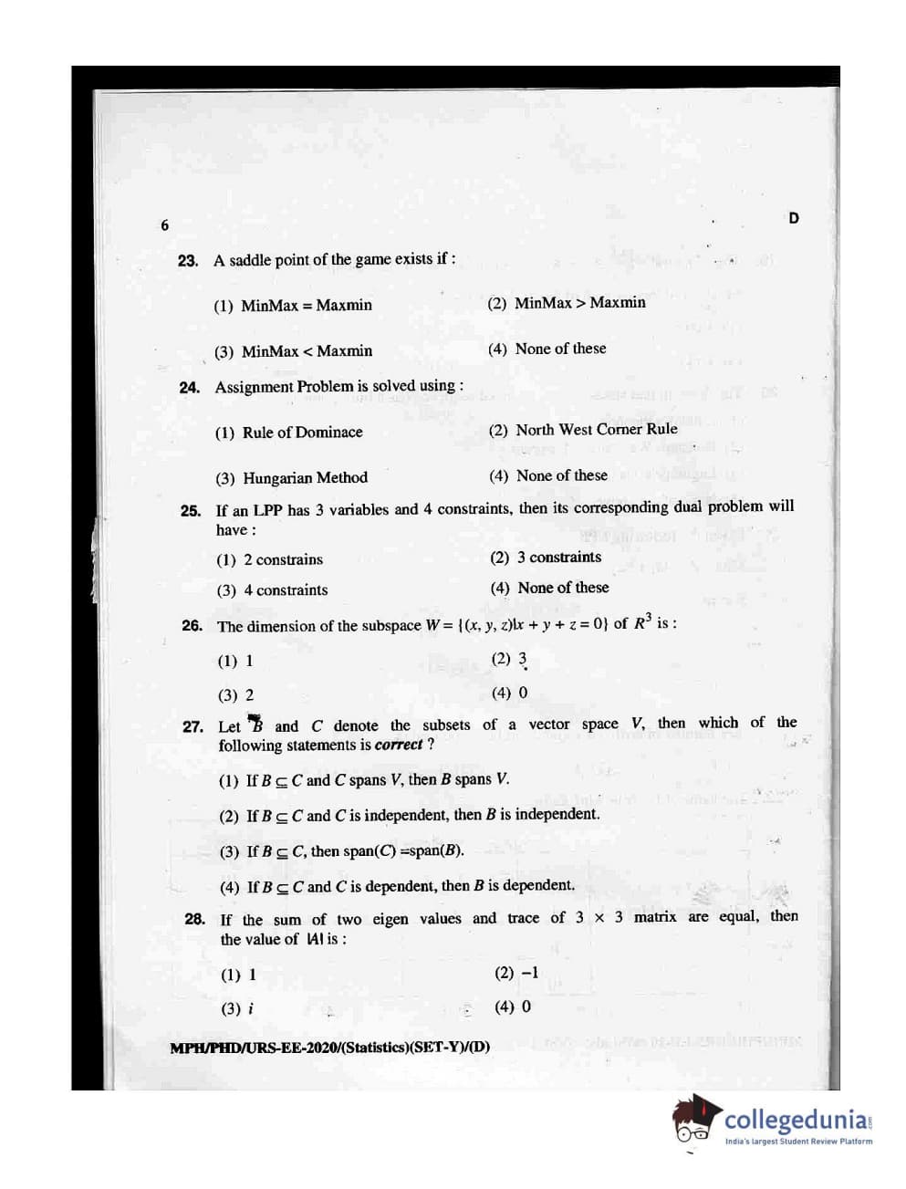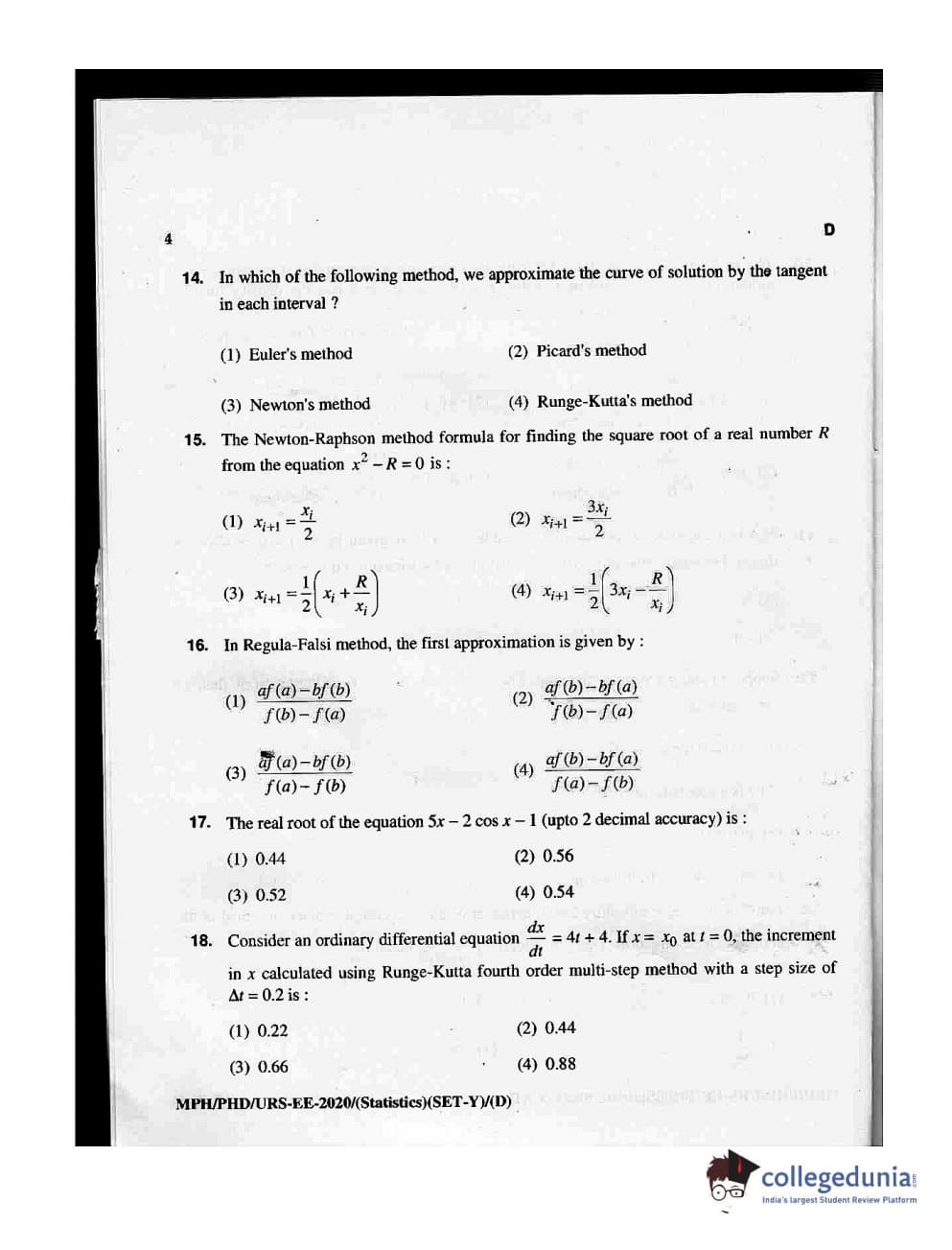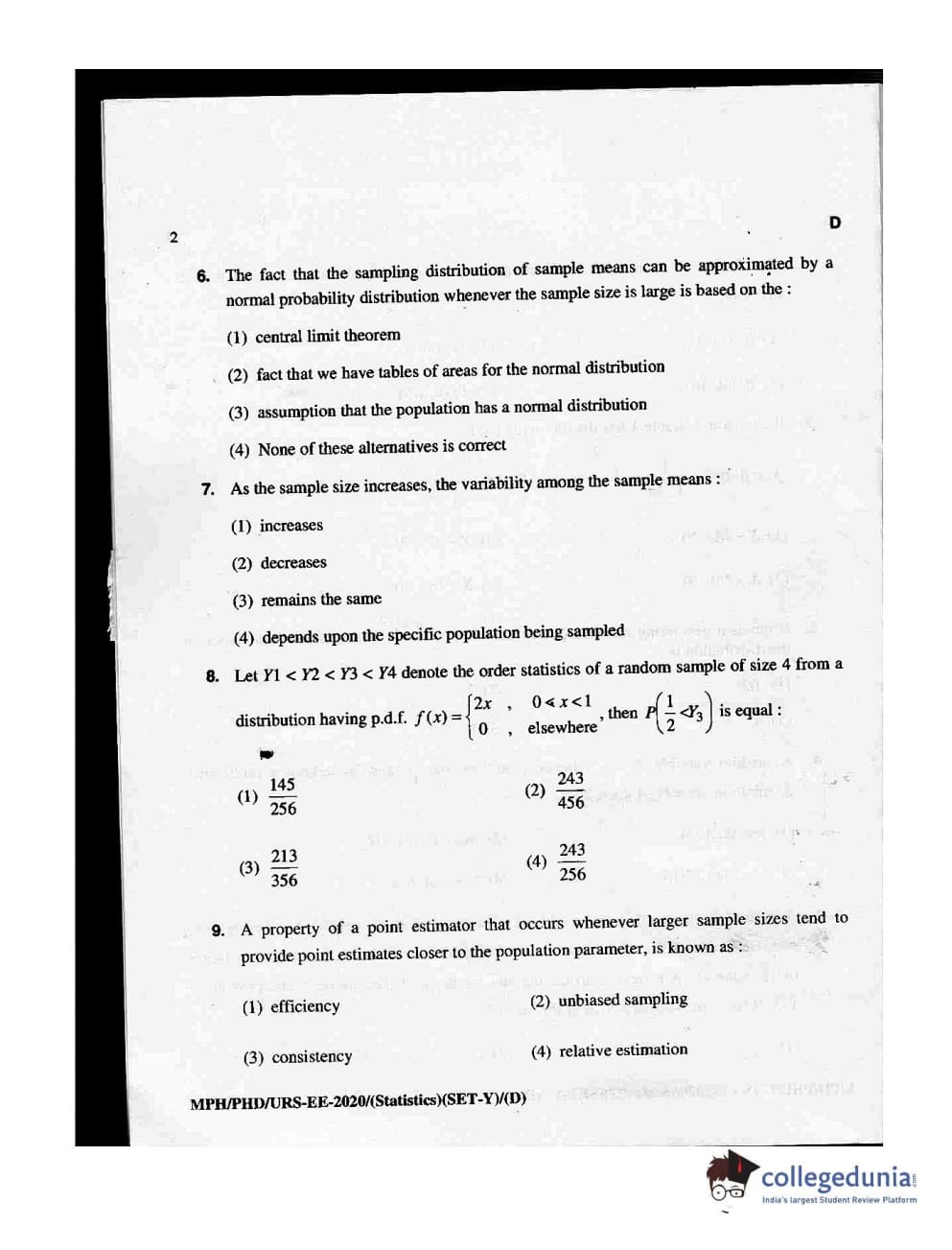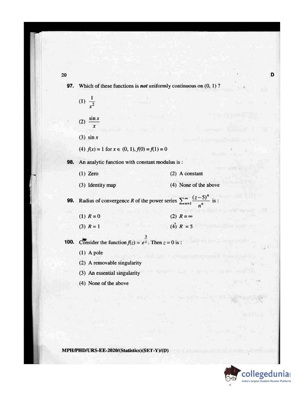 MDUCEE 2020 M.Phil/Ph.D/URS - Statistics Set D Question Paper with Answer Key PDFs