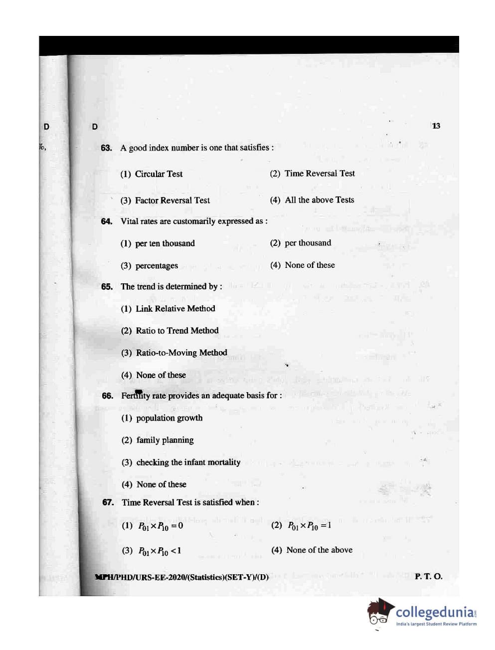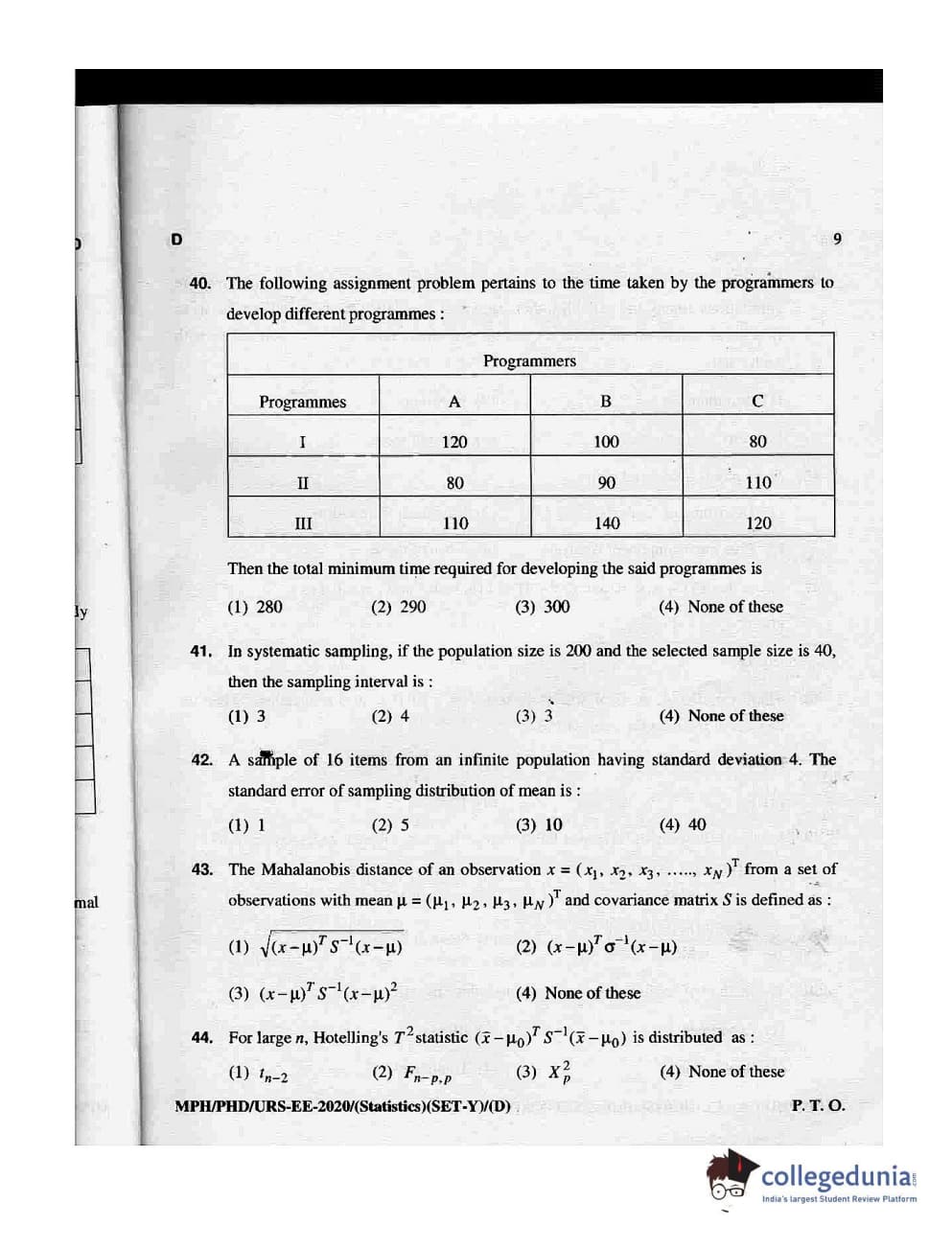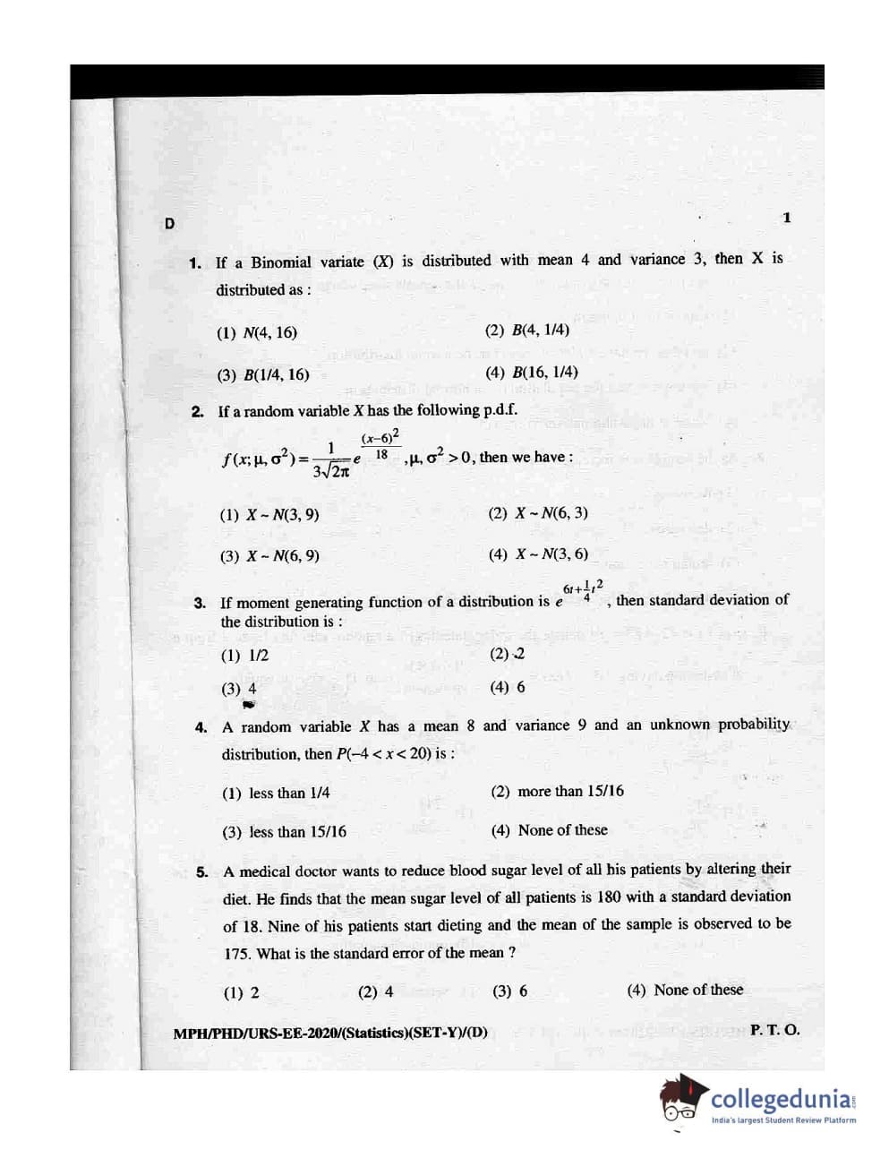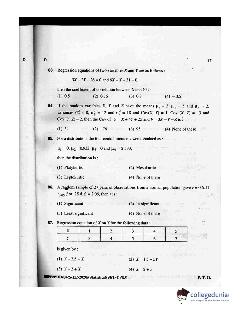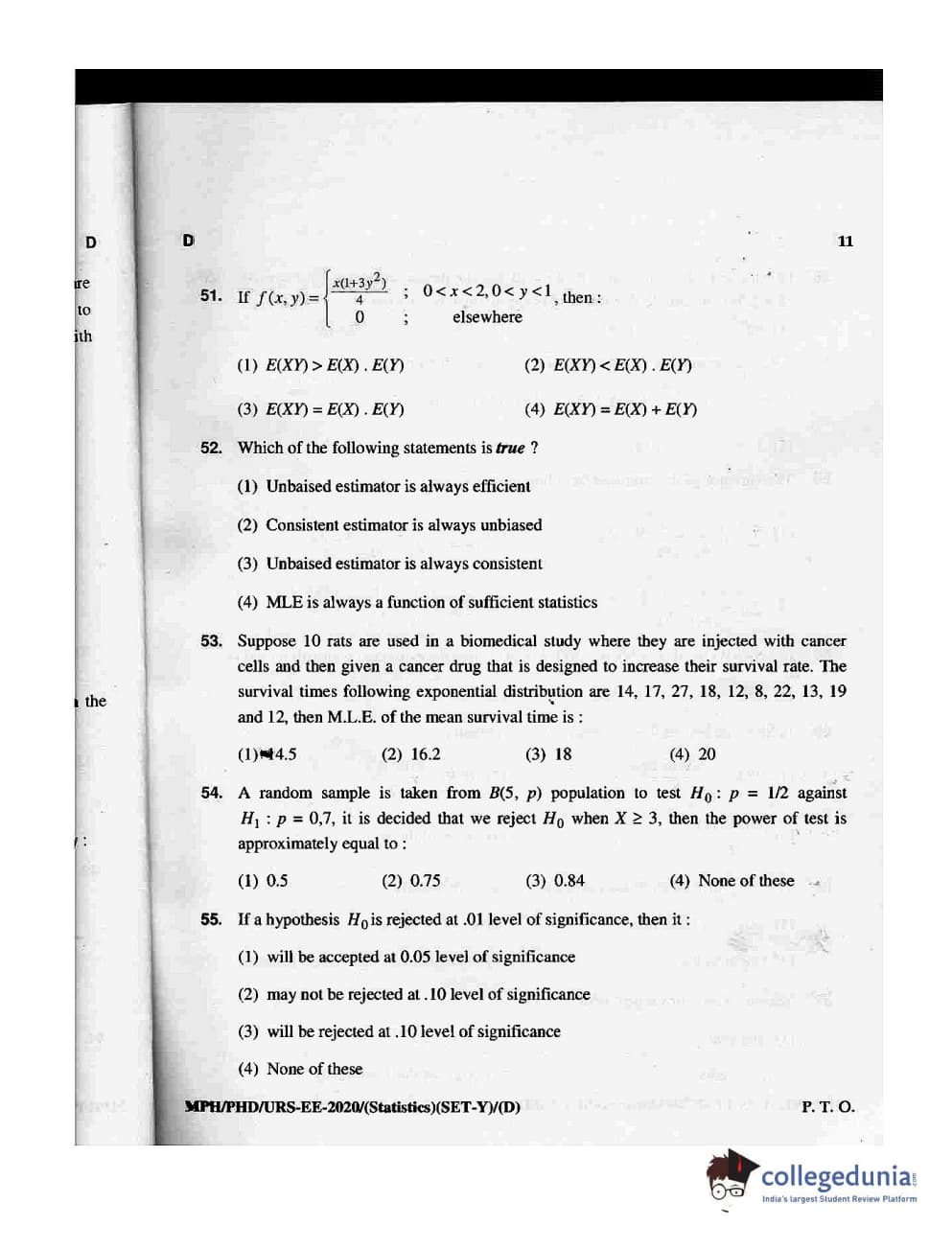 MDUCEE 2020 M.Phil/Ph.D/URS - Statistics Set D Question Paper with Answer Key PDFs