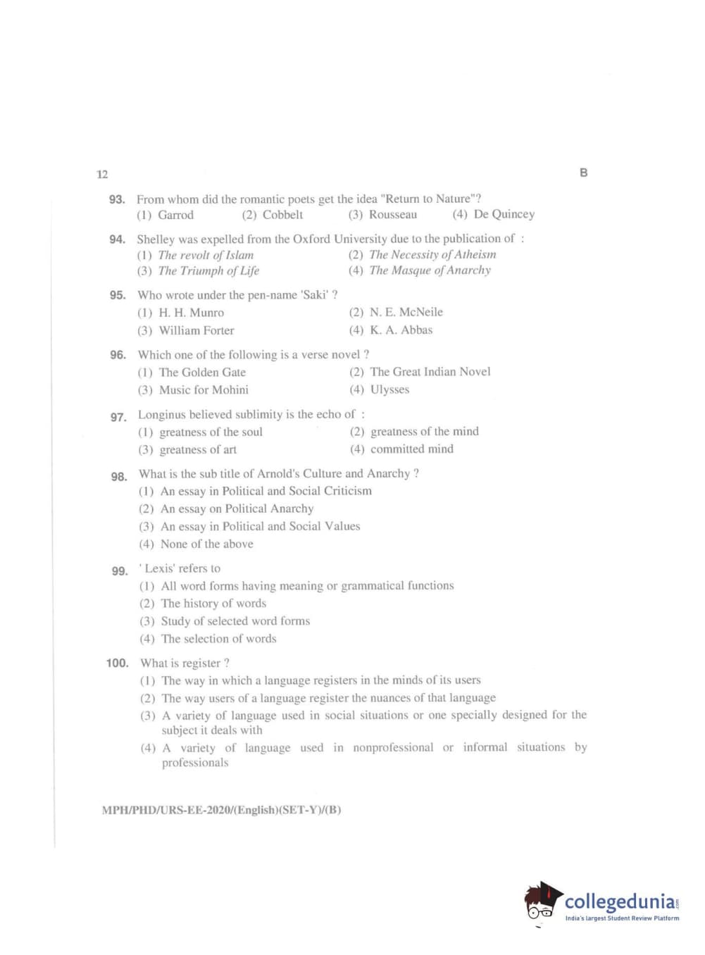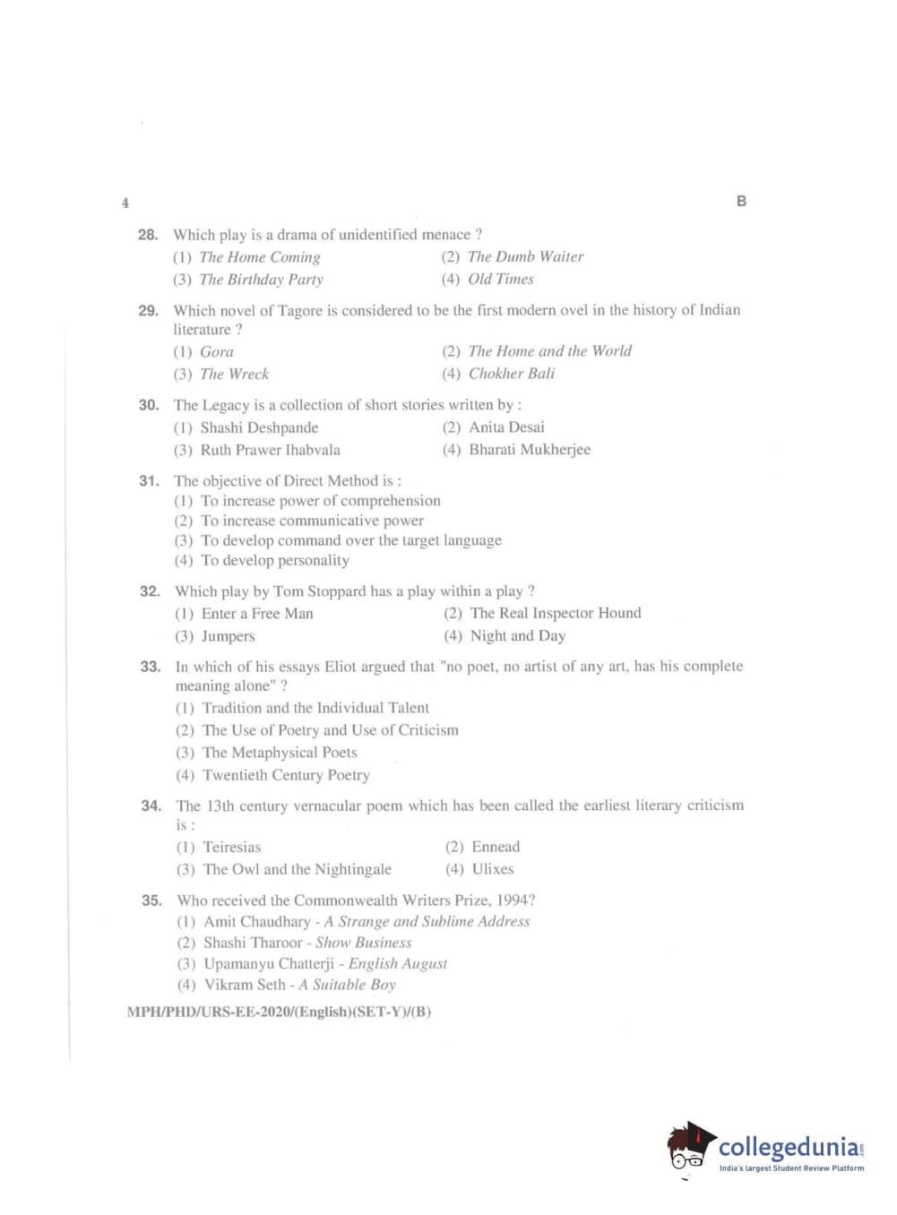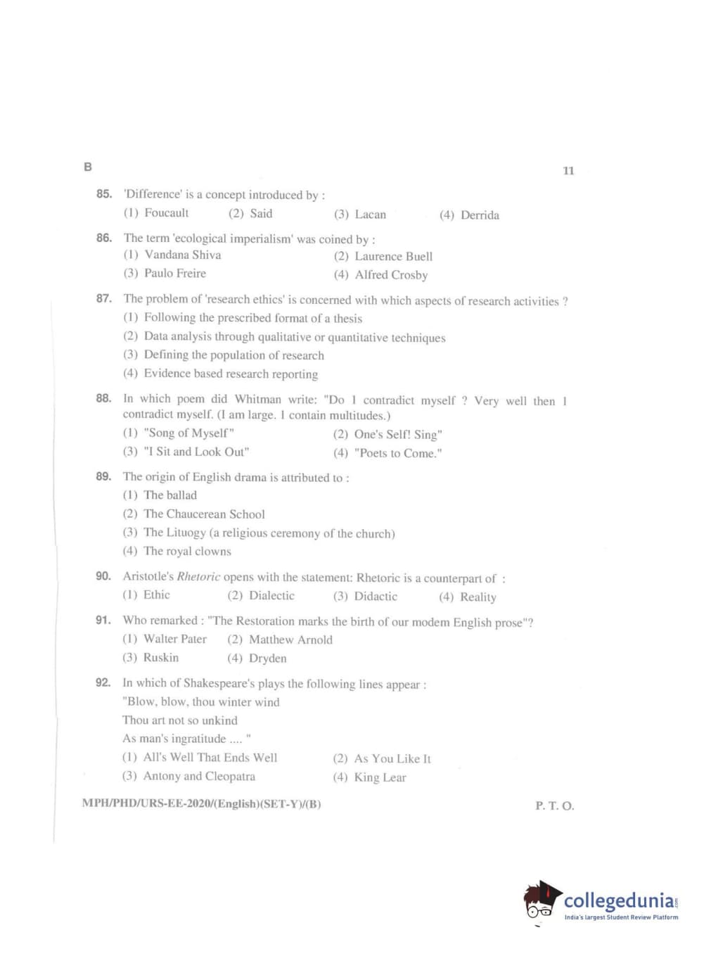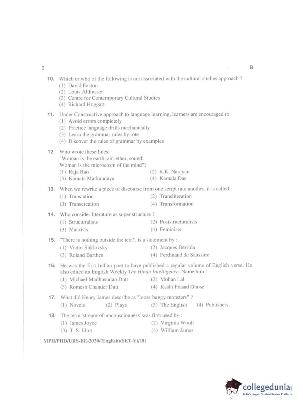 MDUCEE 2020 Ph.D./M.Phil./URS English Set B Question Paper with Answer Key PDFs