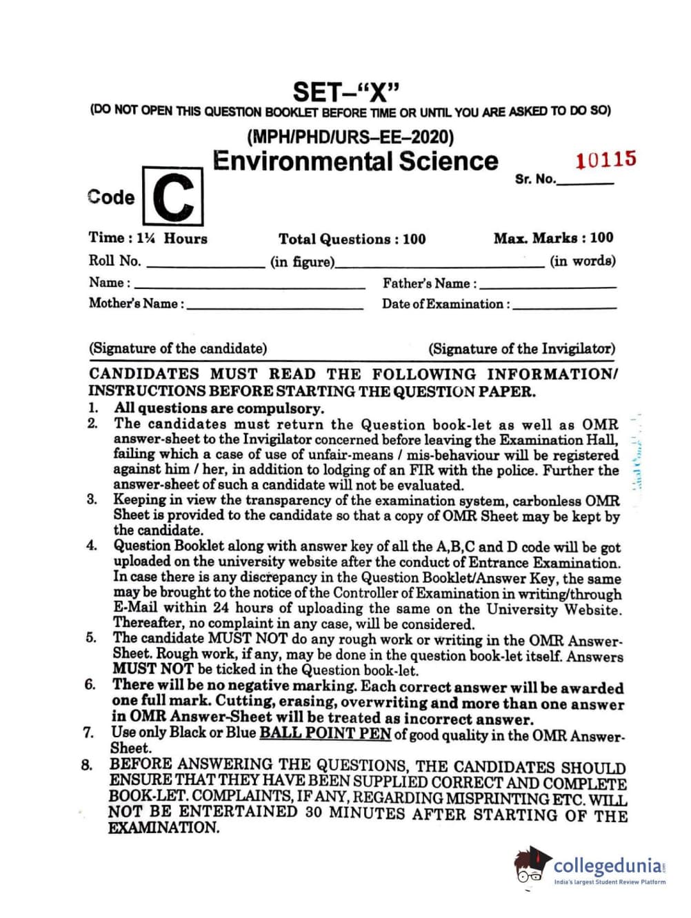 MDUCEE 2020 Ph.D./M.Phil./URS Environment Science Set C Question paper with answer key pdf is available for download. The exam was successfully organized by Maharishi Dayanand University. The question paper comprised a total of 100 questions.