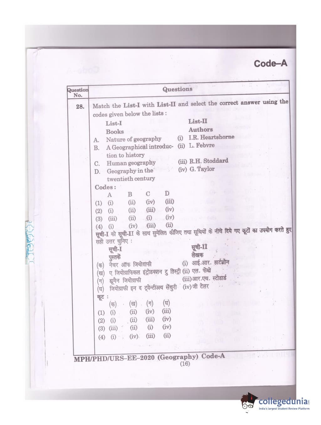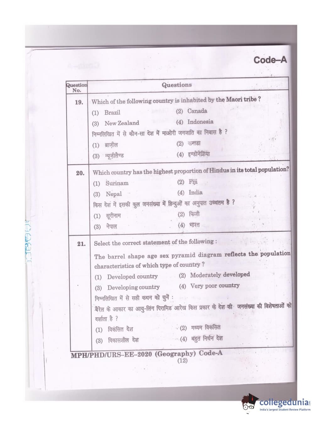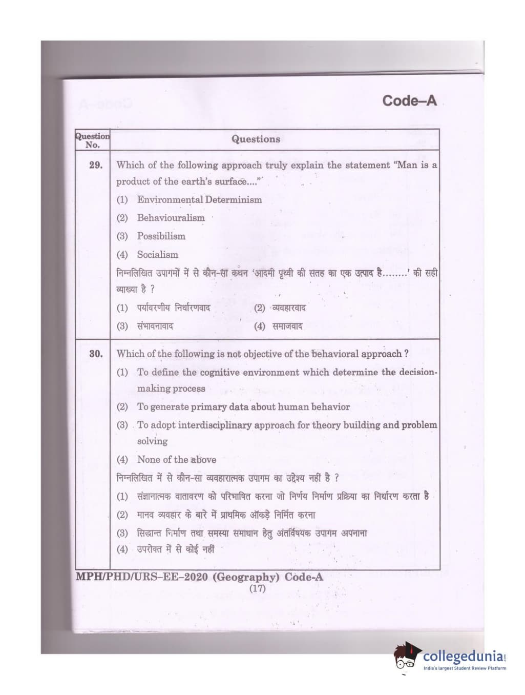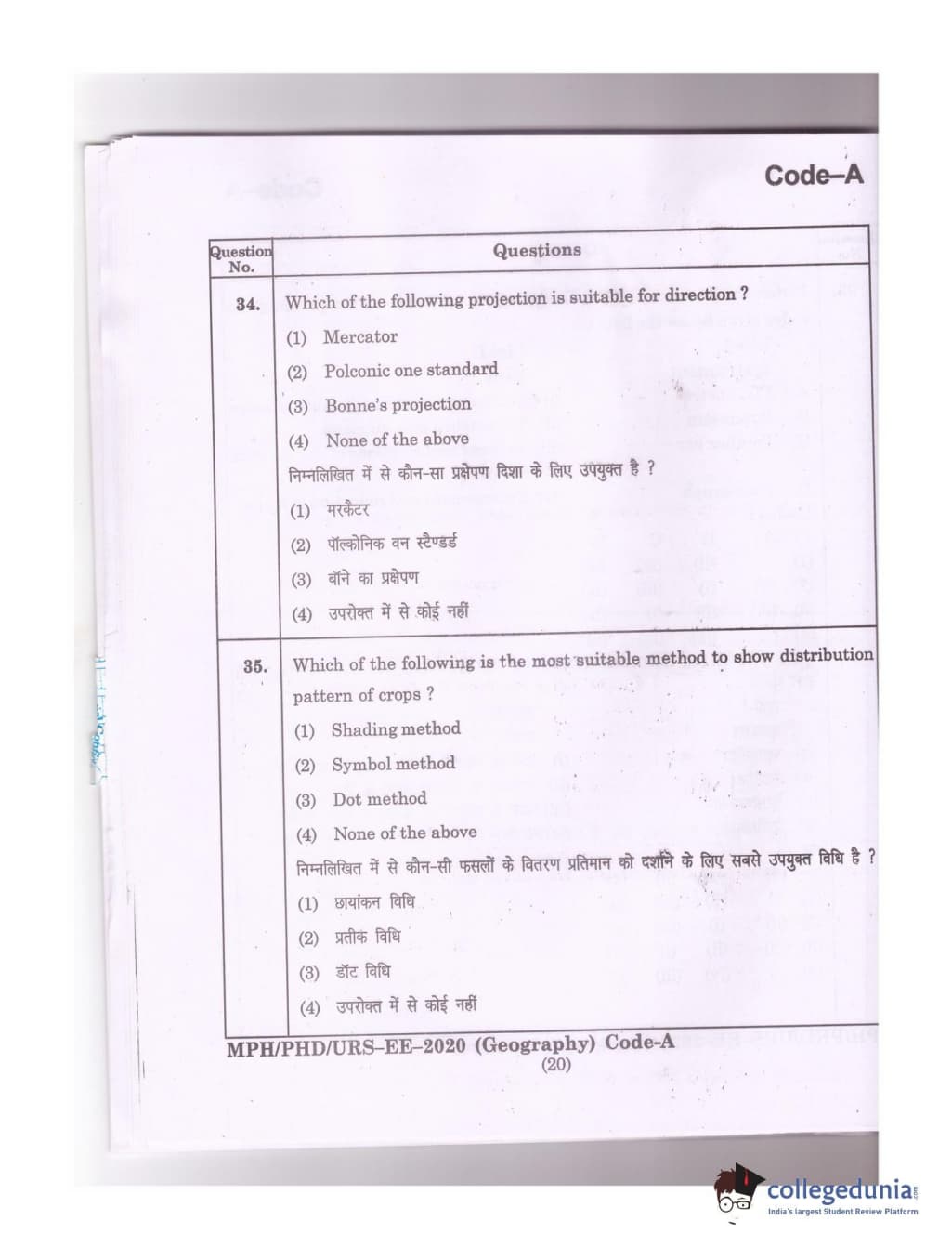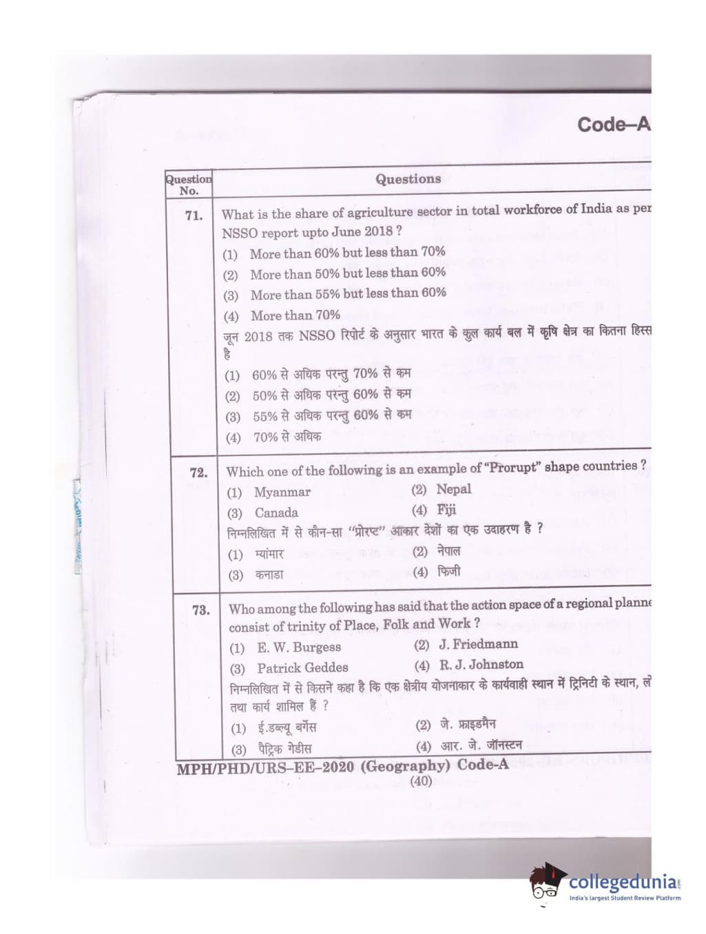 MDUCEE 2020 Ph.D./M.Phil./URS Geography Set A Question Paper with Answer Key PDFs