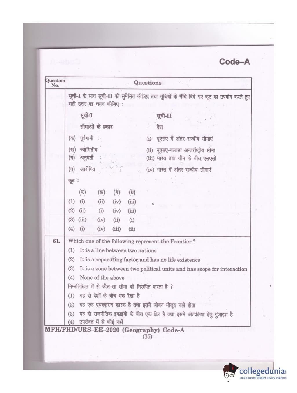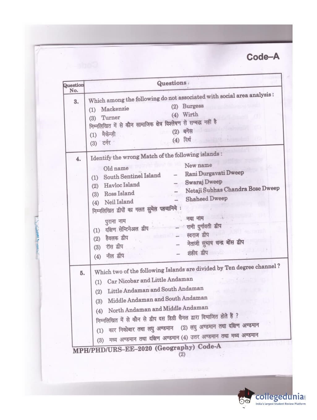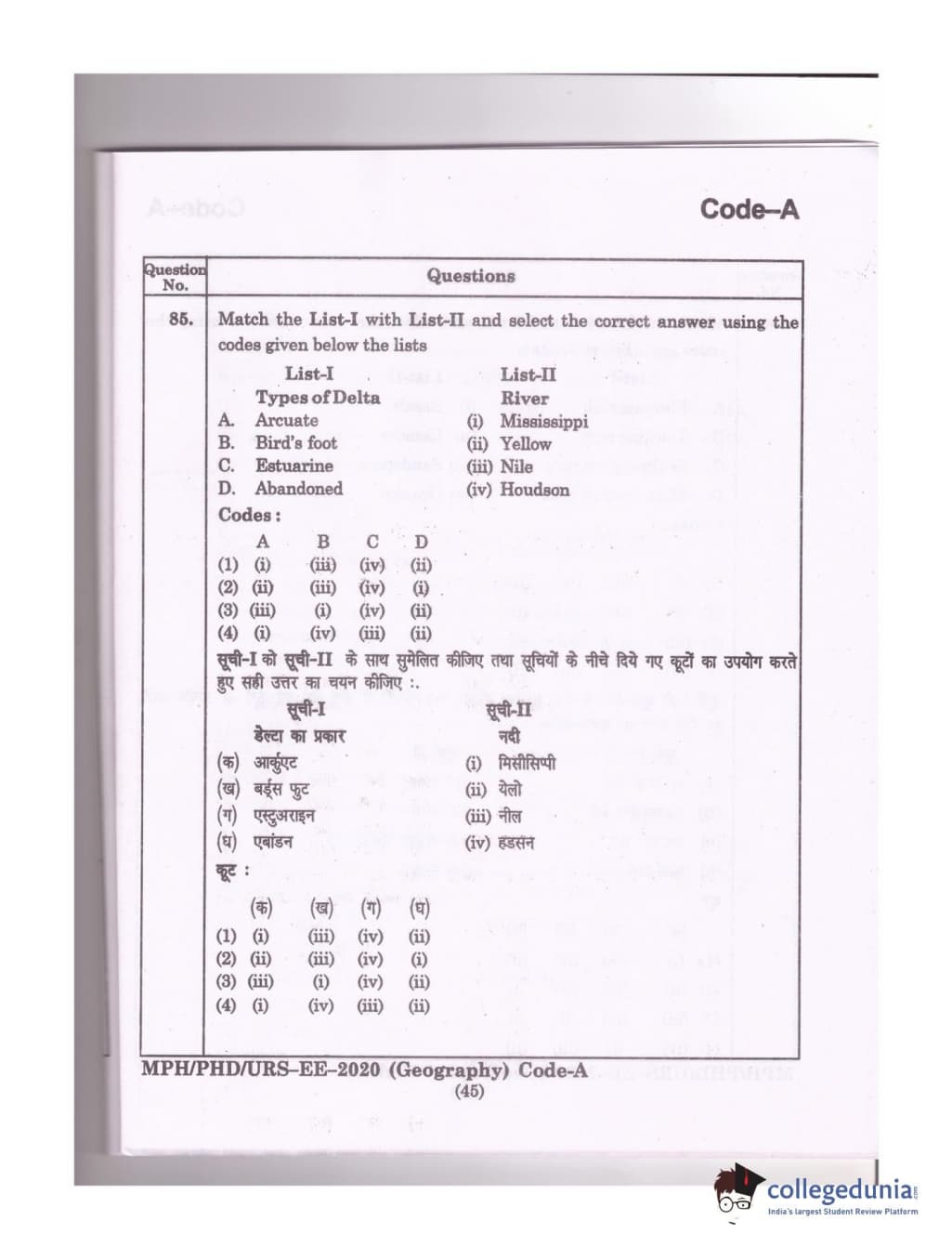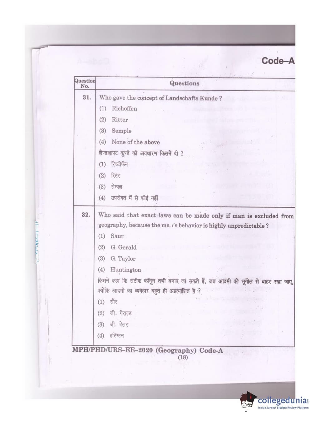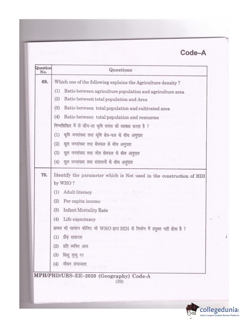 MDUCEE 2020 Ph.D./M.Phil./URS Geography Set A Question Paper with Answer Key PDFs