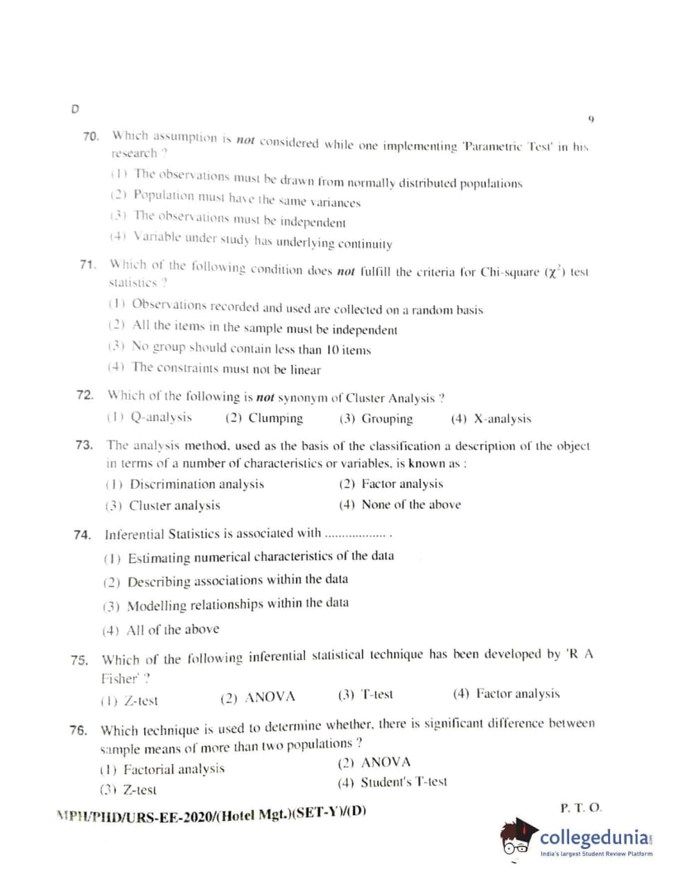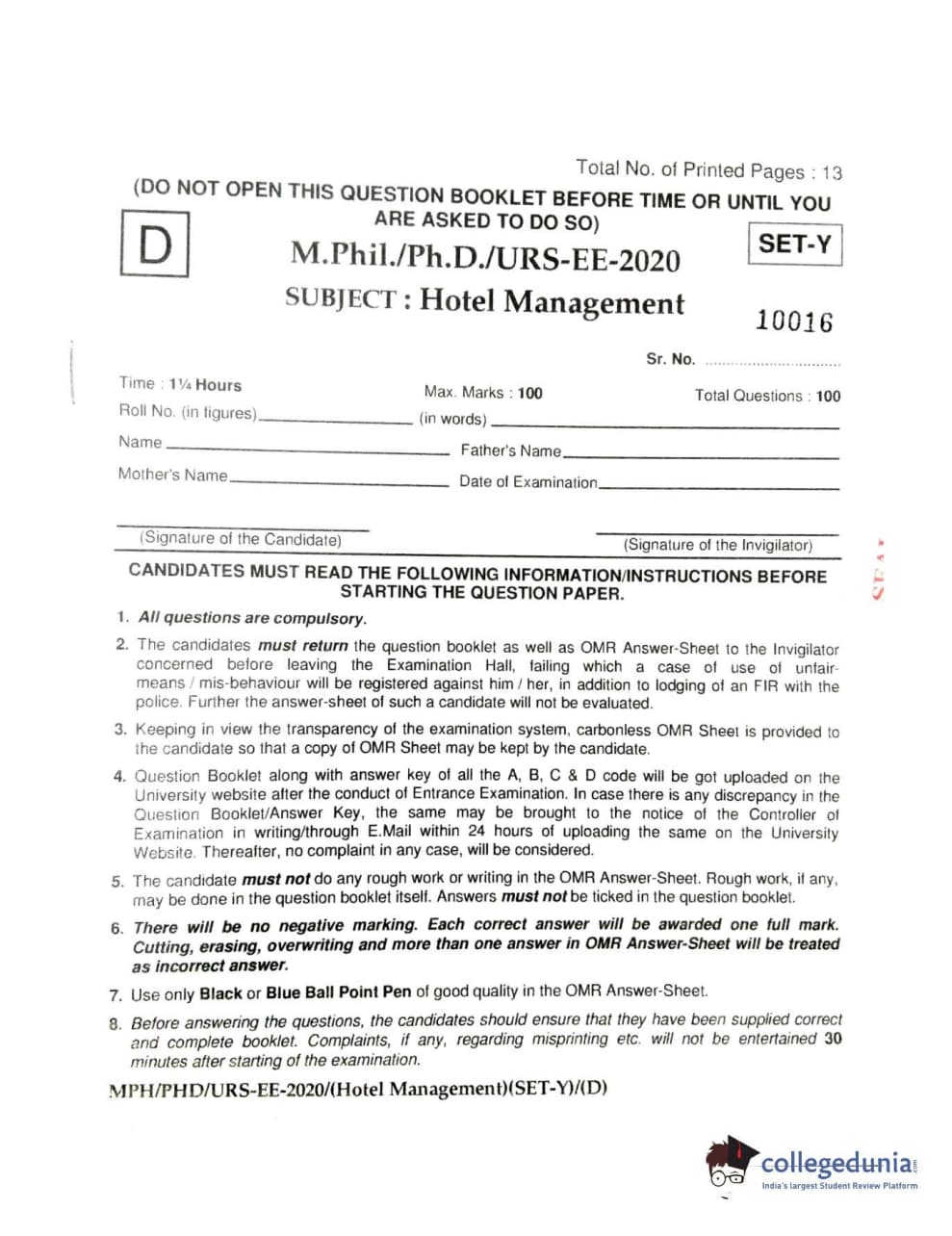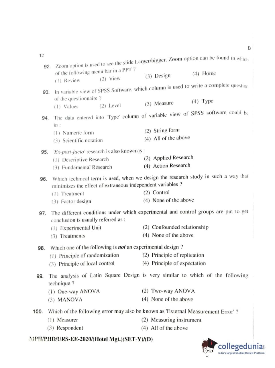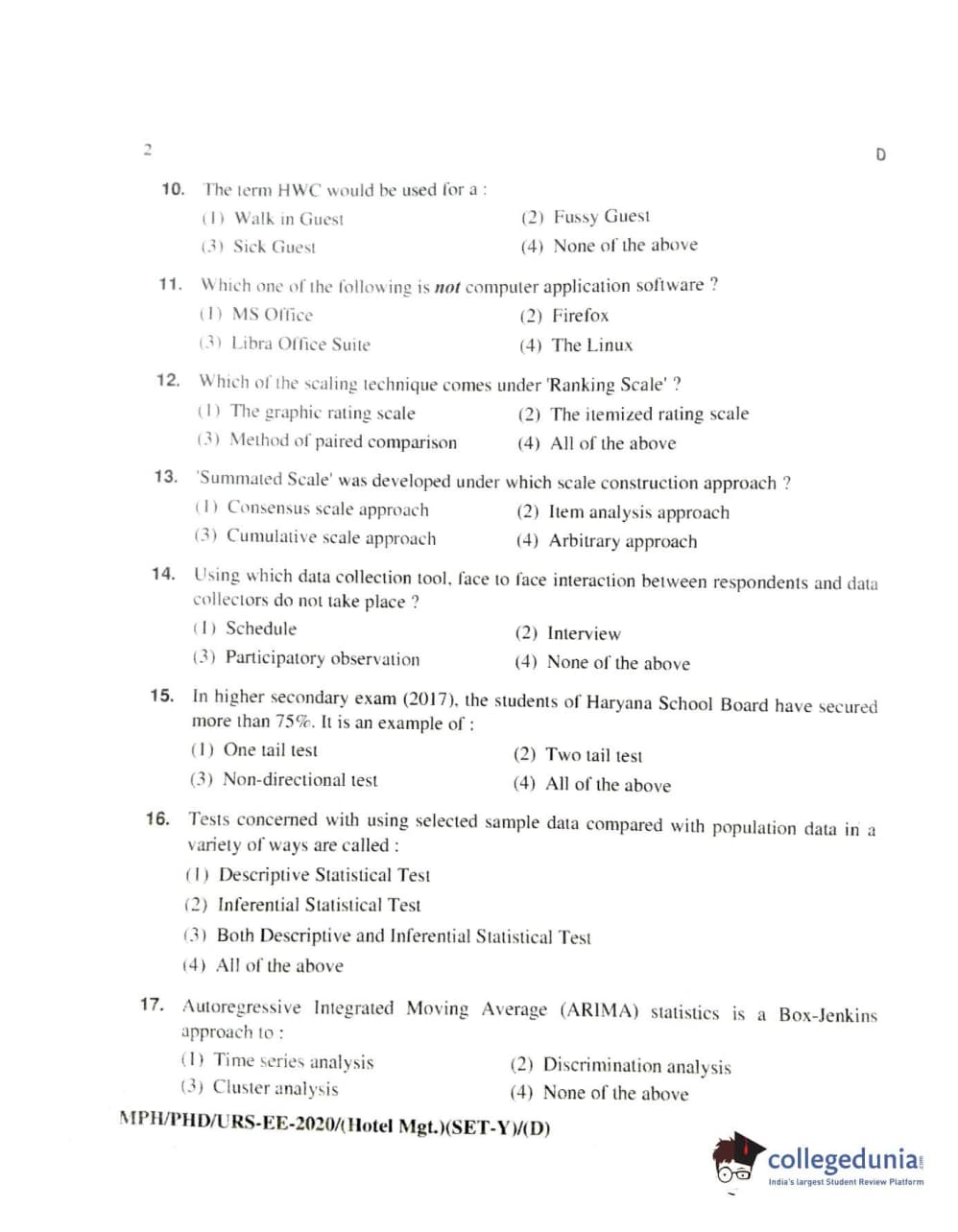 MDUCEE 2020 Ph.D./M.Phil./URS Hotel Management Set D Question paper with answer key pdf is available for download. The exam was successfully organized by Maharishi Dayanand University. The question paper comprised a total of 100 questions.