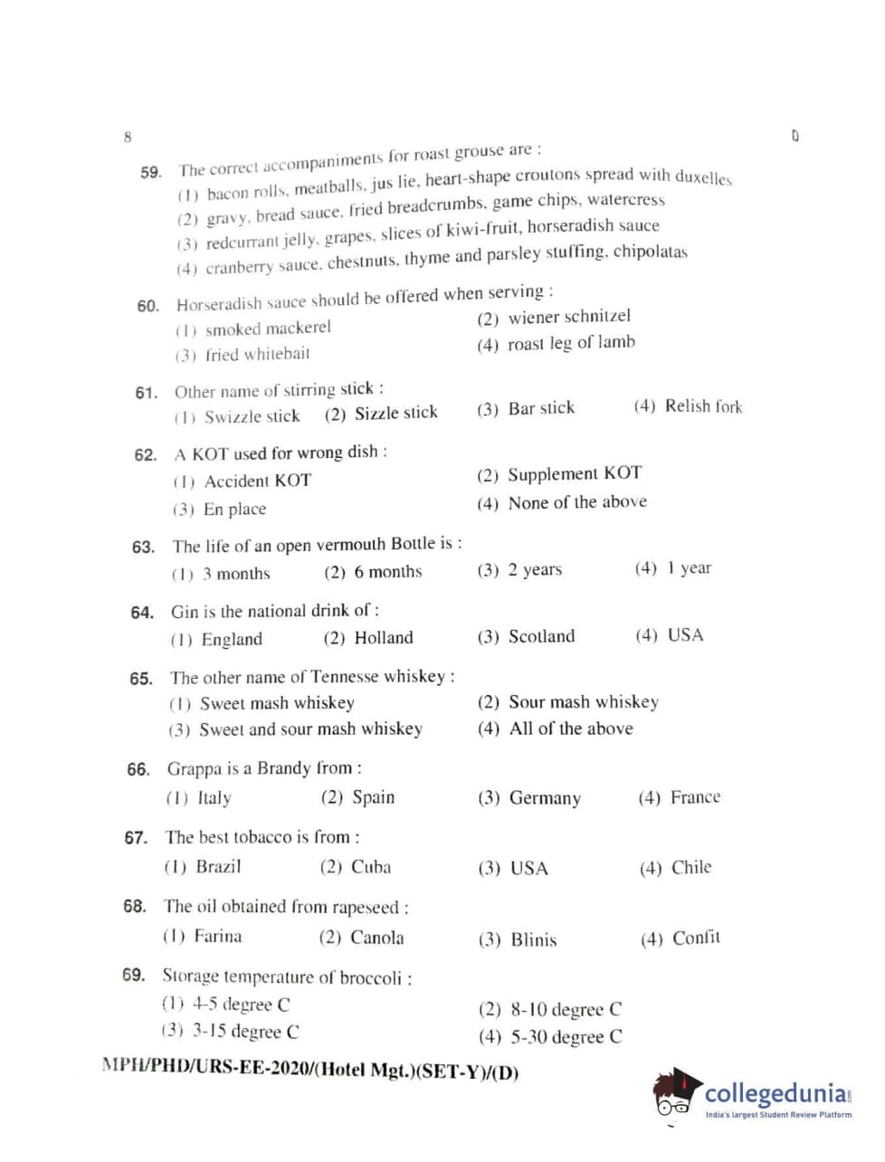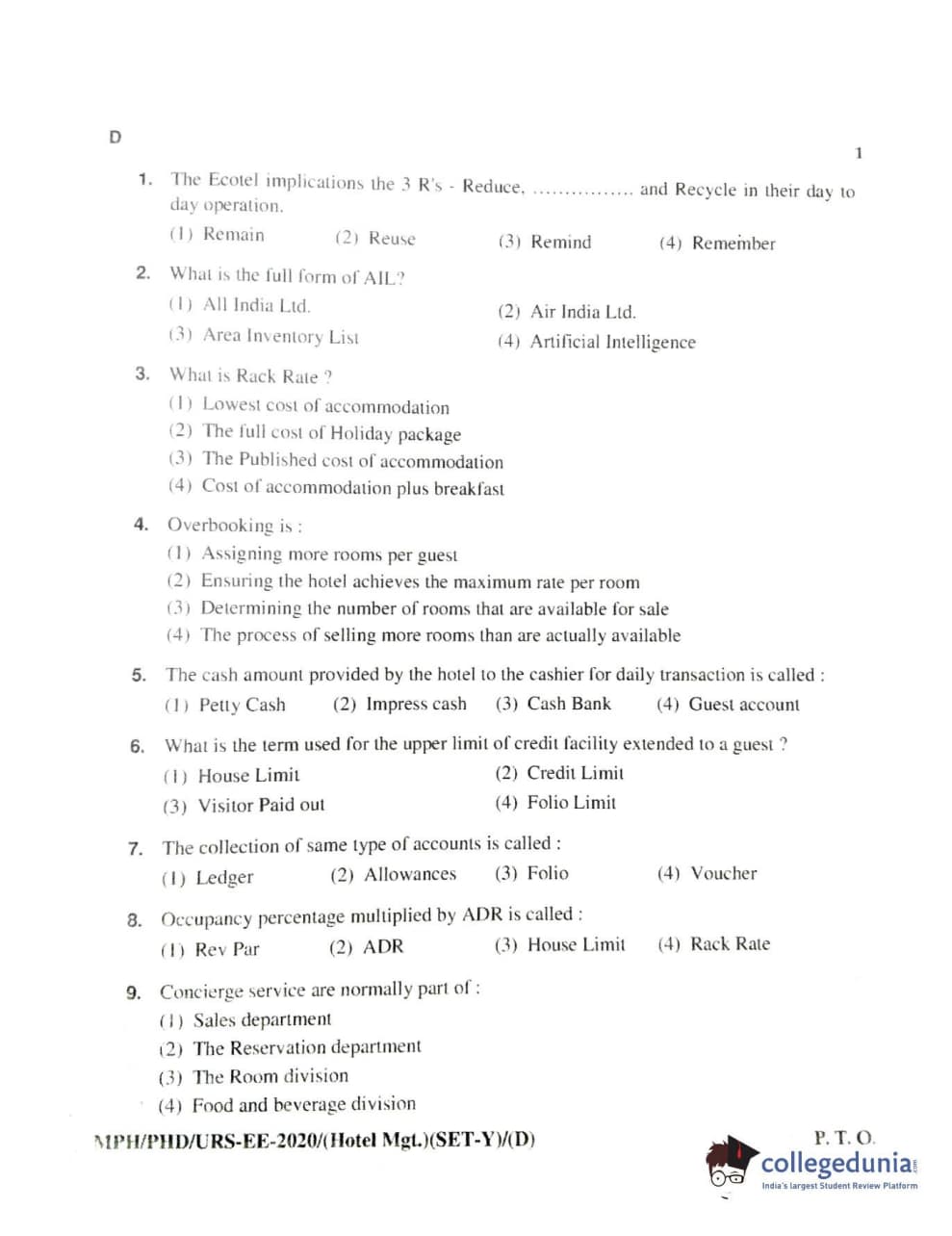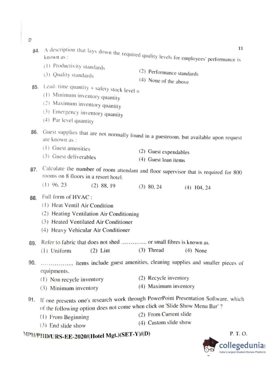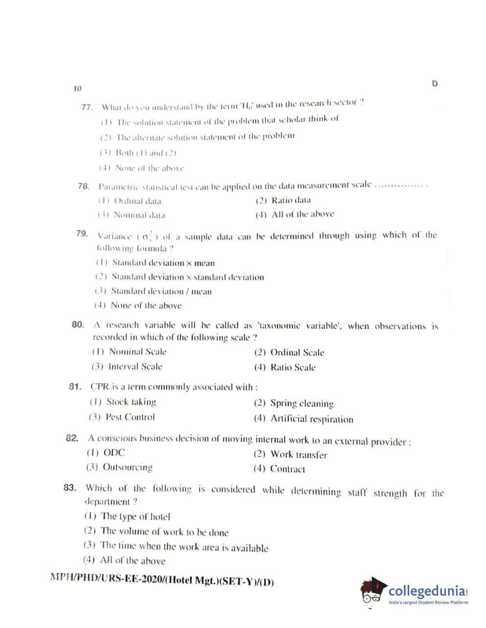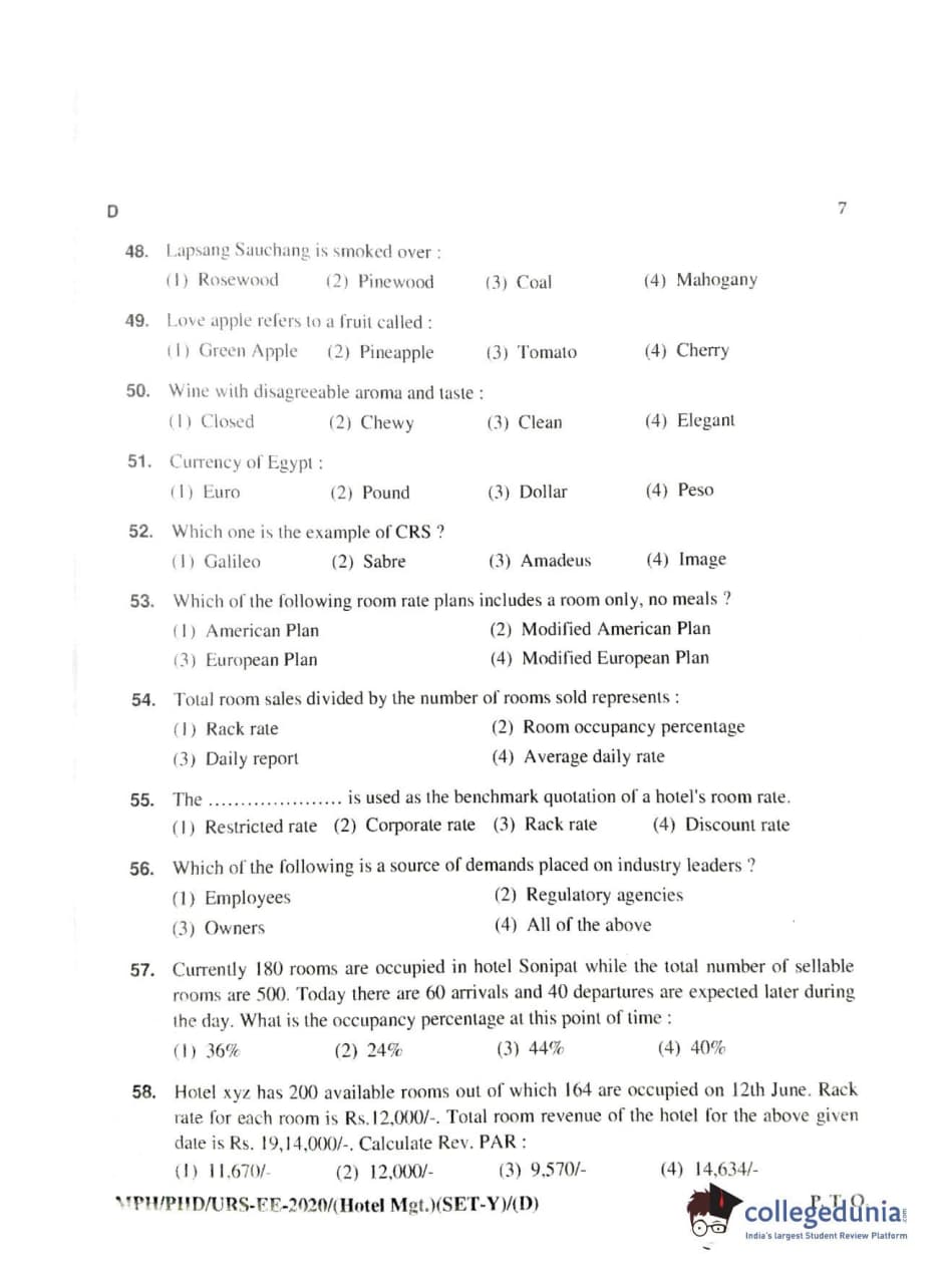 MDUCEE 2020 Ph.D./M.Phil./URS Hotel Management Set D Question Paper with Answer Key PDFs