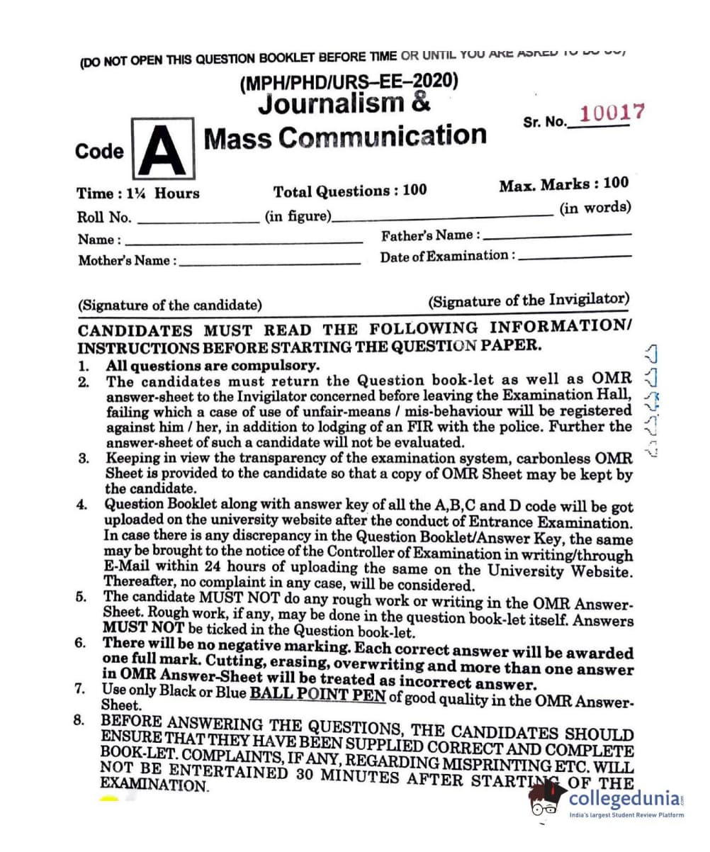 MDUCEE 2020 Ph.D/URS – Journalism and Mass Communication Set A Question paper with answer key pdf is available for download. The exam was successfully organized by Maharishi Dayanand University. The question paper comprised a total of 100 questions.