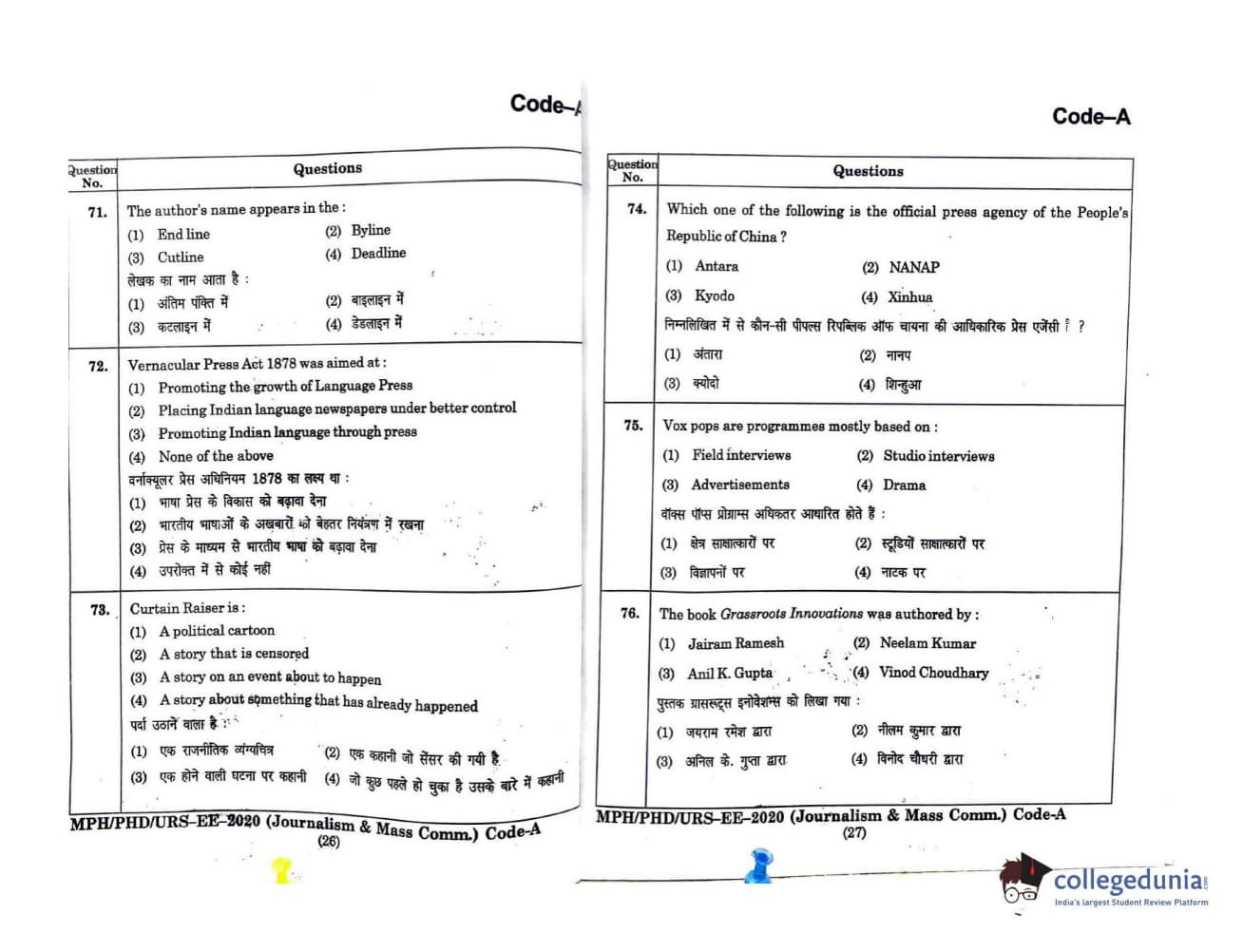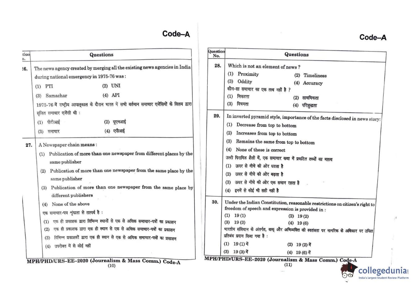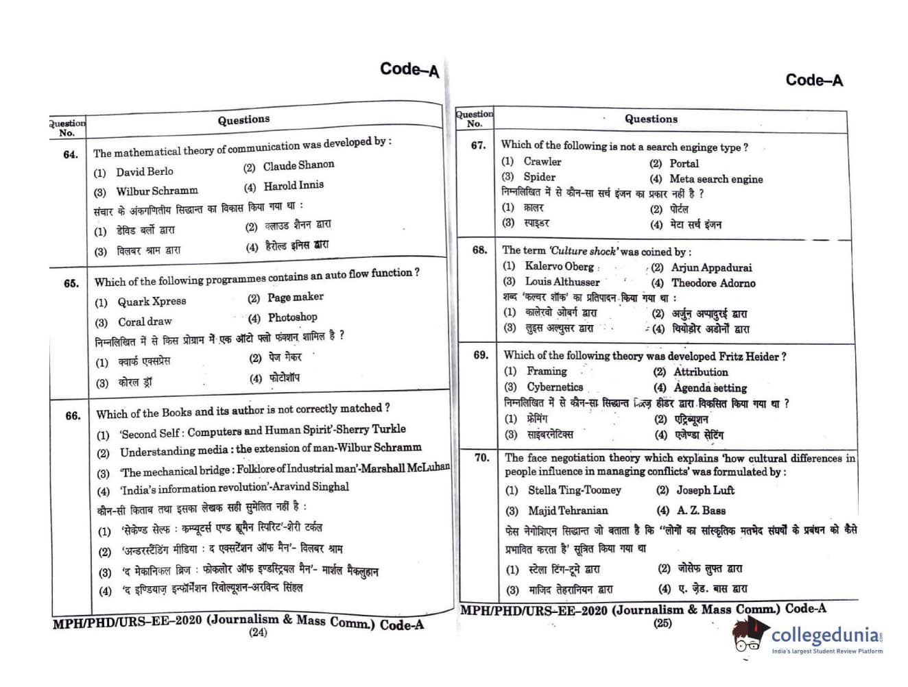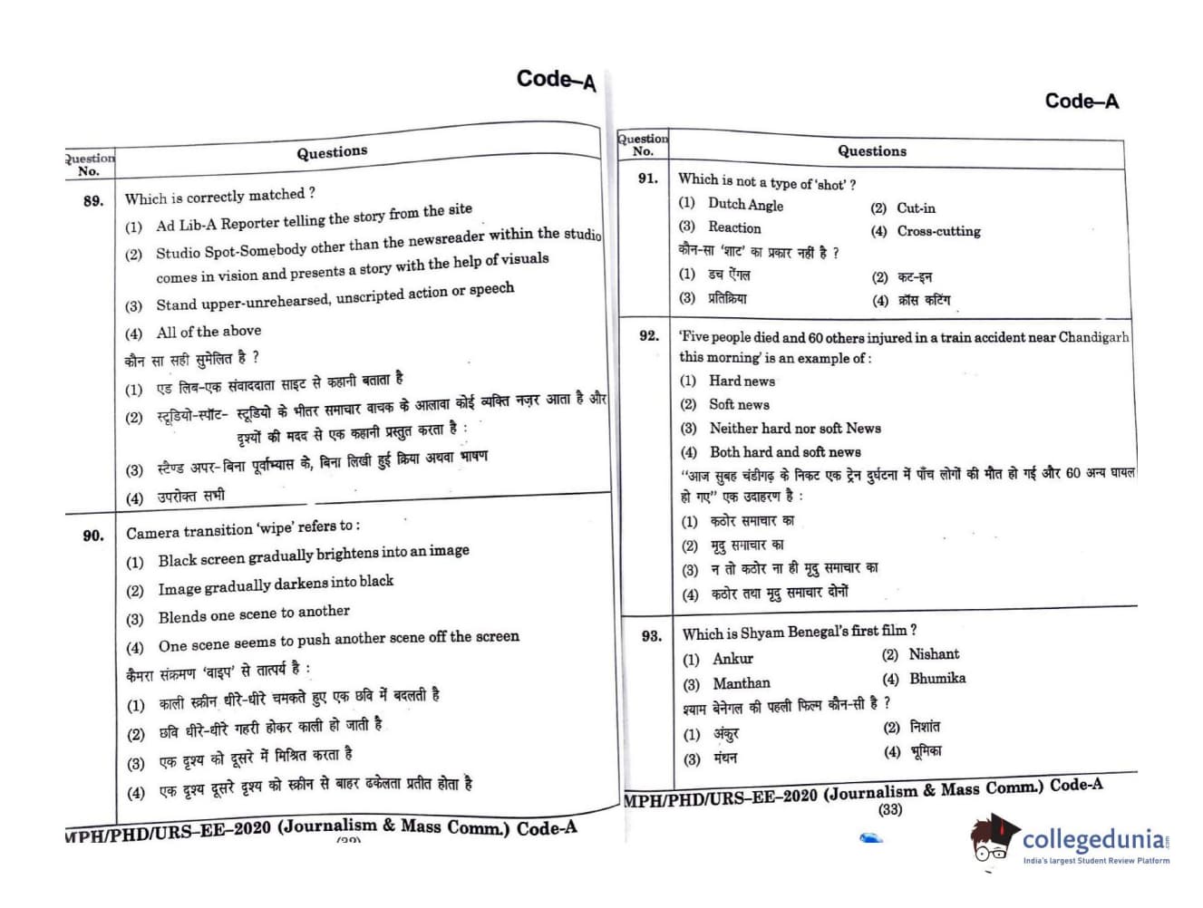MDUCEE 2020 Ph.D/URS – Journalism and Mass Communication Set A Question Paper with Answer Key PDFs