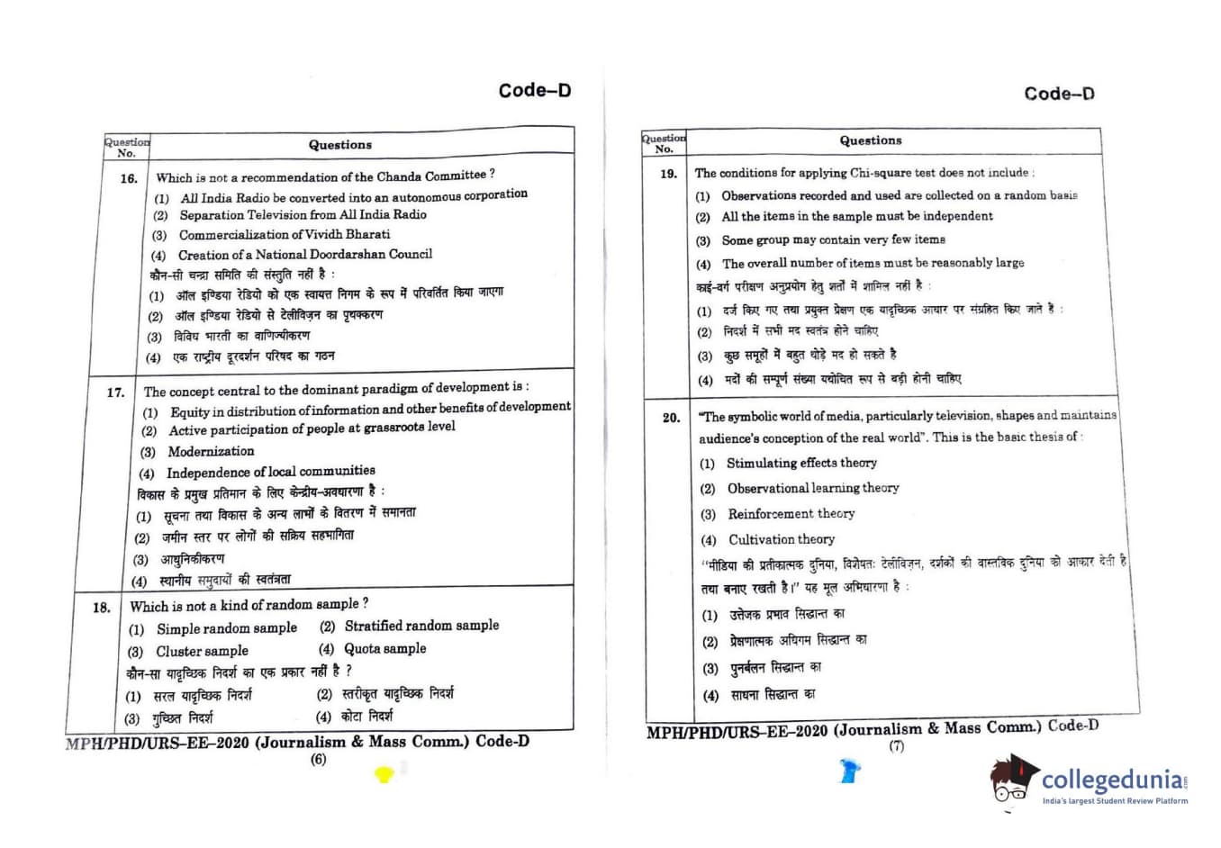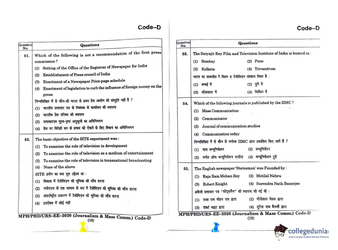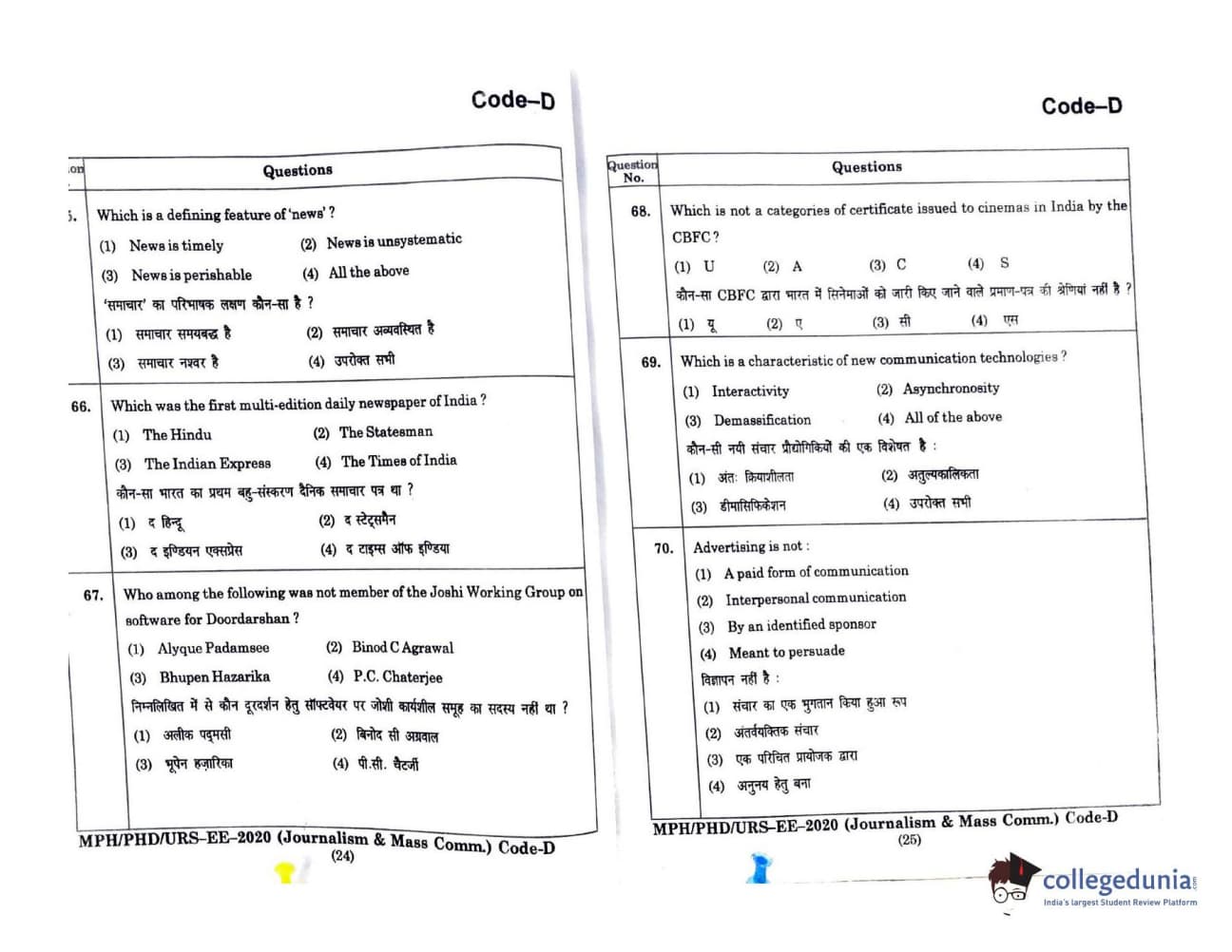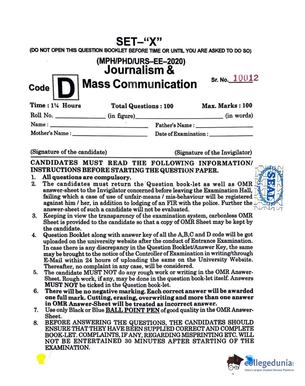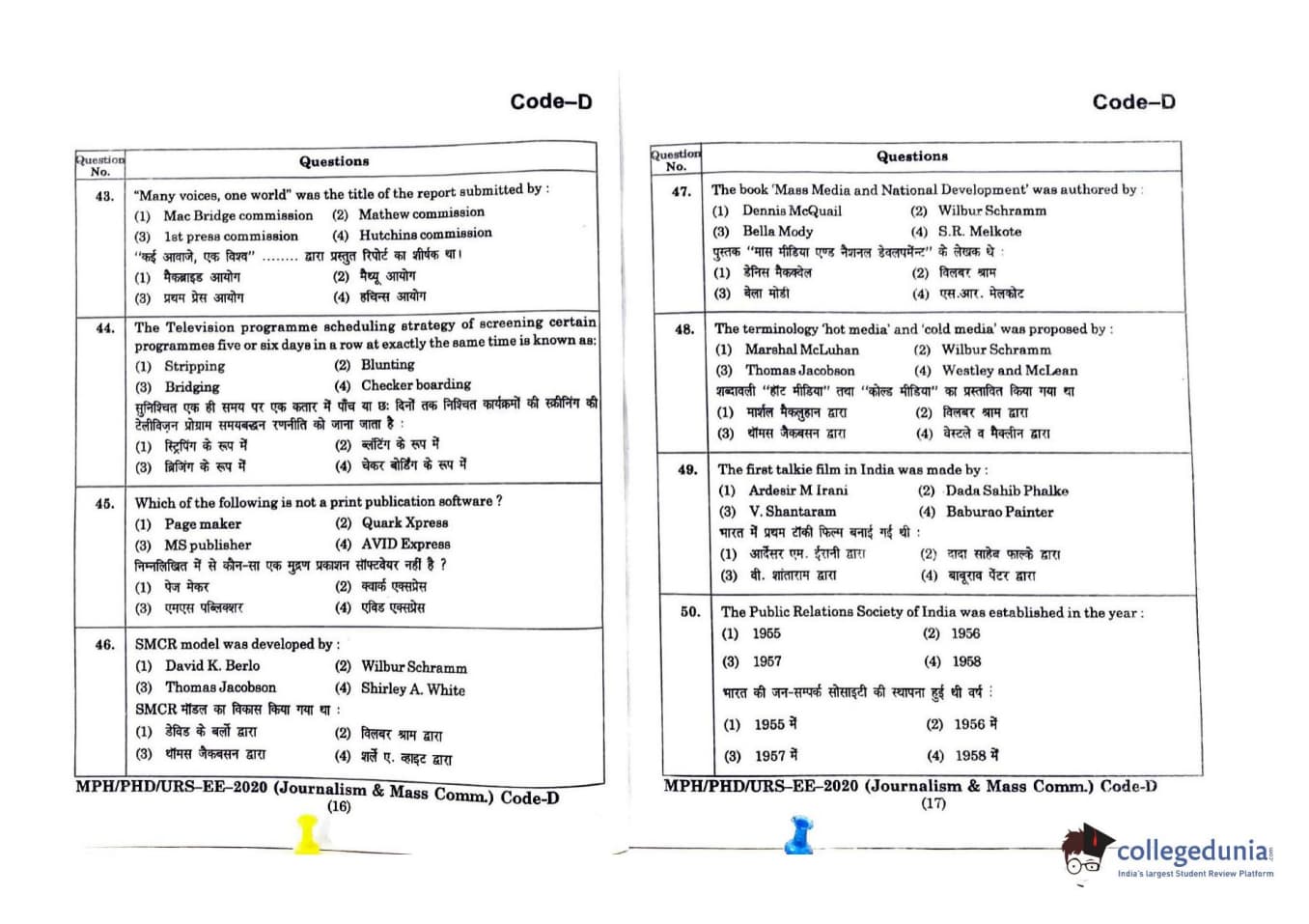 MDUCEE 2020 Ph.D/URS - Journalism and Mass Communication Set D Question Paper with Answer Key PDFs