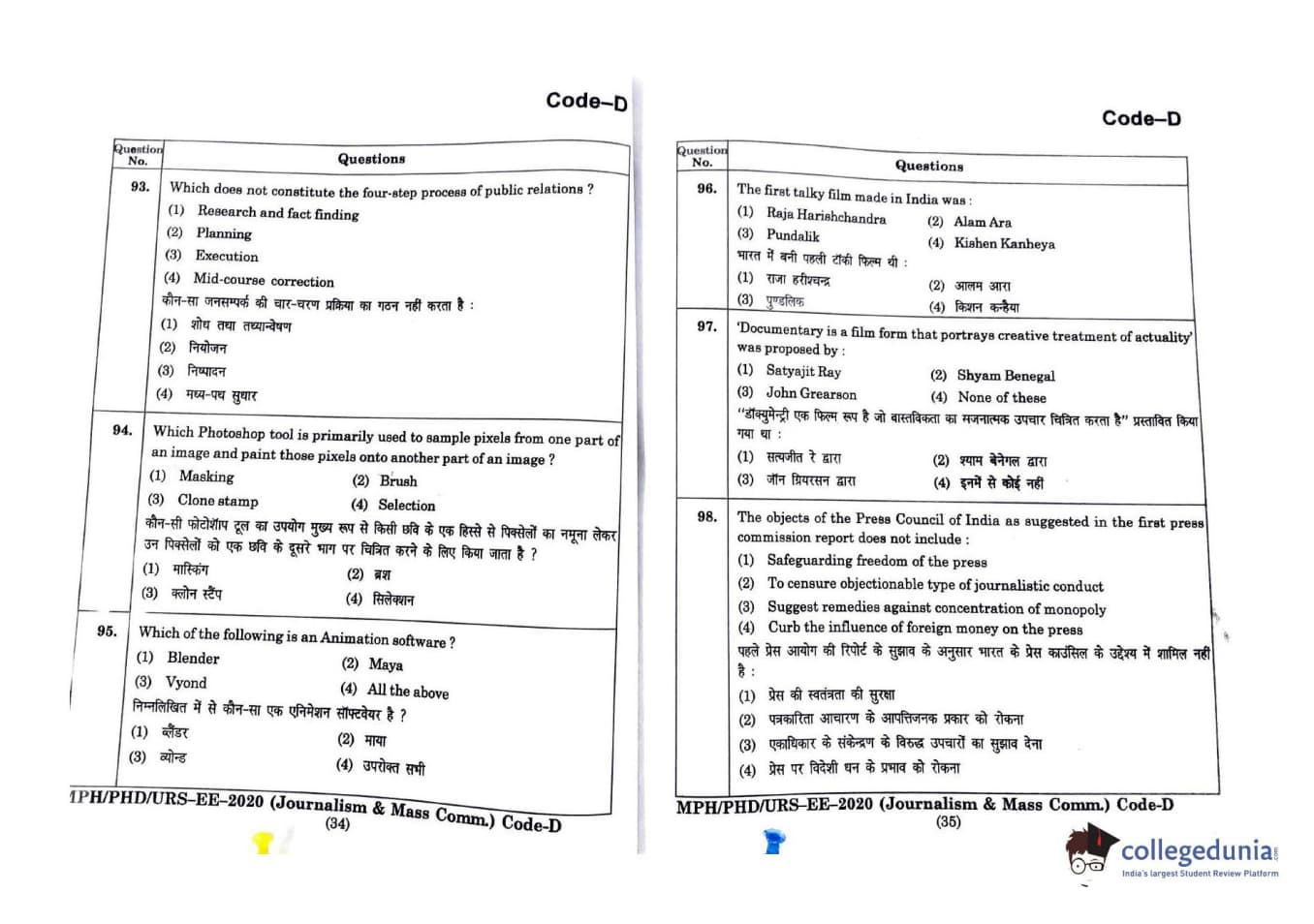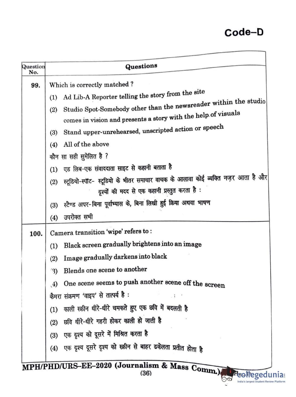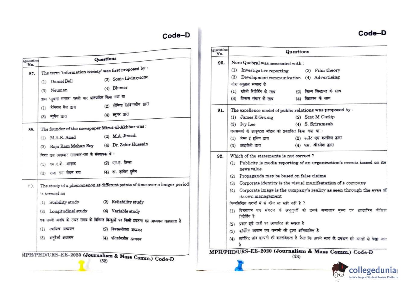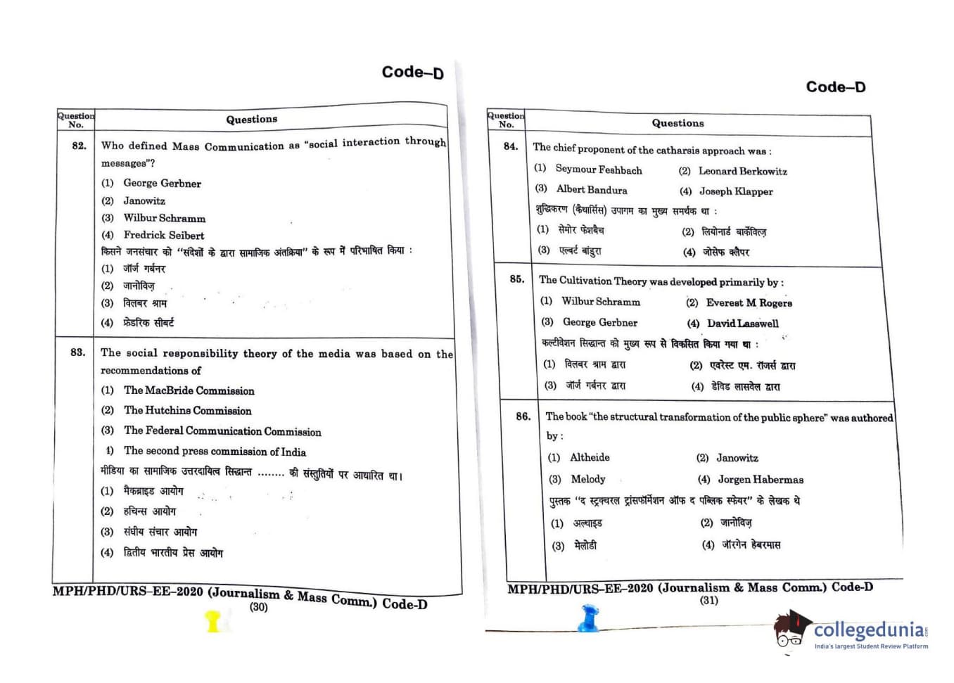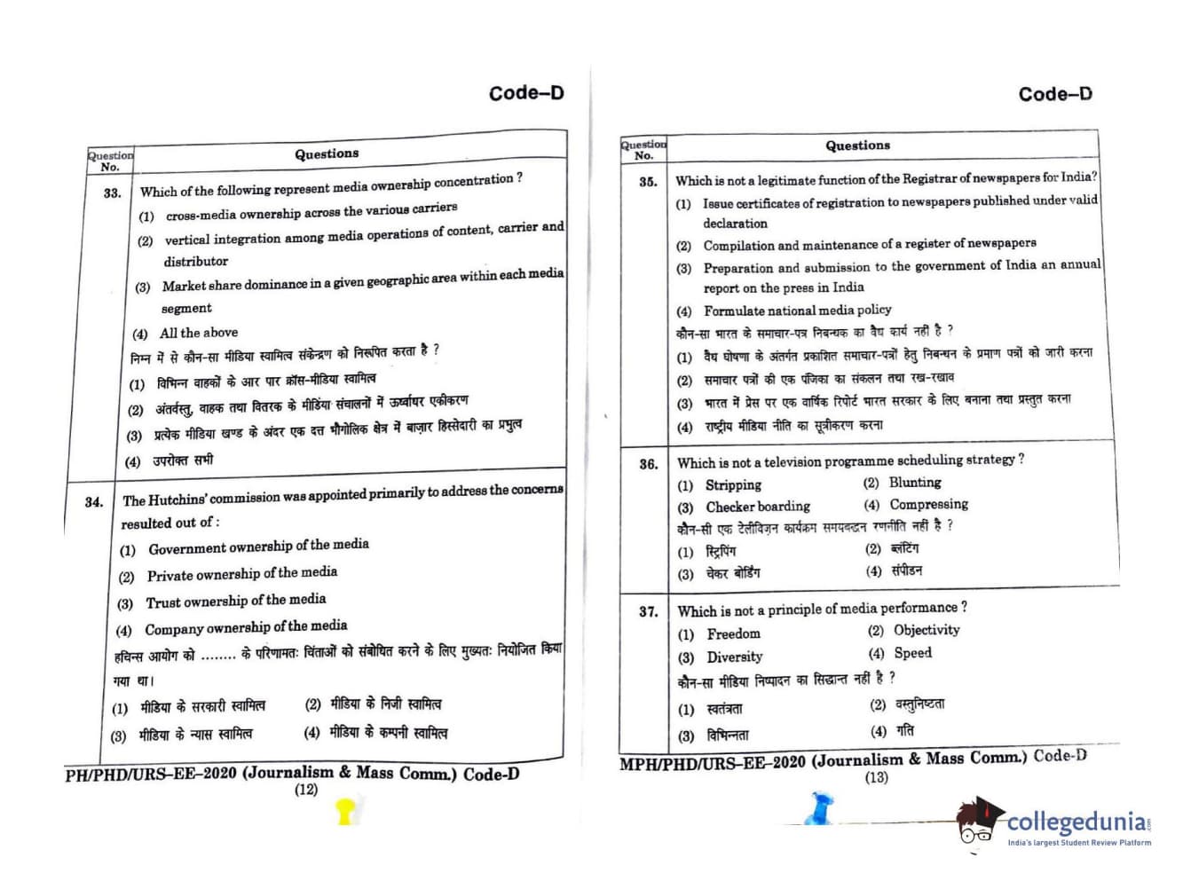 MDUCEE 2020 Ph.D/URS - Journalism and Mass Communication Set D Question Paper with Answer Key PDFs