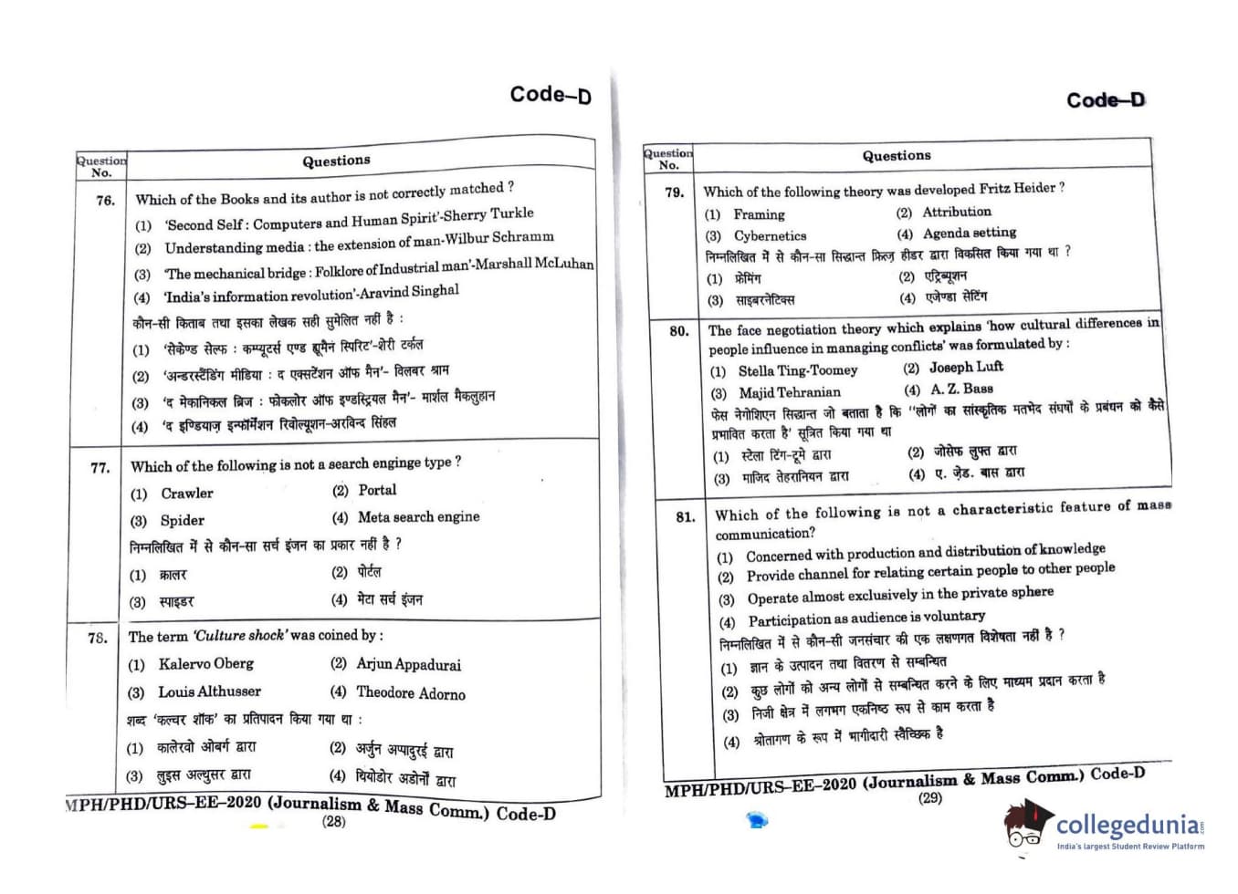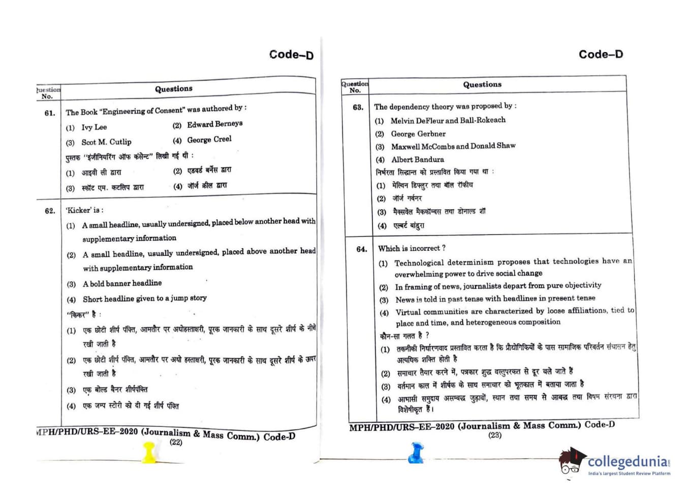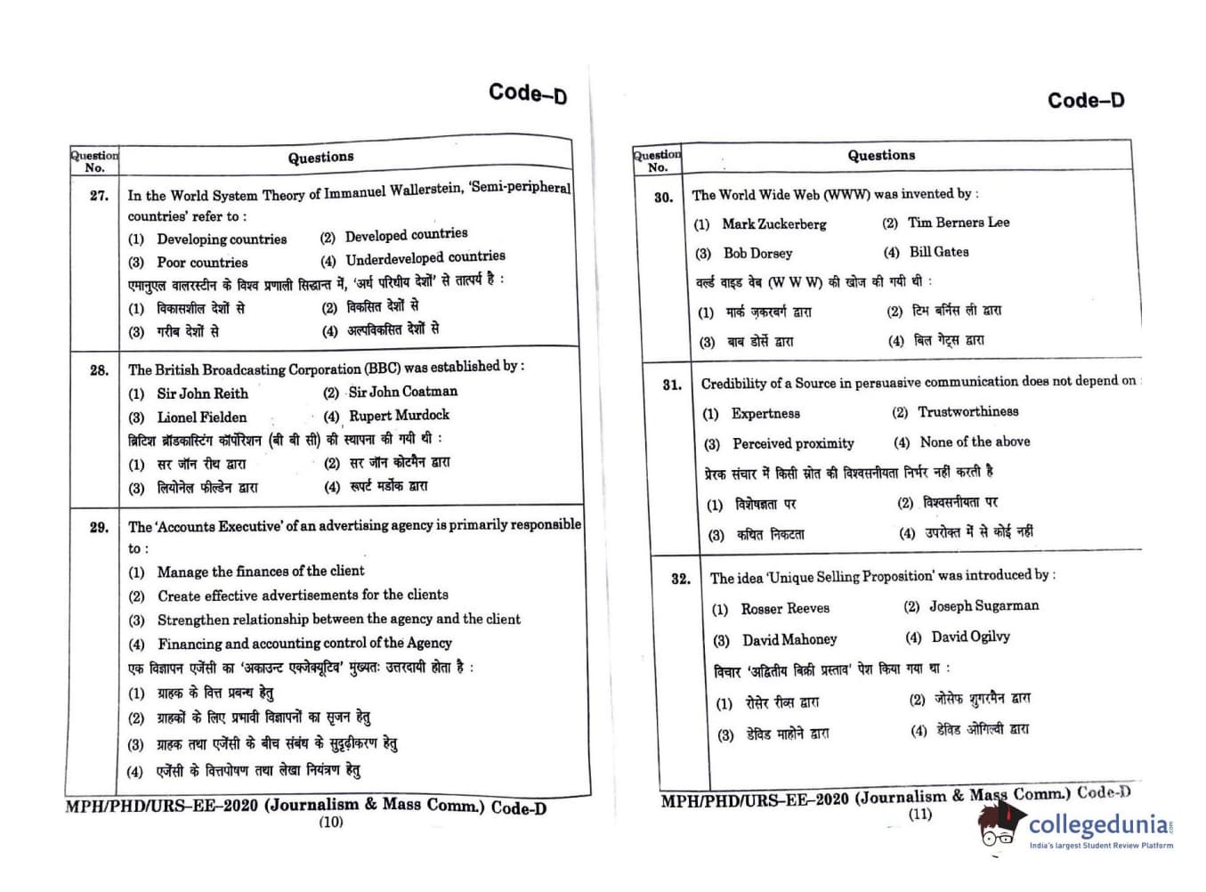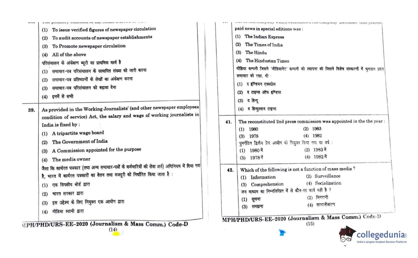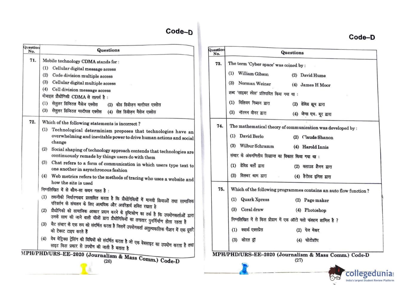 MDUCEE 2020 Ph.D/URS - Journalism and Mass Communication Set D Question Paper with Answer Key PDFs