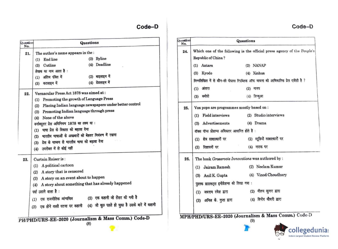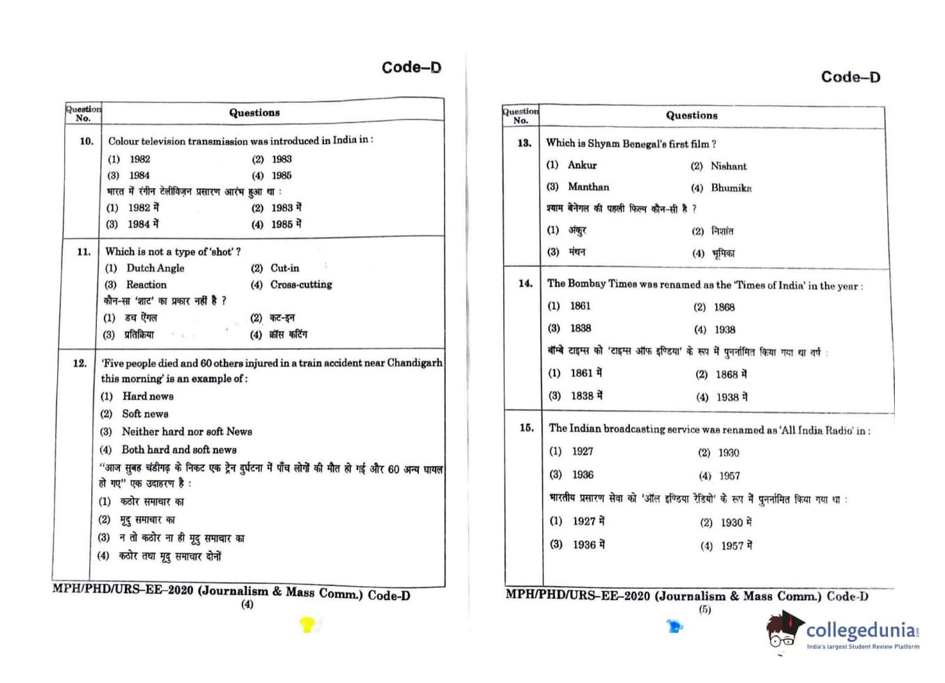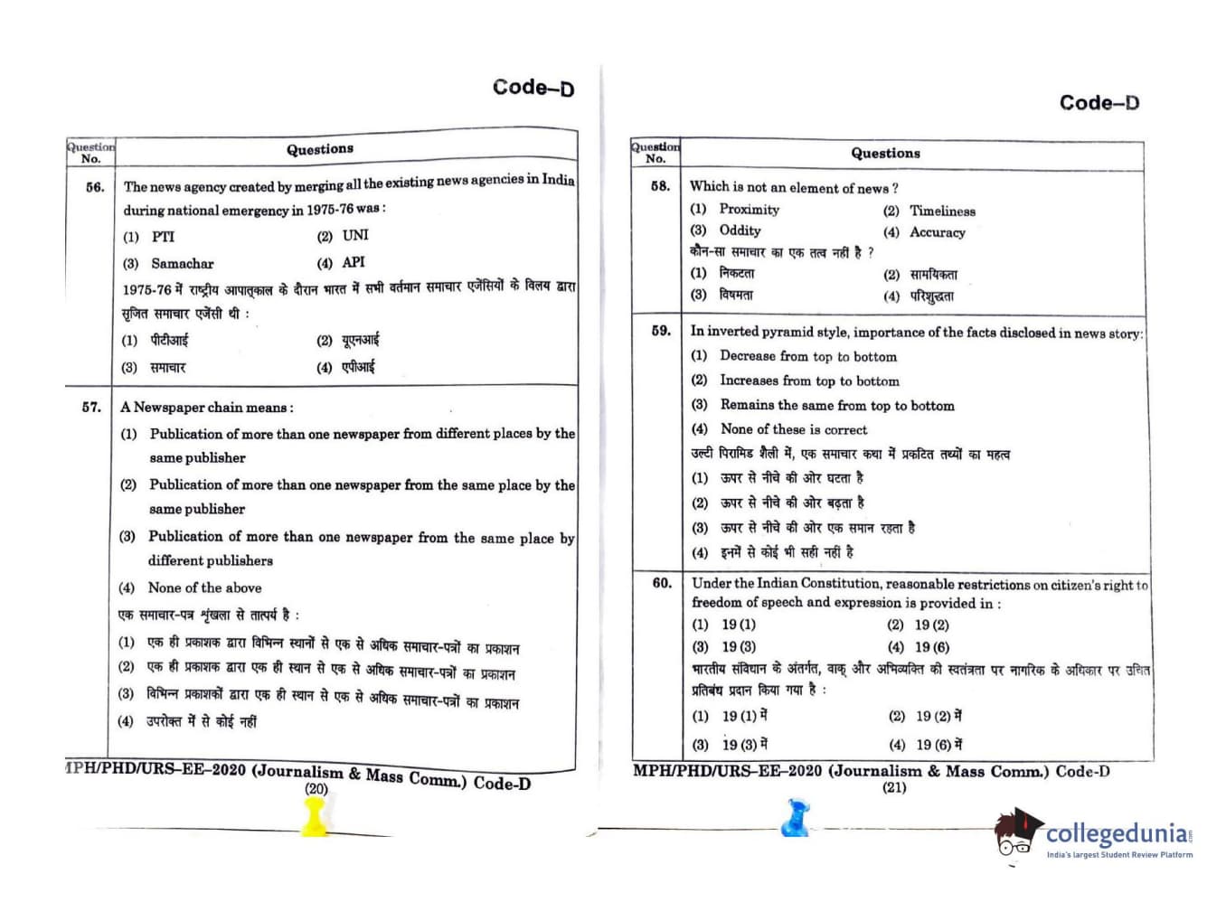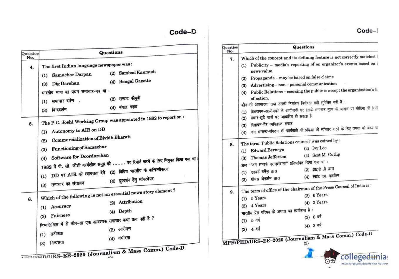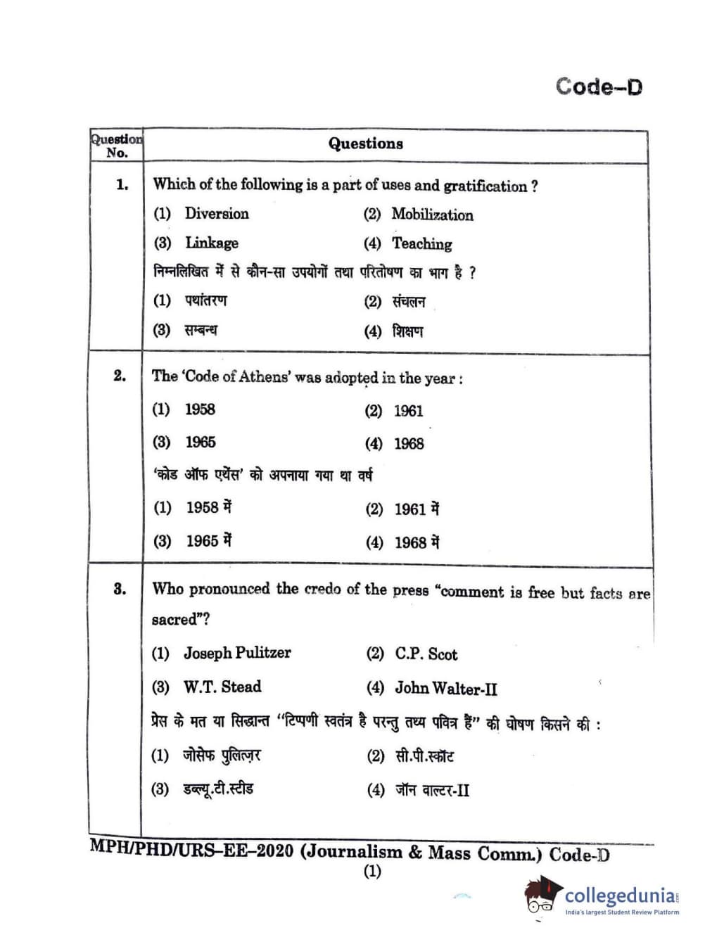 | MDUCEE 2020 Ph.D/URS - Journalism and Mass Communication Set D Question Paper PDF | MDUCEE 2020 Ph.D/URS - Journalism and Mass Communication Set D Answer Key PDF |
