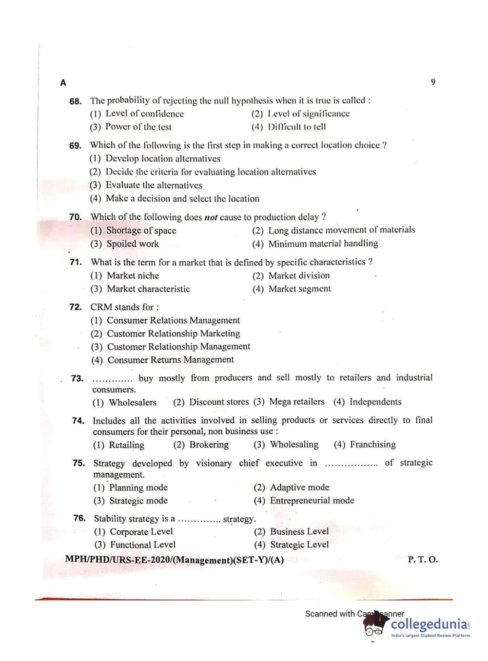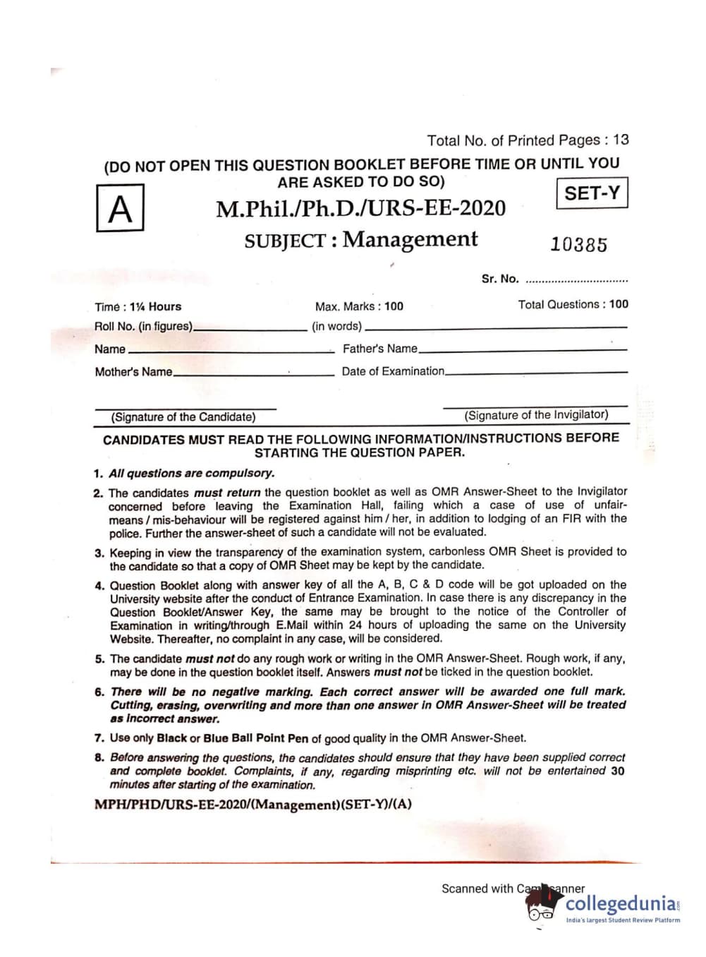 MDUCEE 2020 Ph.D./M.Phil./URS Management Set A Question paper with answer key pdf is available for download. The exam was successfully organized by Maharishi Dayanand University. The question paper comprised a total of 100 questions.