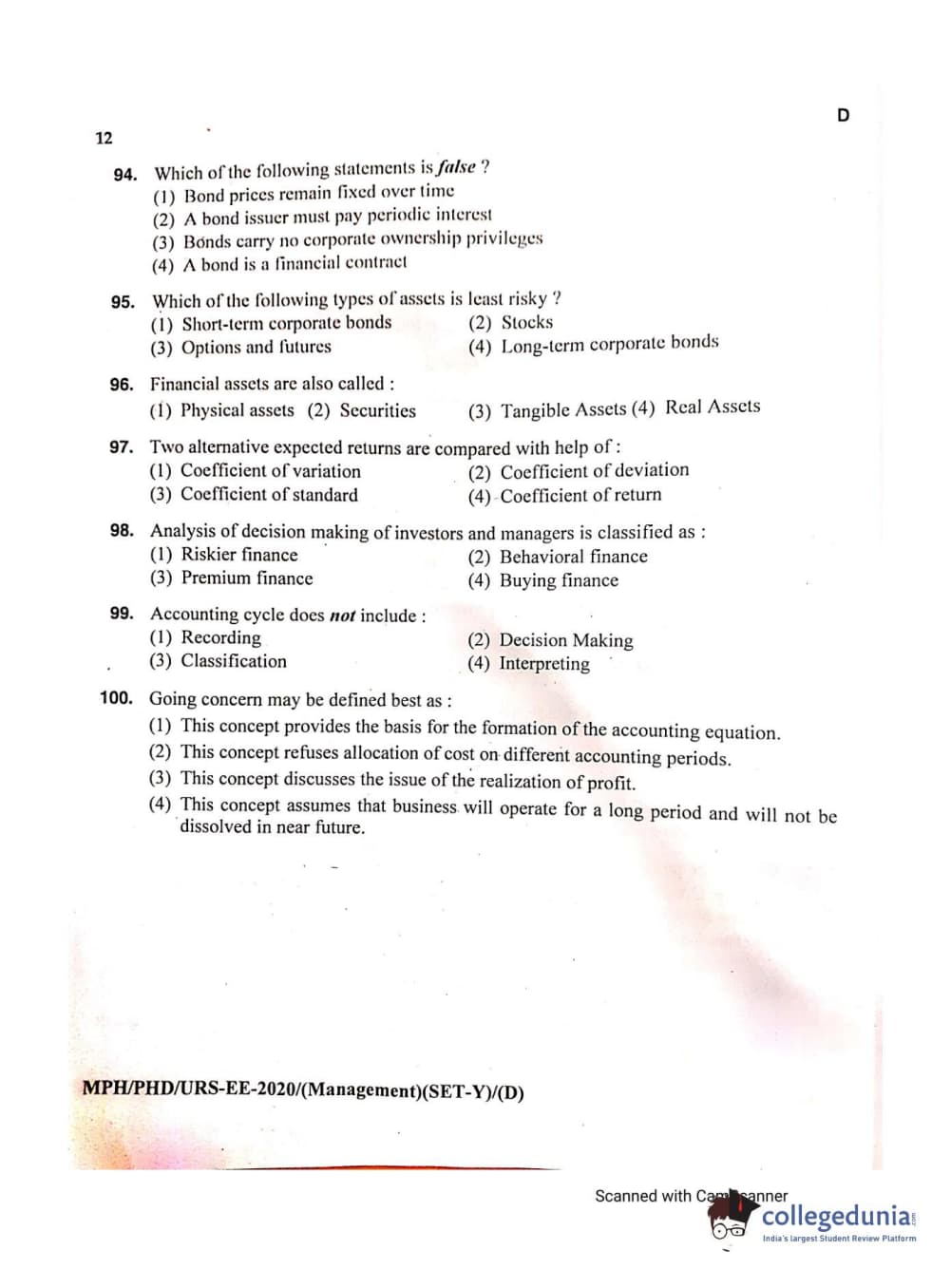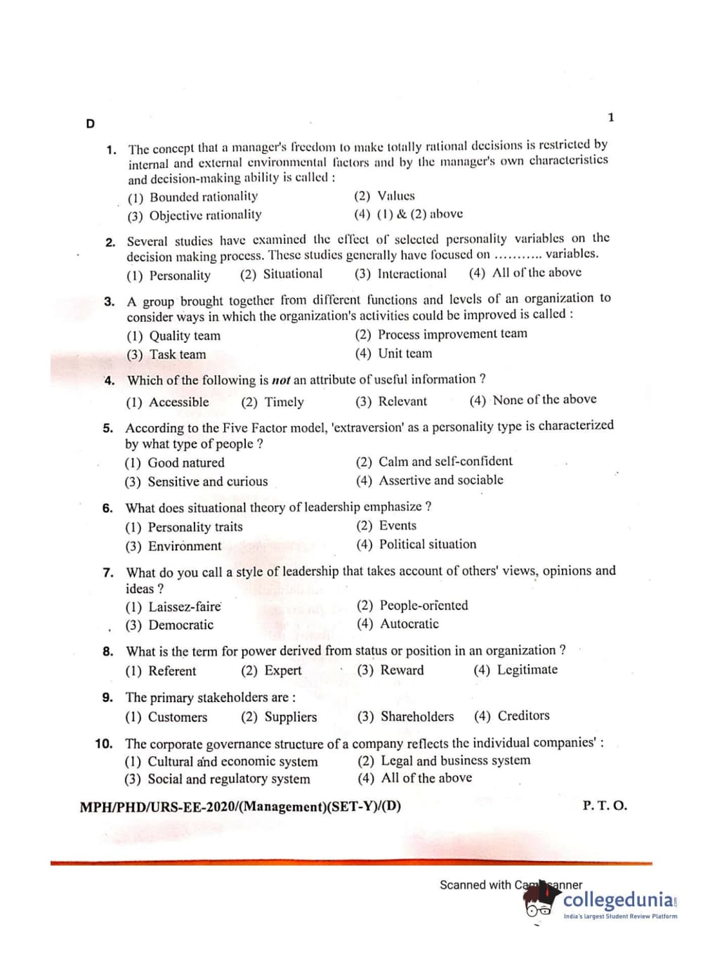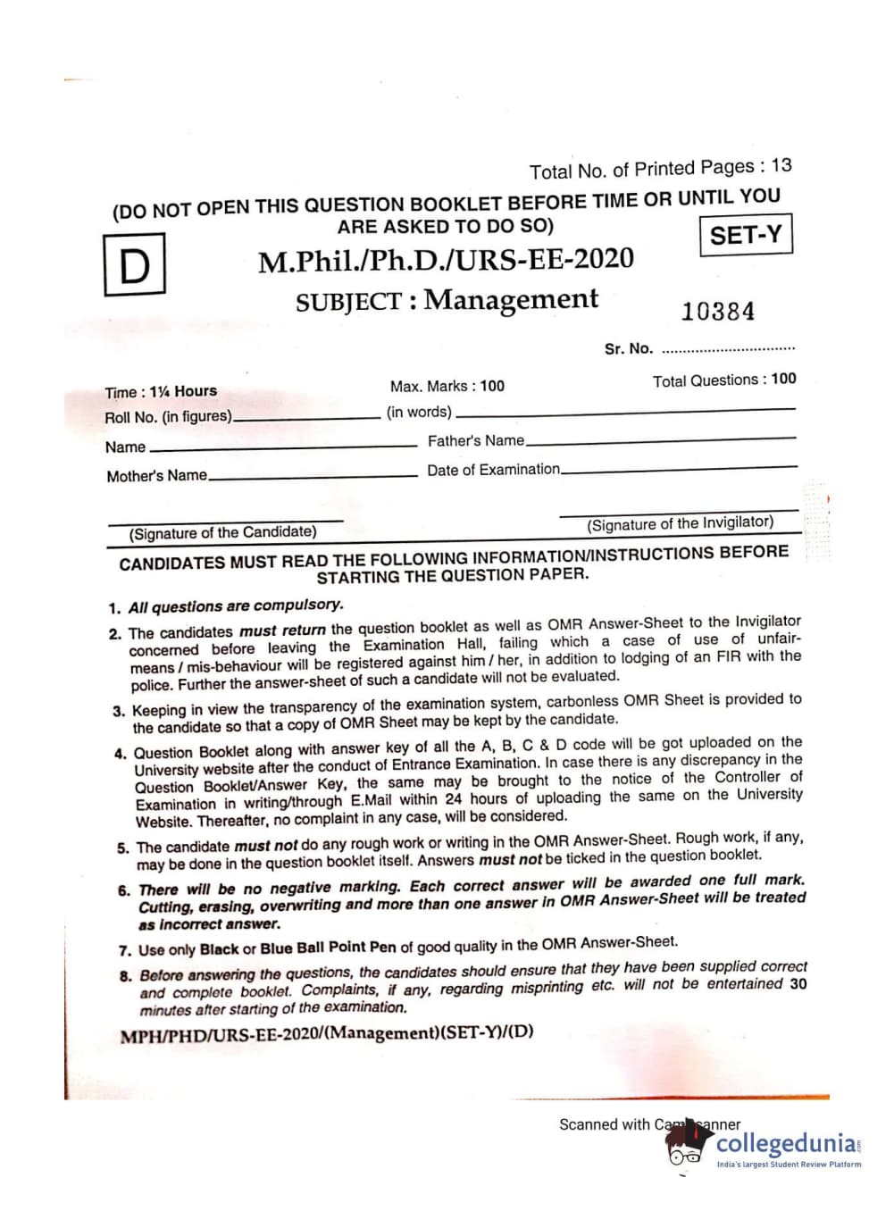 MDUCEE 2020 Ph.D./M.Phil./URS Management Set D Question paper with answer key pdf is available for download. The exam was successfully organized by Maharishi Dayanand University. The question paper comprised a total of 100 questions.