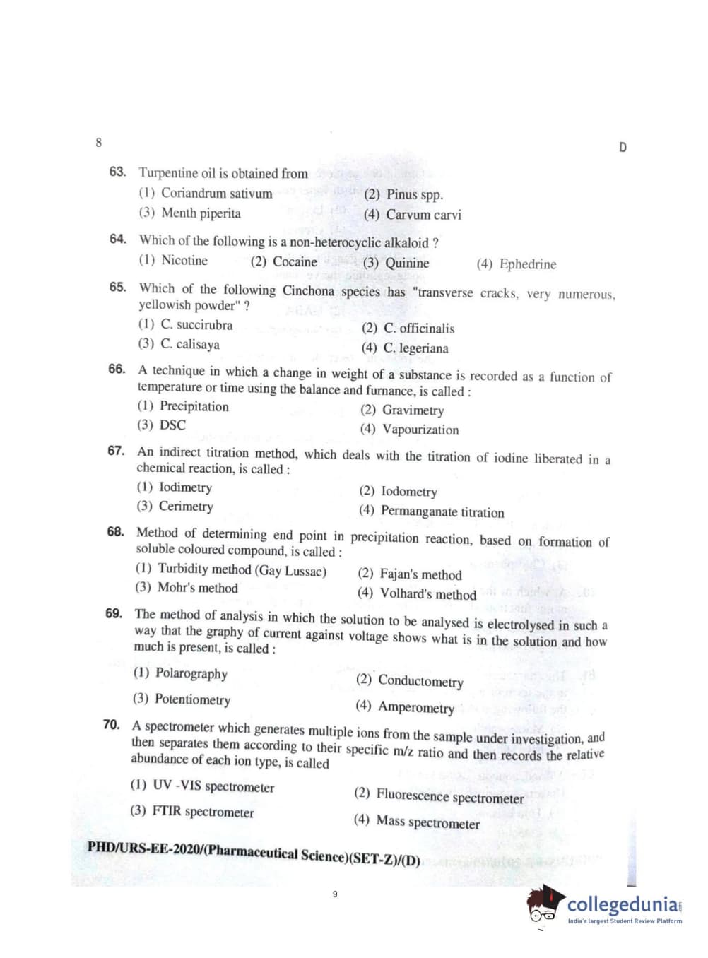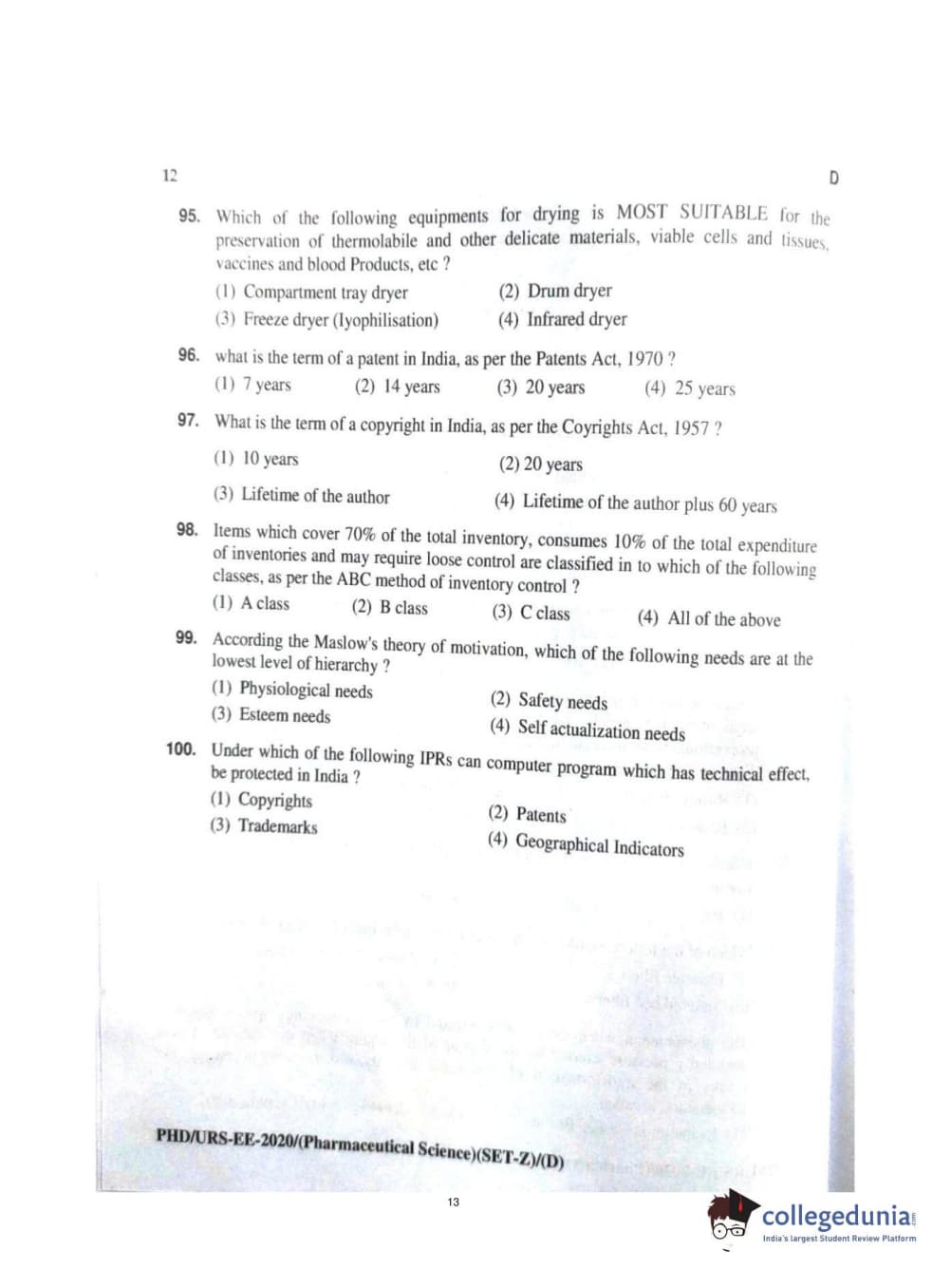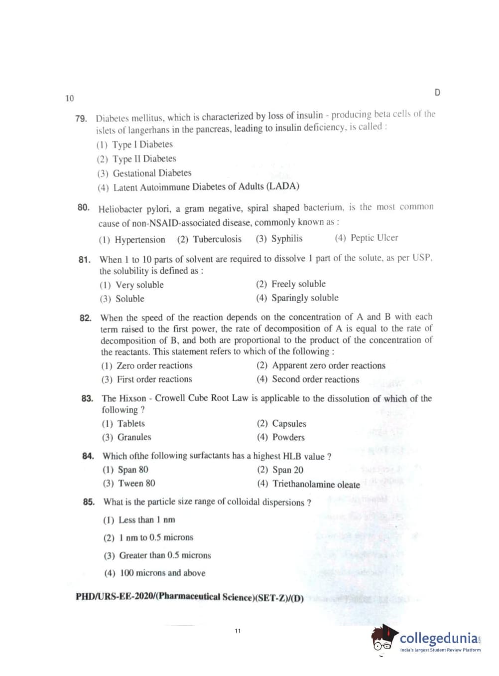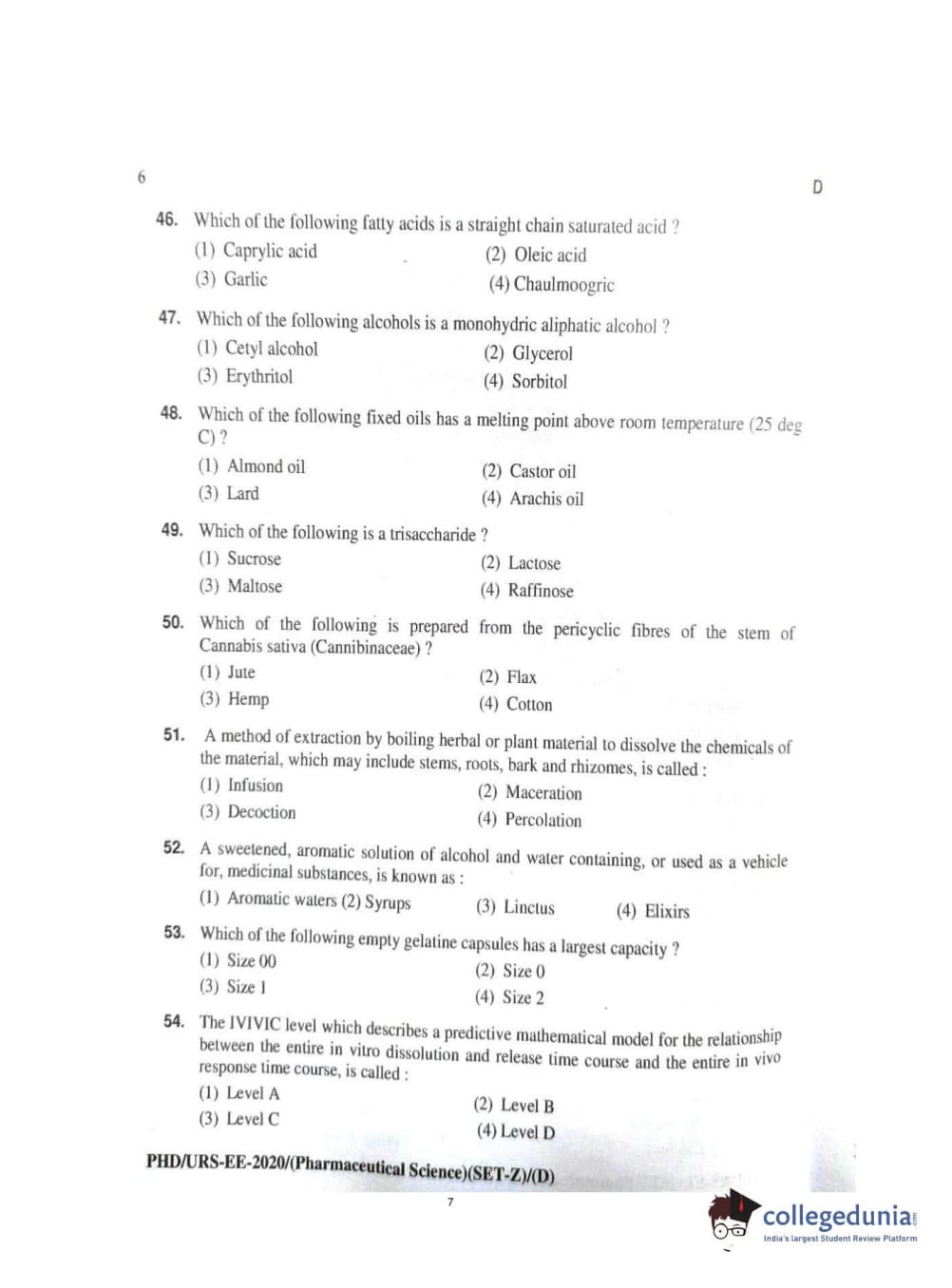 MDUCEE 2020 Ph.d. Pharmaceutical Sciences Set D Question Paper with Answer Key PDFs