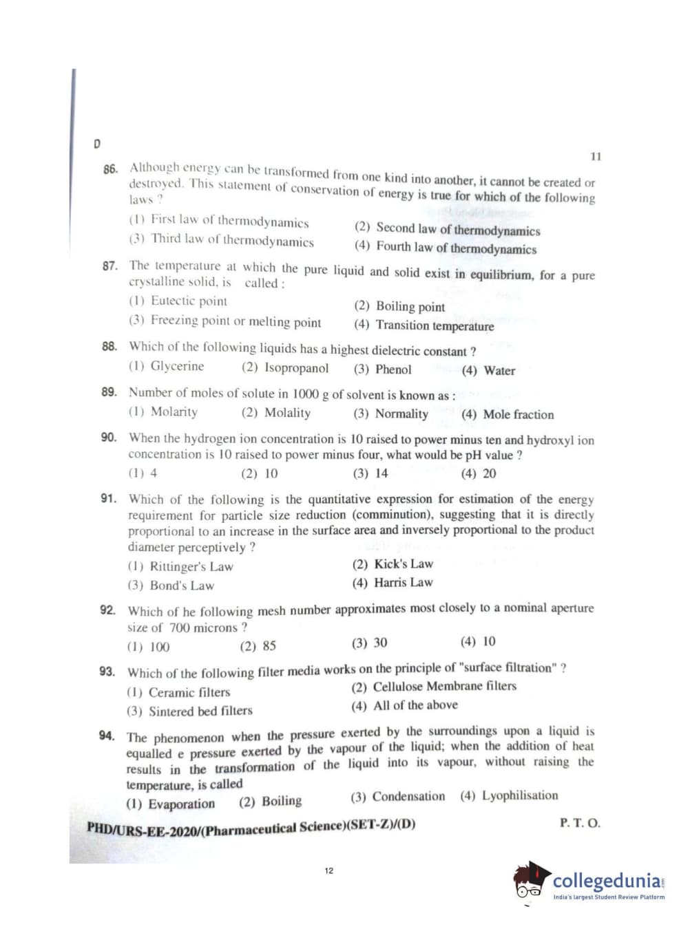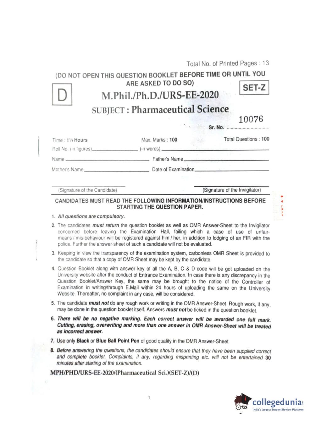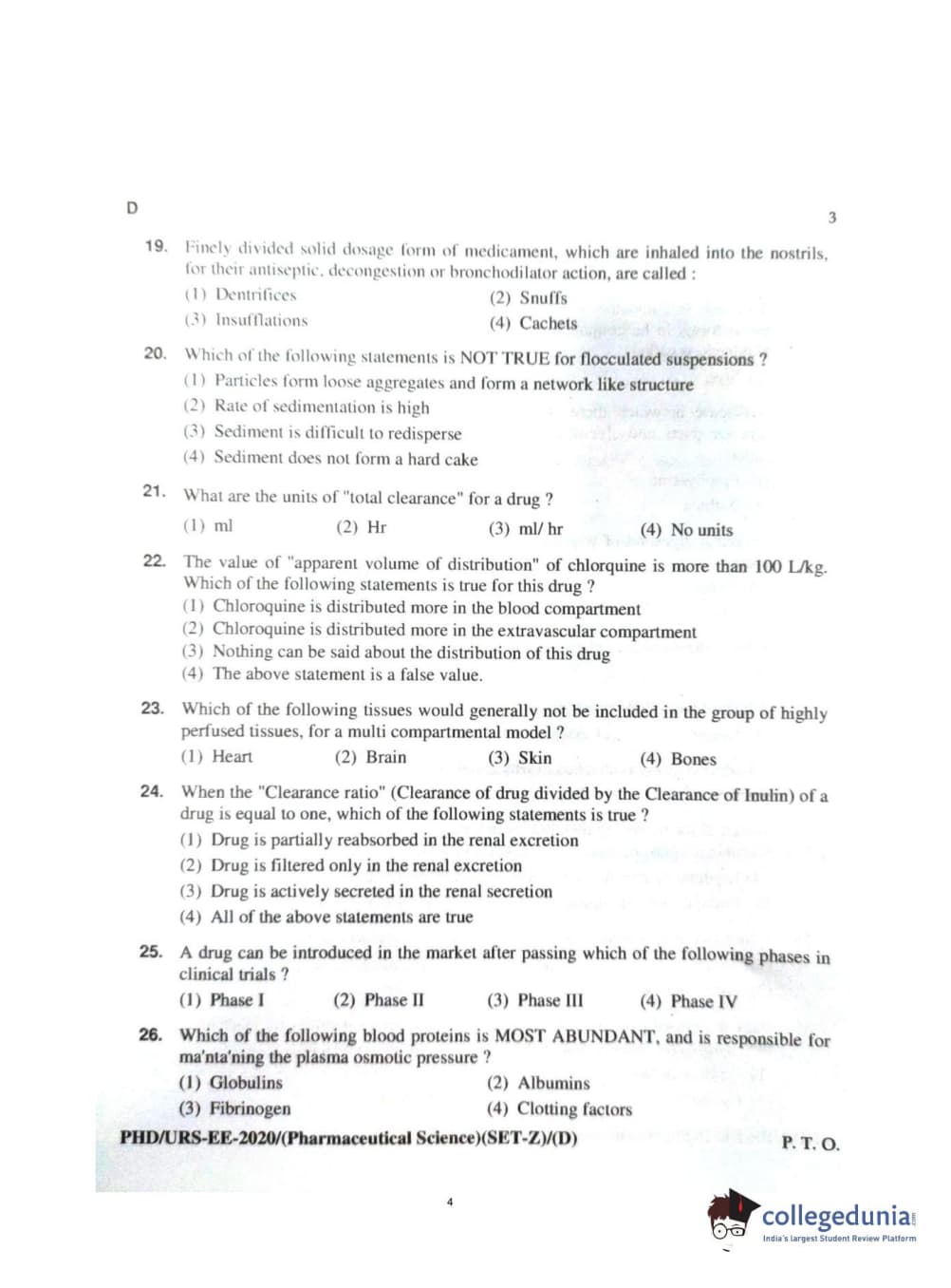 MDUCEE 2020 Ph.d. Pharmaceutical Sciences Set D Question Paper with Answer Key PDFs