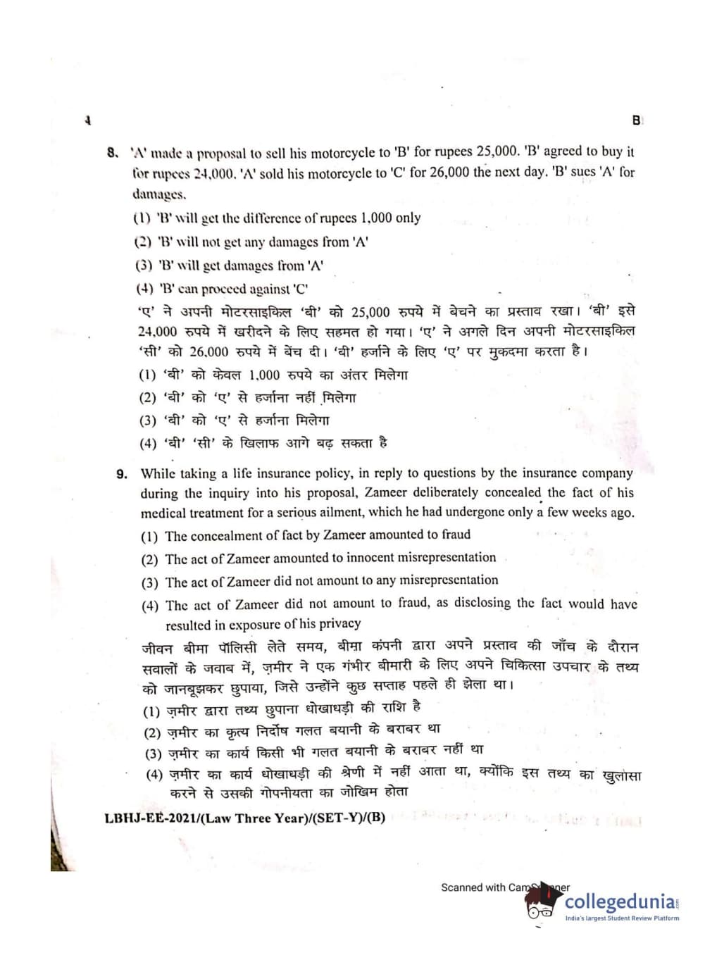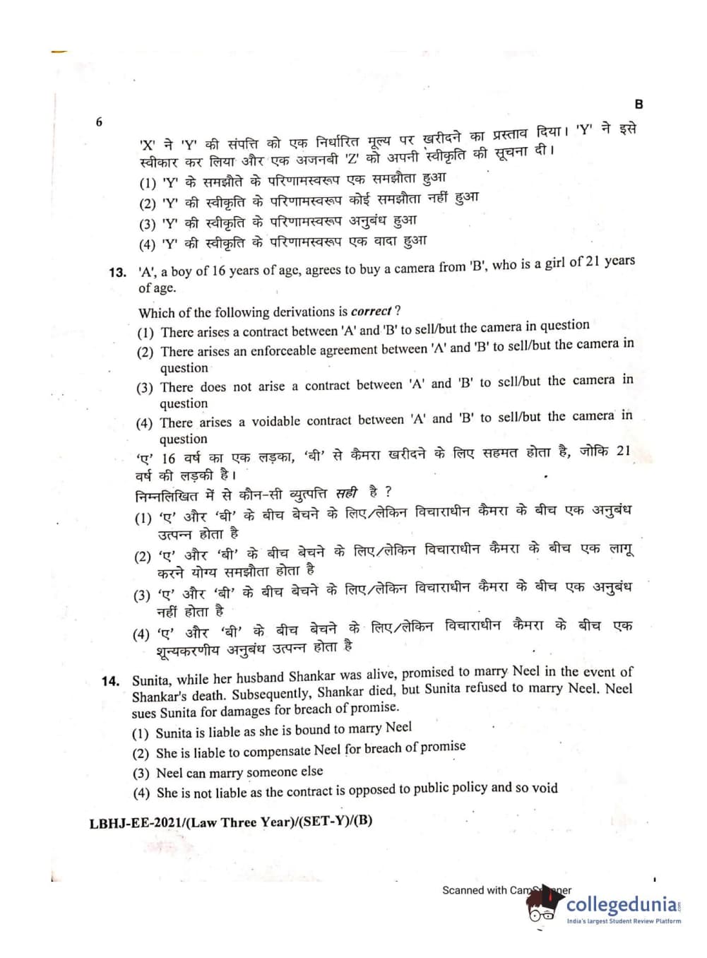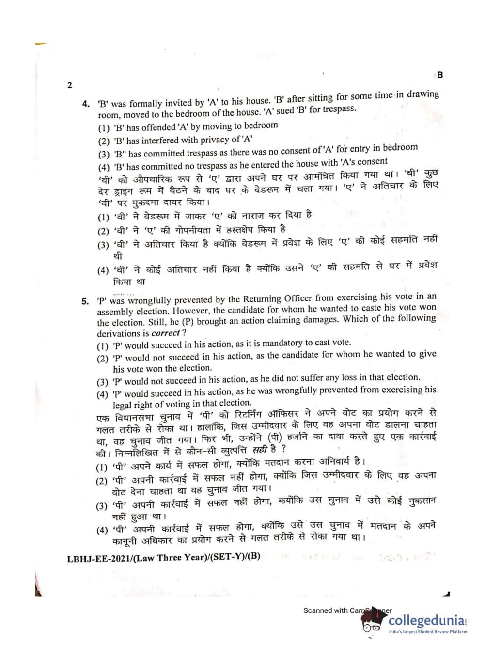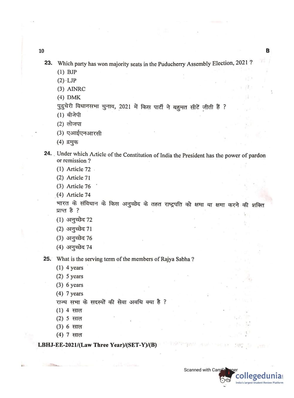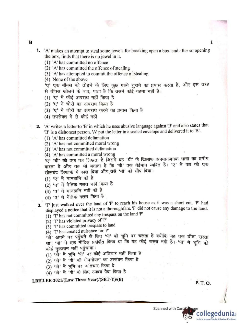 MDUCEE 2021 LL.B (Hons.)-3 Year course Set B Question Paper with Answer Key PDFs
