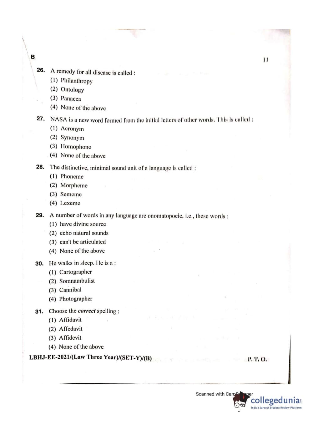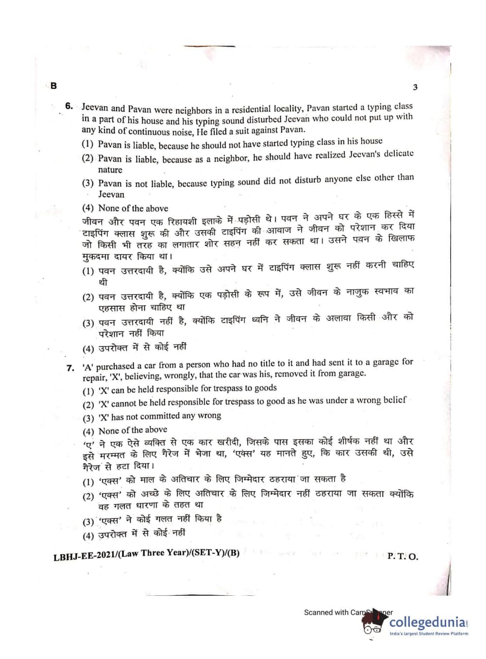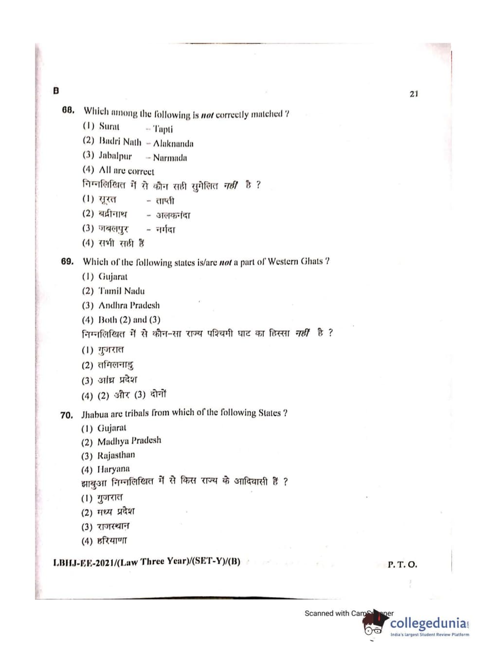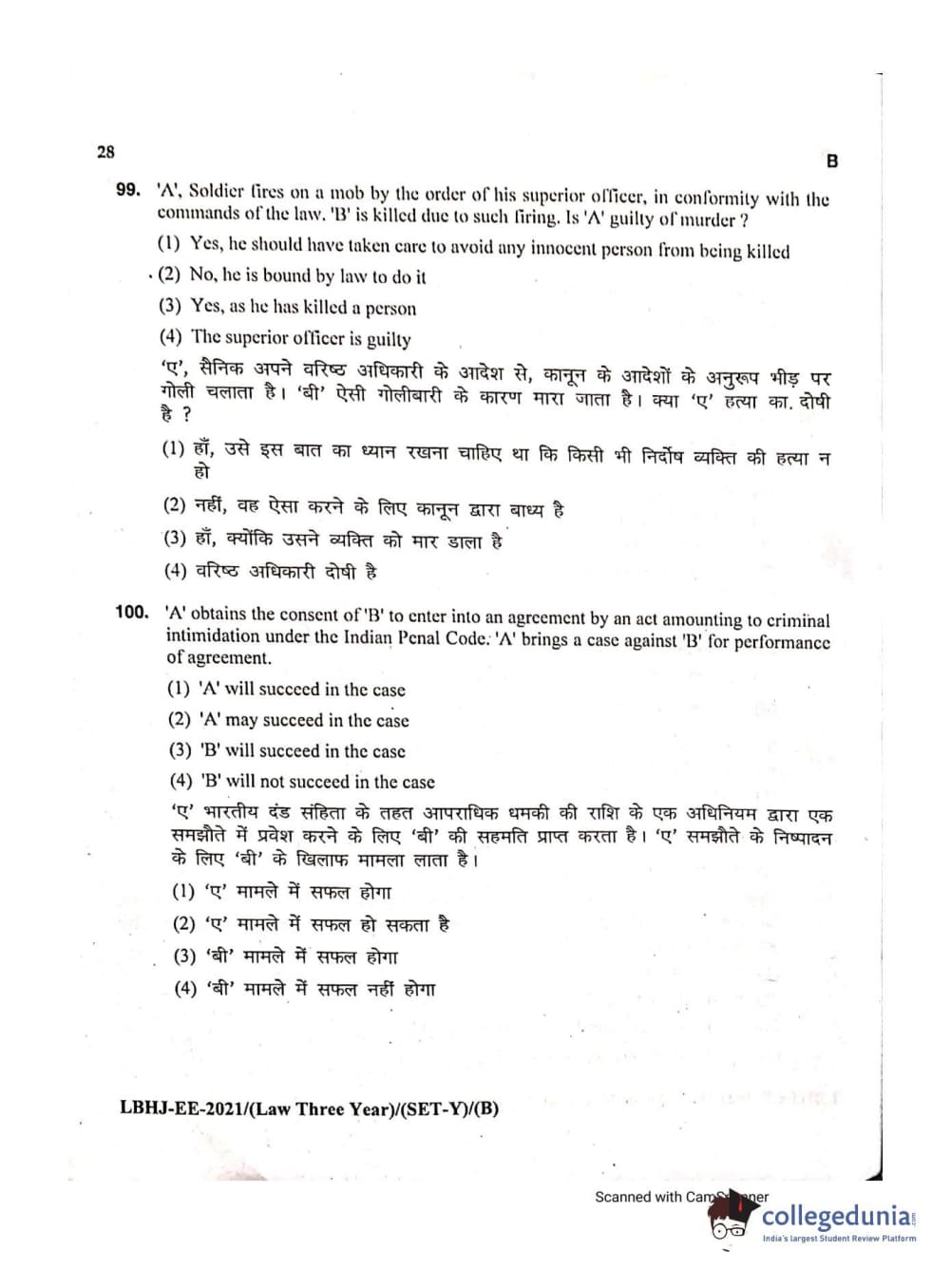 MDUCEE 2021 LL.B (Hons.)-3 Year course Set B Question Paper with Answer Key PDFs